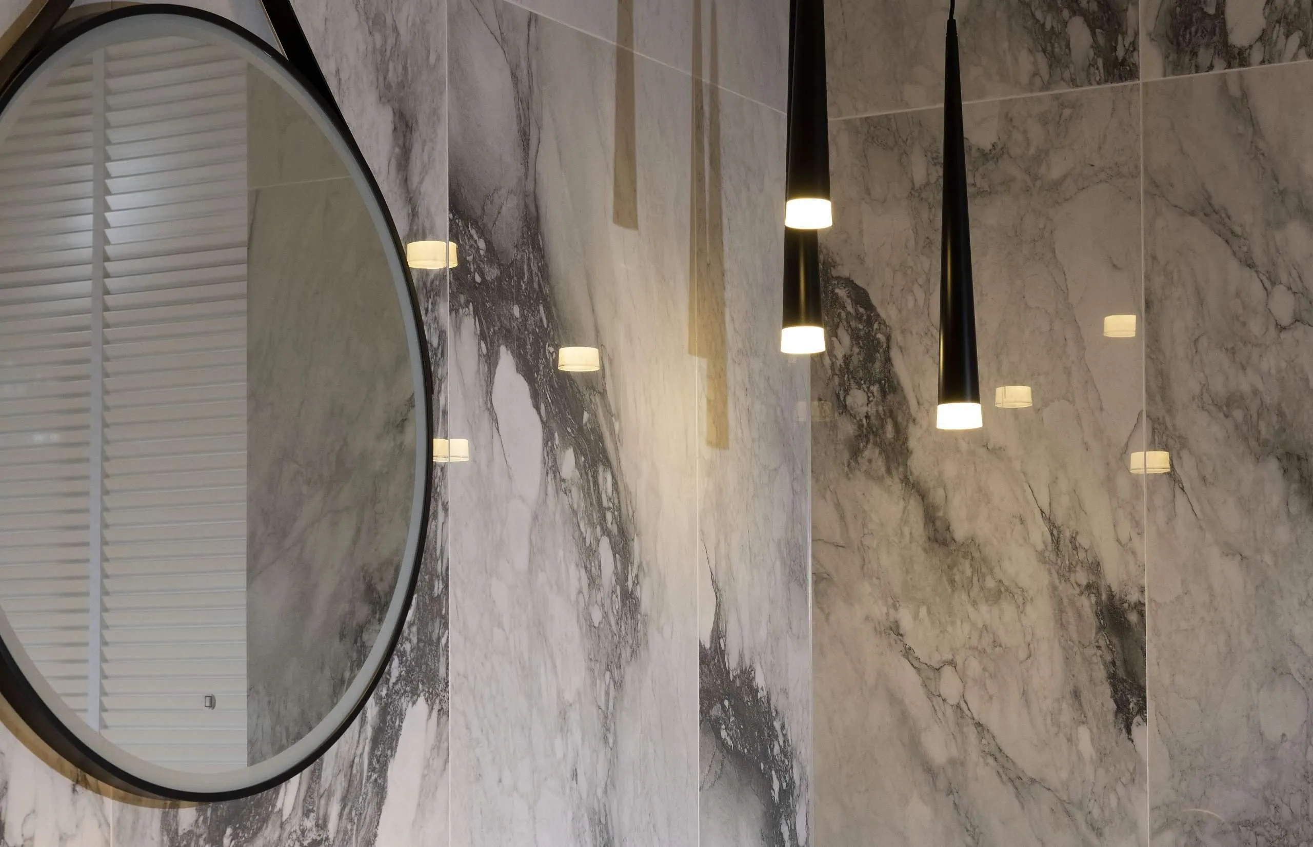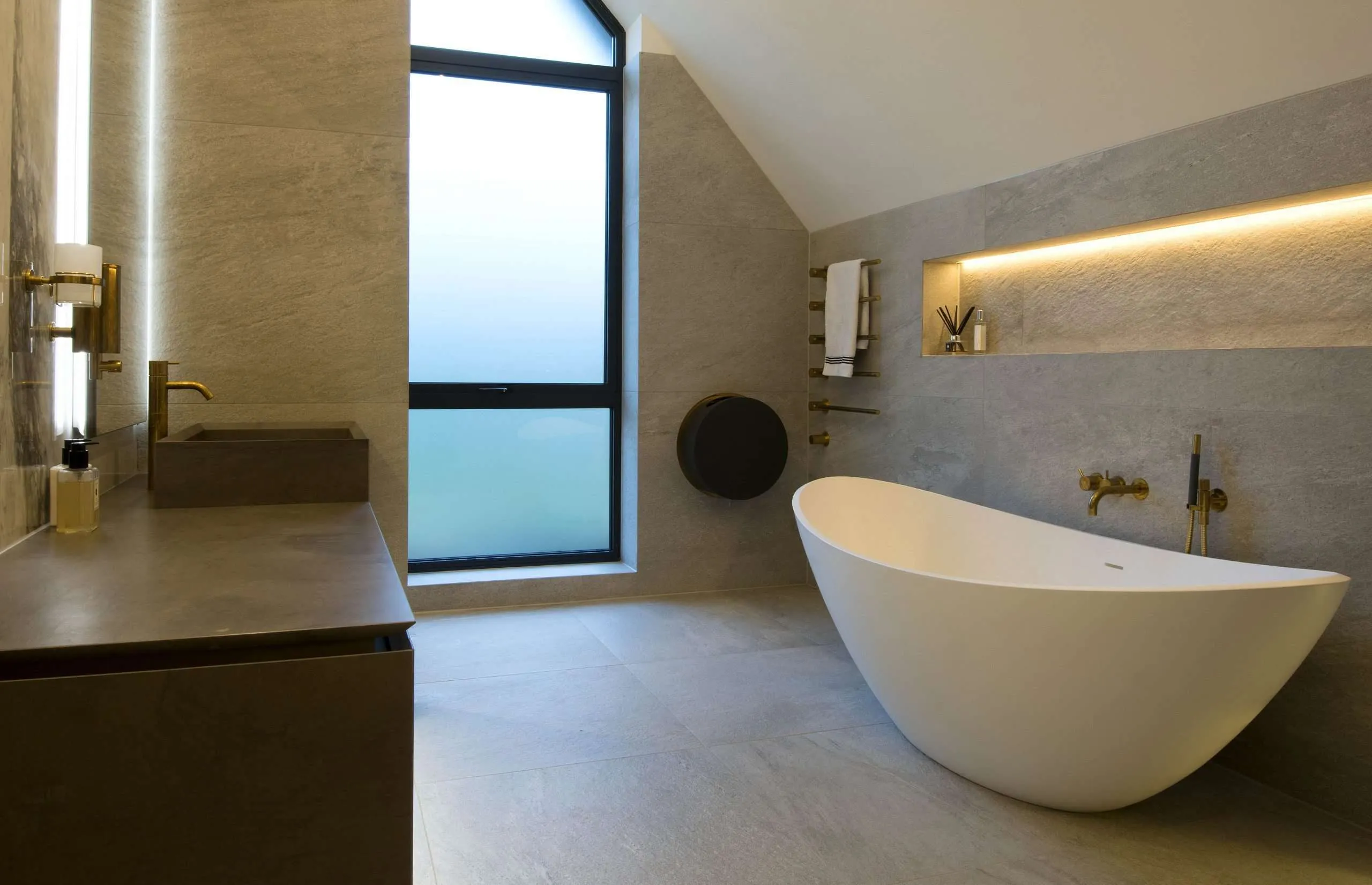 The floors and remaining walls were then lined in a softer more textured beola stone tile for a dramatic contrasting effect.