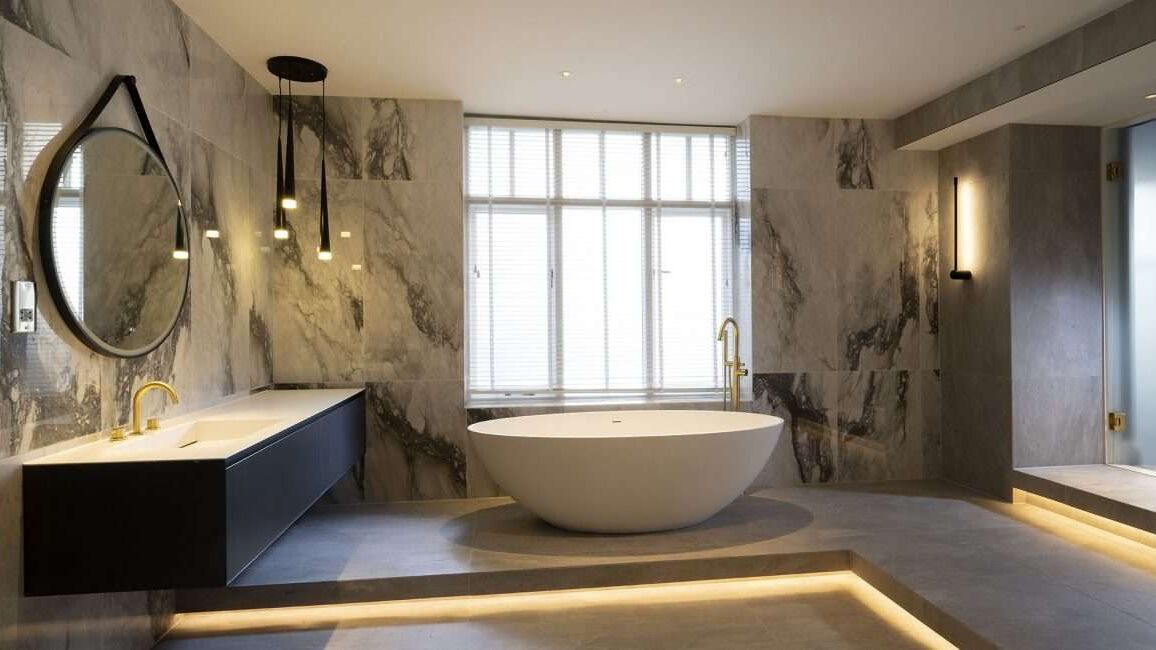 After expanding the entrance doors, the master bathroom suite was completely modernised to feel, as briefed, “like a luxurious boutique hotel” the entire space has been fitted with large-format, marble-effect ceramic tiles, discrete LED mood lighting as well as a refit of the shower/steam-room and WC.