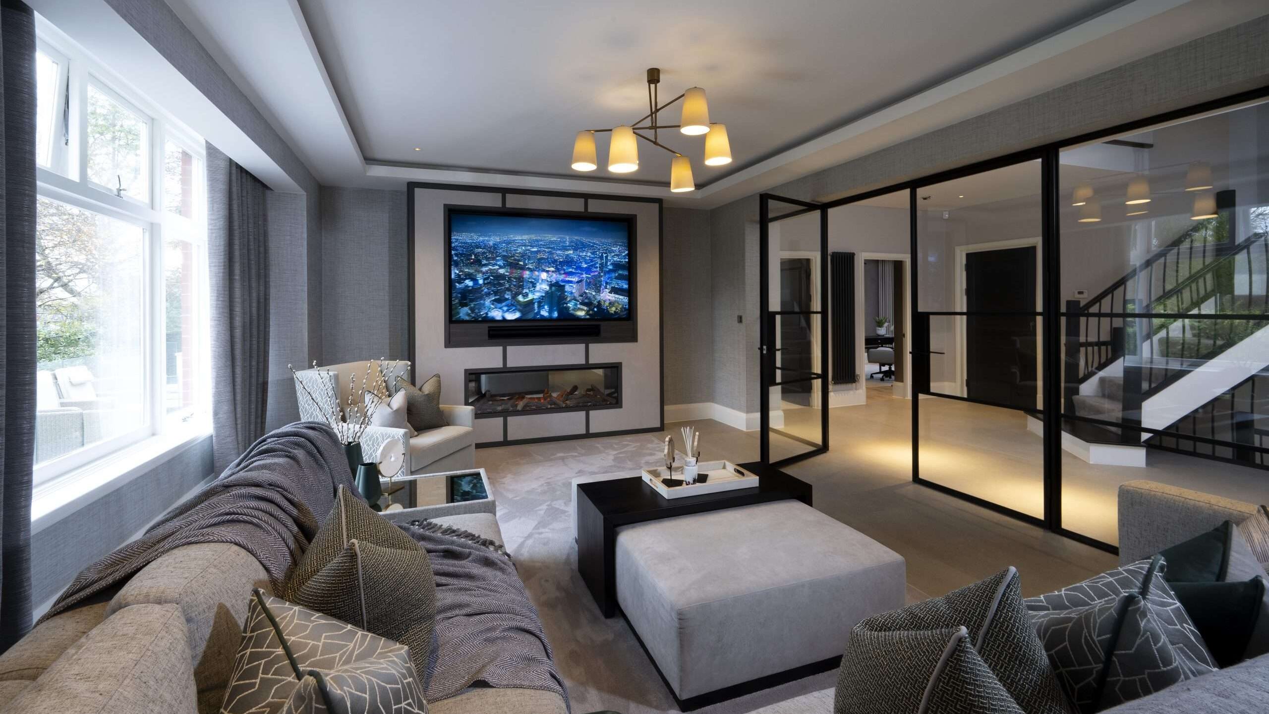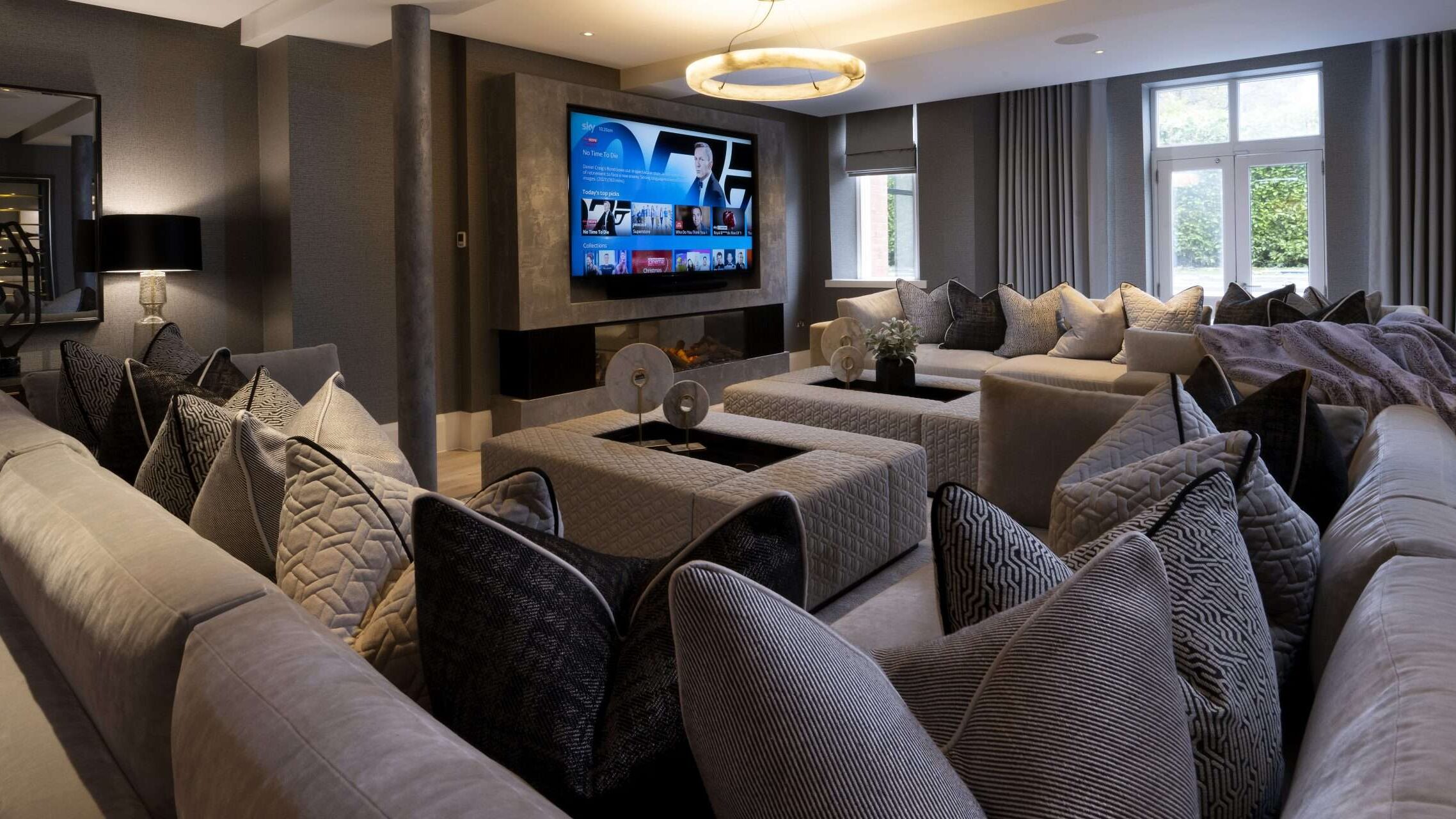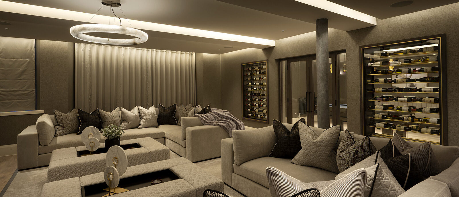 We divided the large room in two, one side being a dedicated relaxing media space with flexible mood lighting, multiple large corner sofas creating a social yet cosy atmosphere -see the Before/After below. The bespoke media unit is the rooms central focus finished with a metallic polished plaster surround, as well as containing a ribbon fireplace edged with thinly ribbed ebony wood panelling.