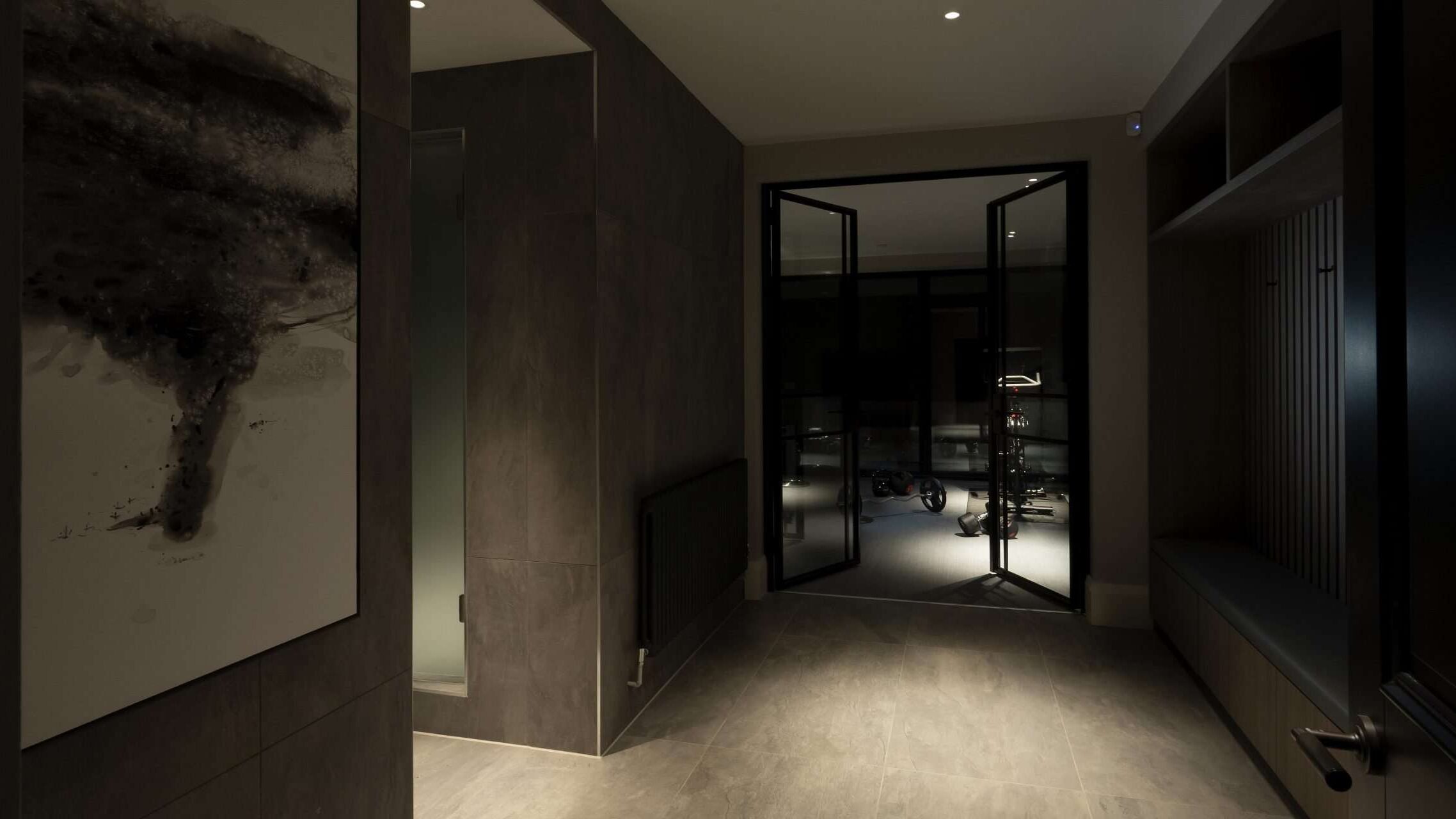 The orangery is enclosed by additional crittall glass partitions which creates closed off zones whilst still allowing natural light through to the surrounding areas. Directly beneath this the extension provides extra leisure space for a newly appointed gym.