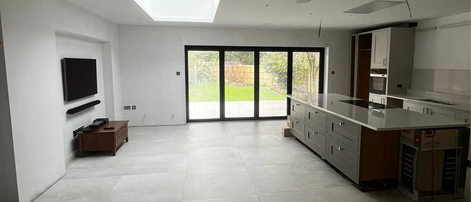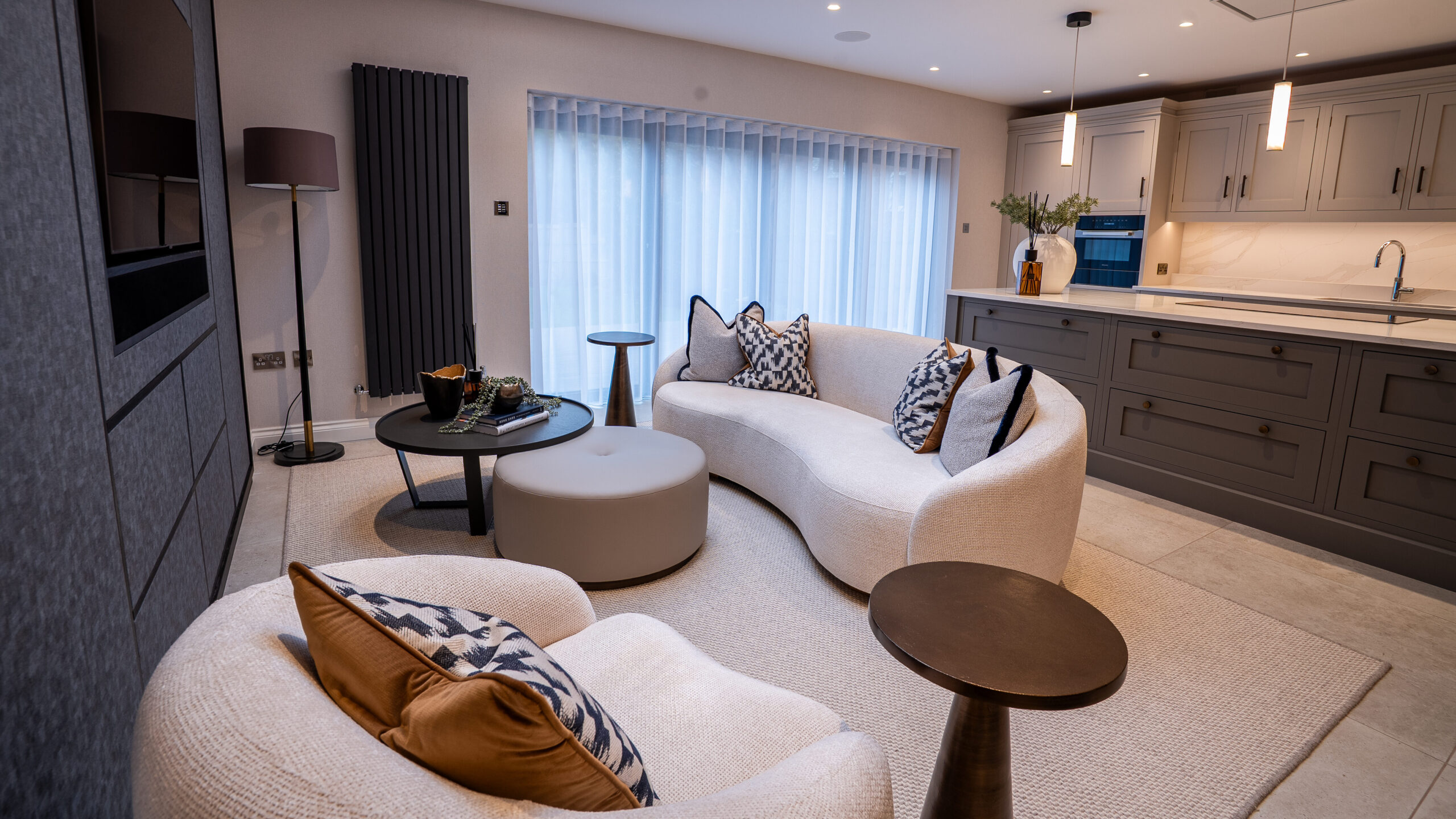 The day living area was designed as a relaxed and informal zone, supporting everyday comfort and connection within the open-plan layout. A key feature is the bespoke media wall, formed within the newly built dividing wall that separates it from the sitting room. Making use of a natural recess, the design was carefully developed to sit seamlessly within the wall’s depth, creating a clean, integrated finish.