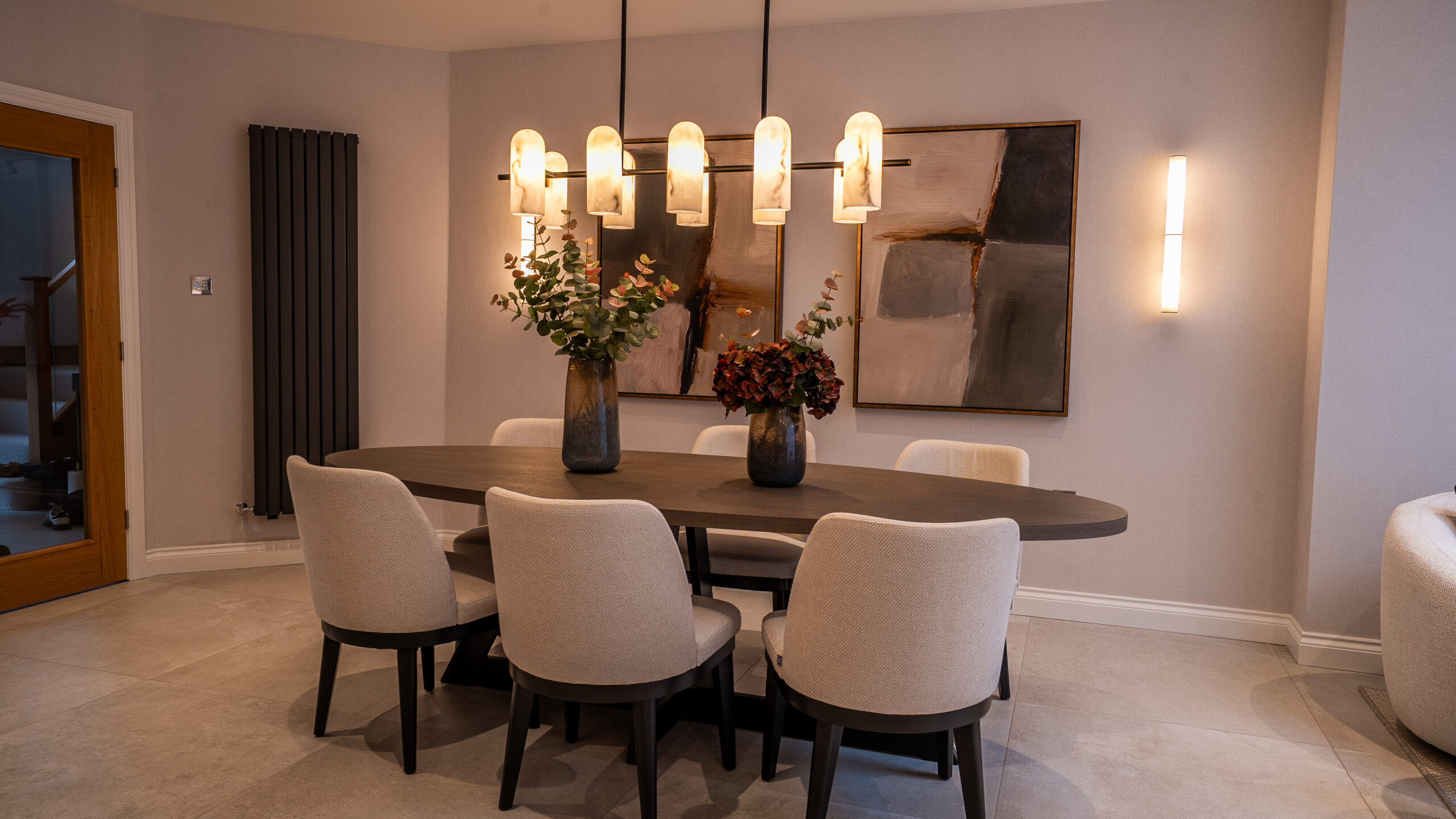 The dining space was conceived as a setting for both everyday meals and more formal gatherings. We sourced all elements within the scheme, from the dining chairs and statement lighting to the wall art and decorative accessories, carefully curating each piece to bring depth and cohesion. Once an empty area lacking identity, it has been transformed into a space with warmth, character, and a strong sense of purpose.