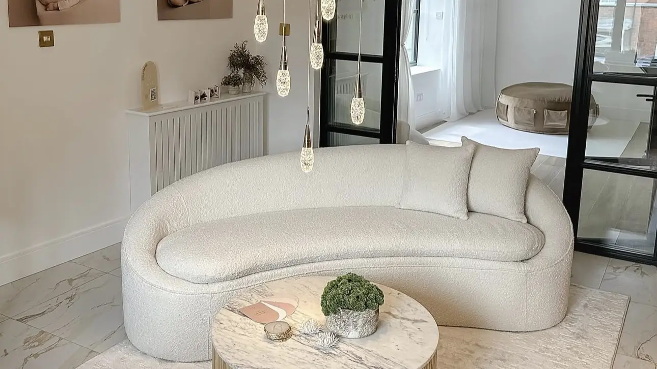 The main area of the studio exudes soft, organic comfort with its sculptural boucle curved sofa and warm, neutral palette. The glowing pendant lights cascade delicately overhead, adding a dreamy atmosphere. With portraits of newborns on the walls and natural light flooding in through black-framed glass doors, this space perfectly reflects the studio’s focus on capturing timeless, tender family moments in a refined yet approachable environment.