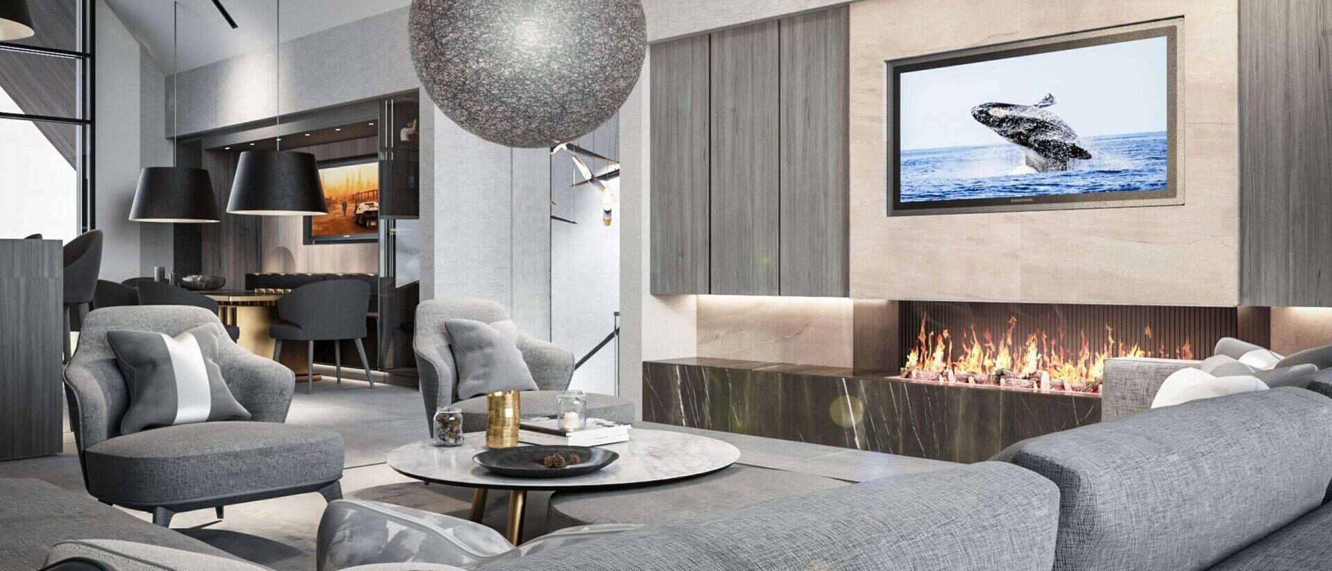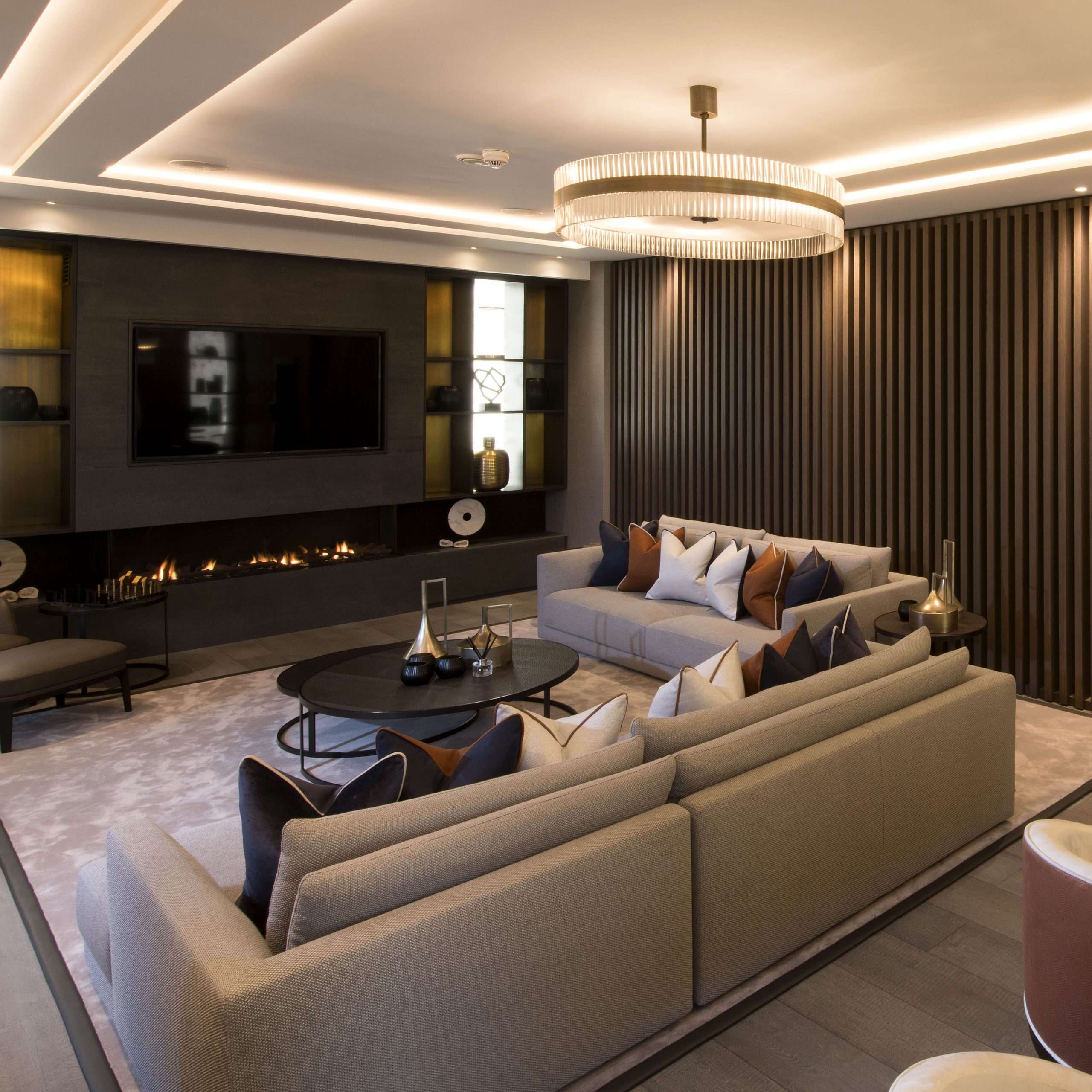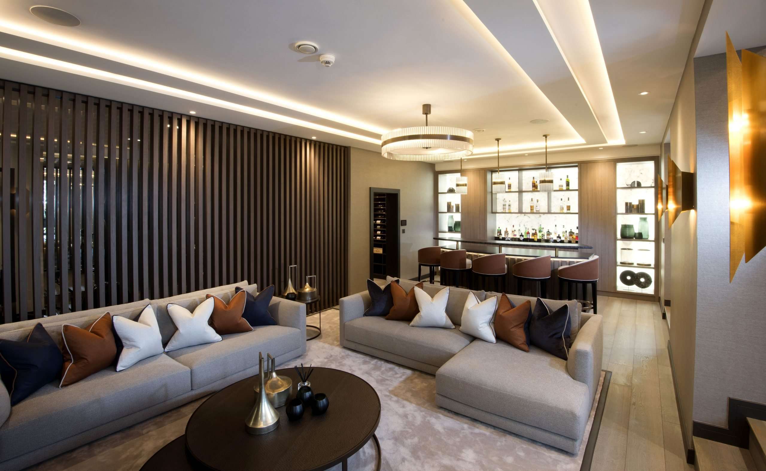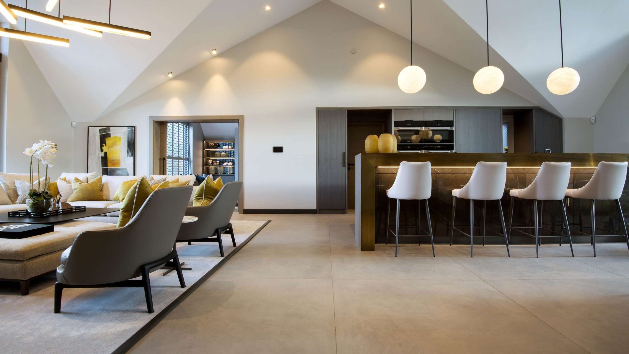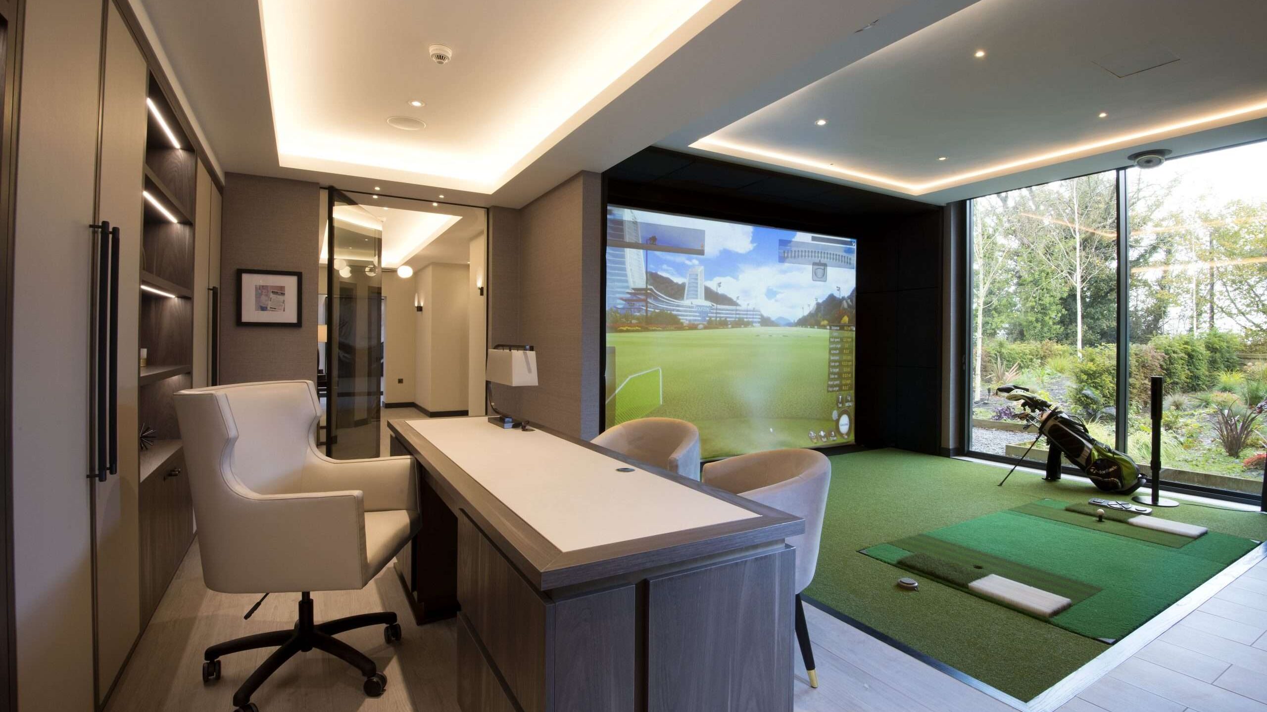The ground floor feels more like a lower floor but has the advantage of natural light and plays host to a home office with an incredible golf simulator, a bar, a gym, a cinema, as well as a private guest suite including two bedrooms and a lounge.