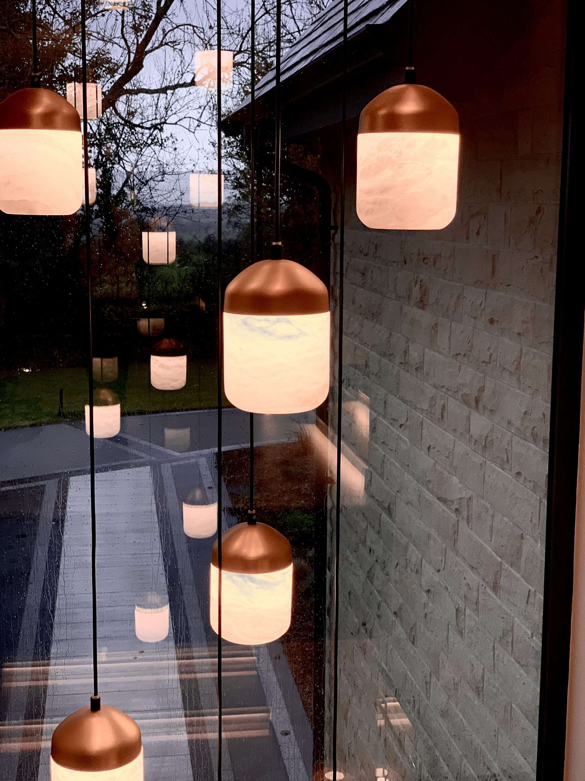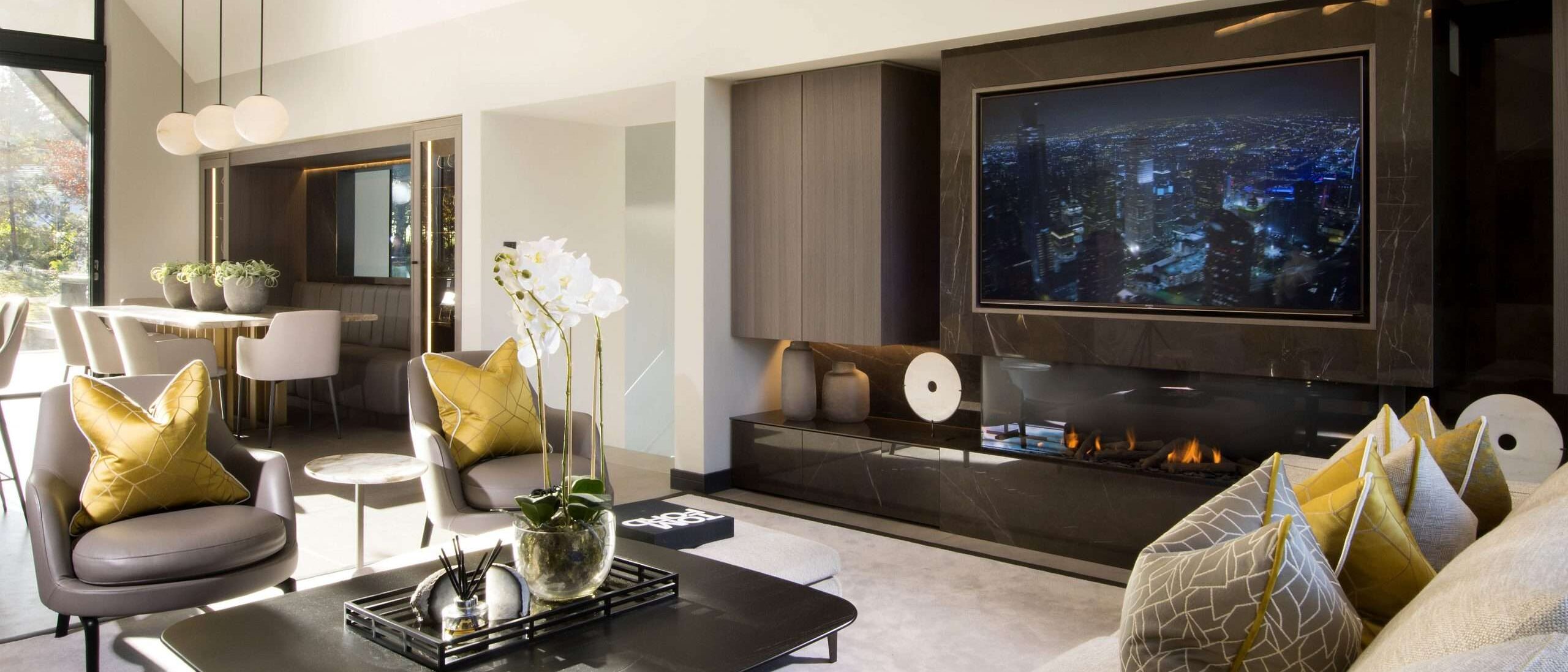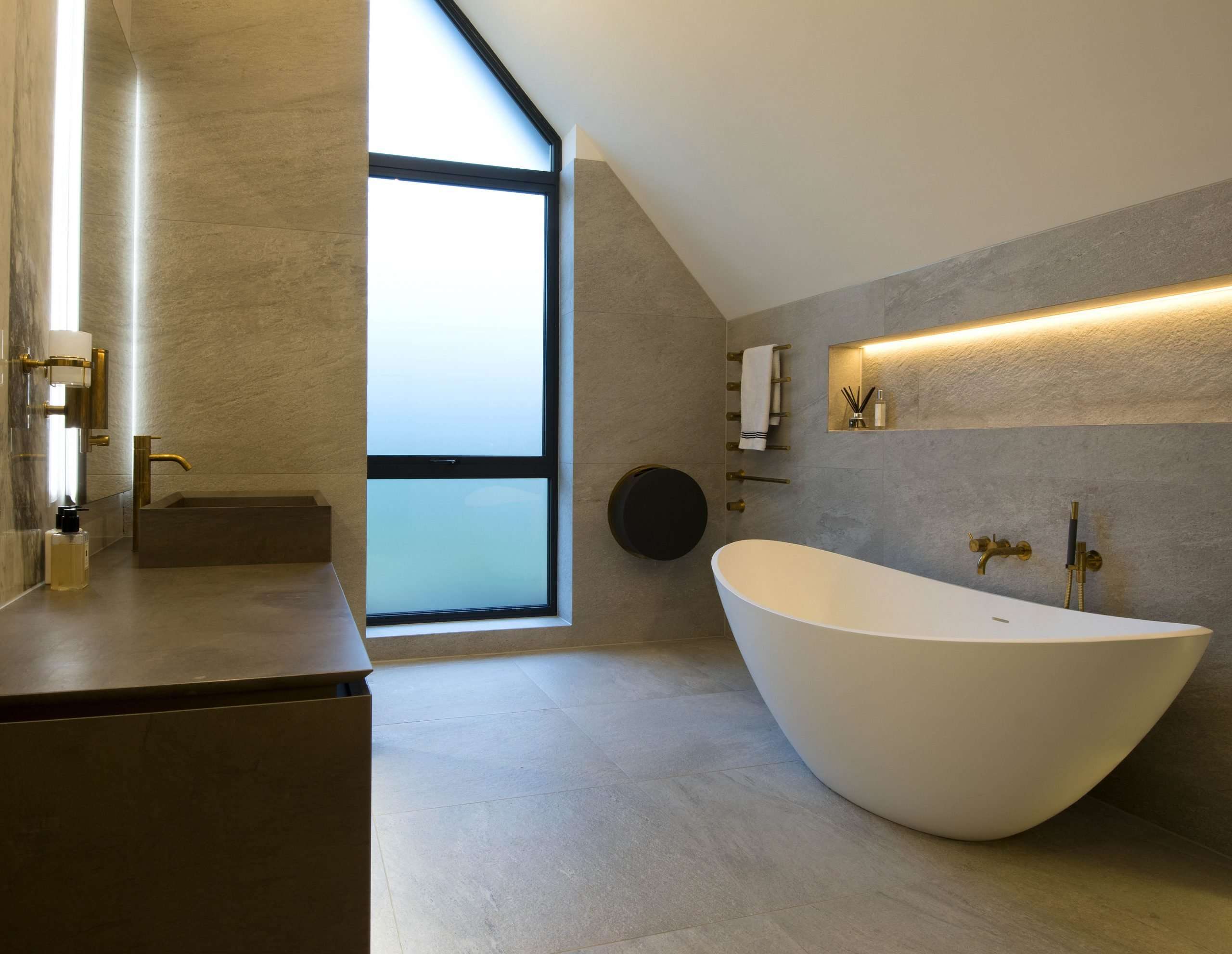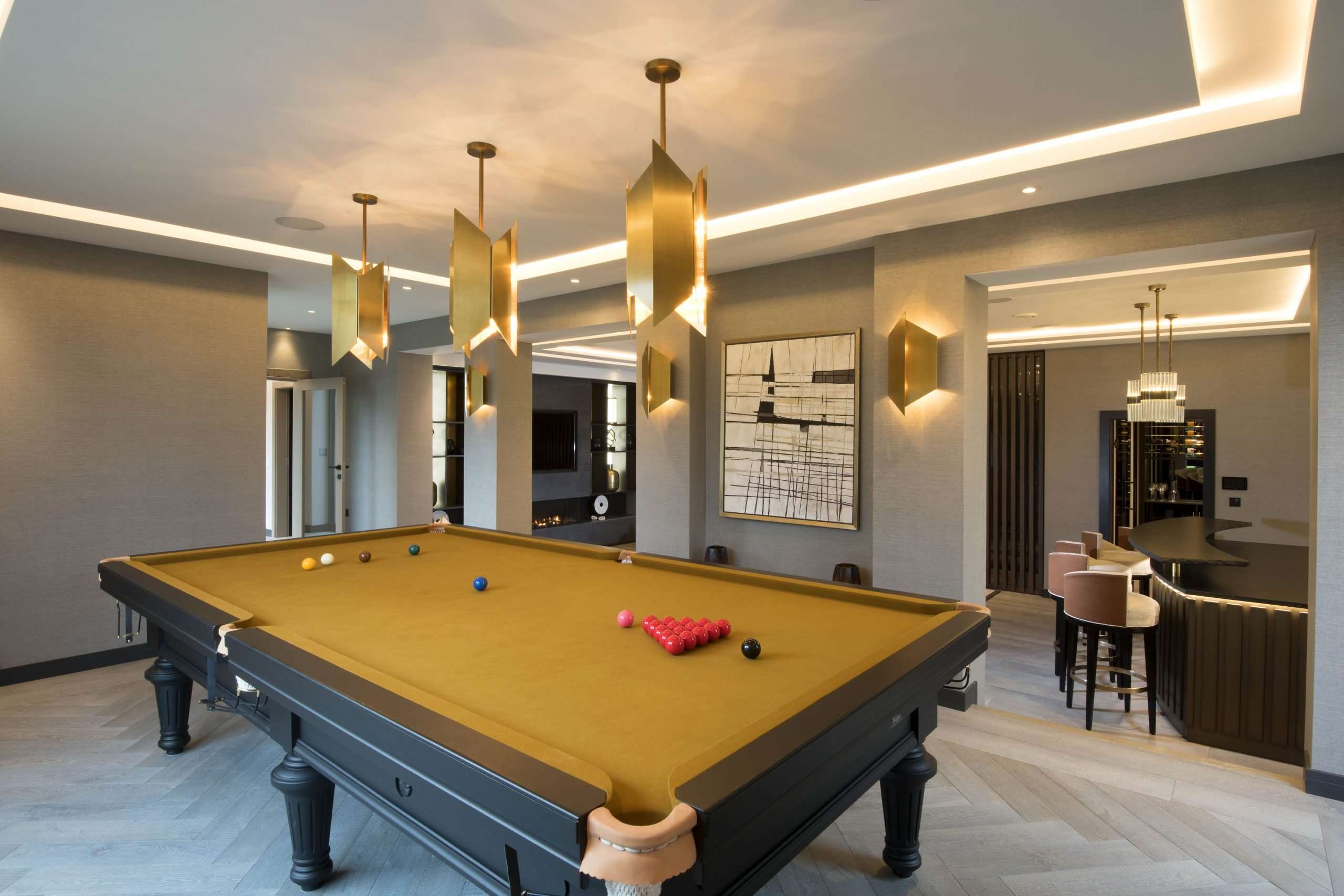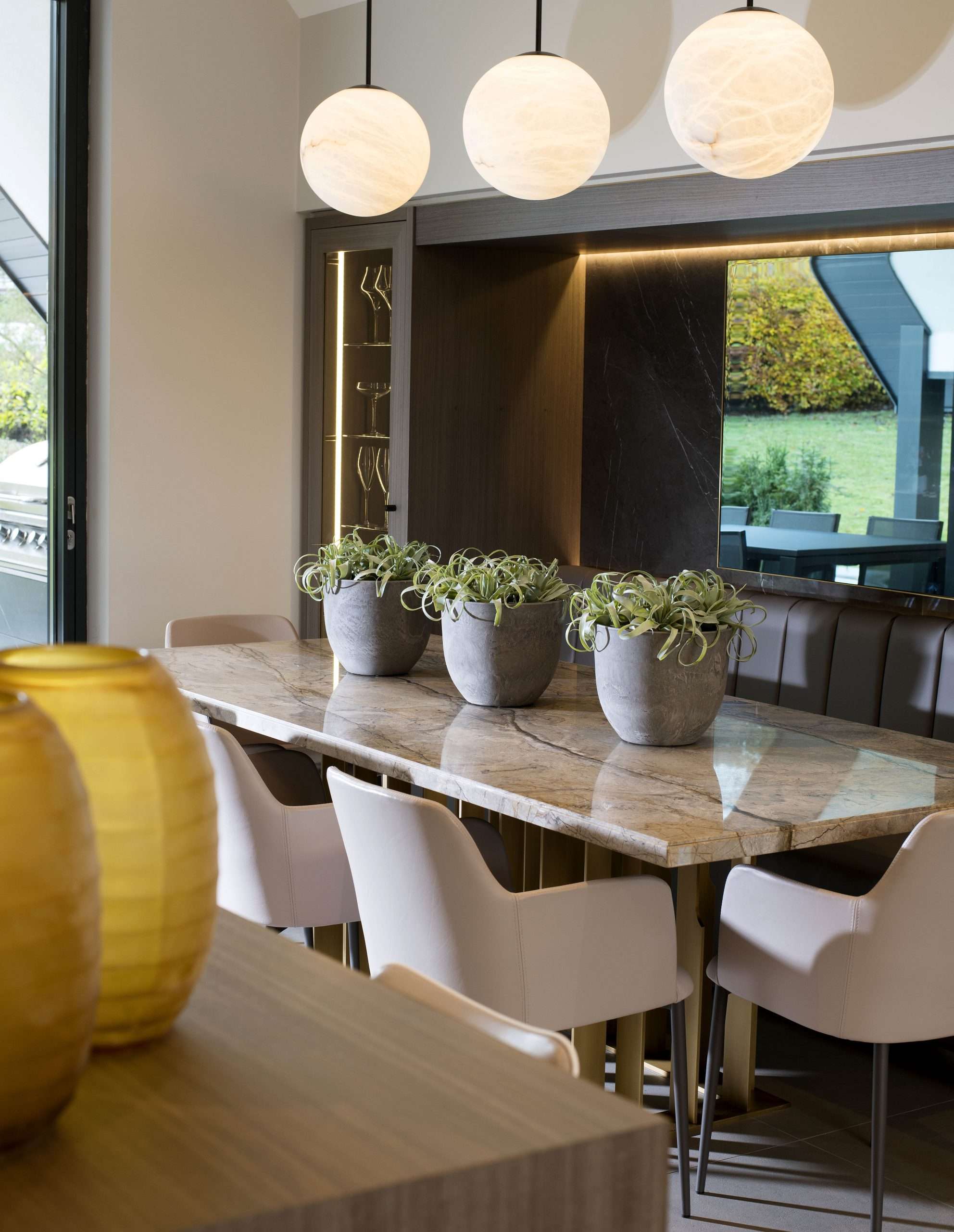 Lighting sets the mood from the very first moment you enter the house. Concealed lighting highlights feature artwork which is mounted on large format tiles. A feature wall of silver antique mirror panels with laser-cut brass fretwork detail and an inlaid antique brass frame trim which is also backlit with LED illumination for a stunning halo effect.
