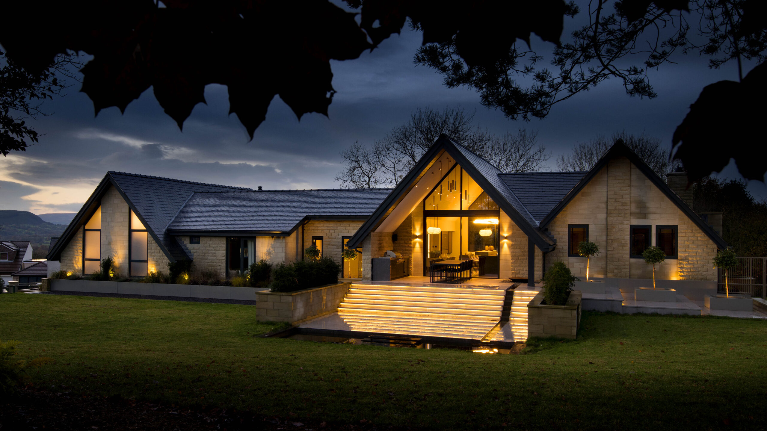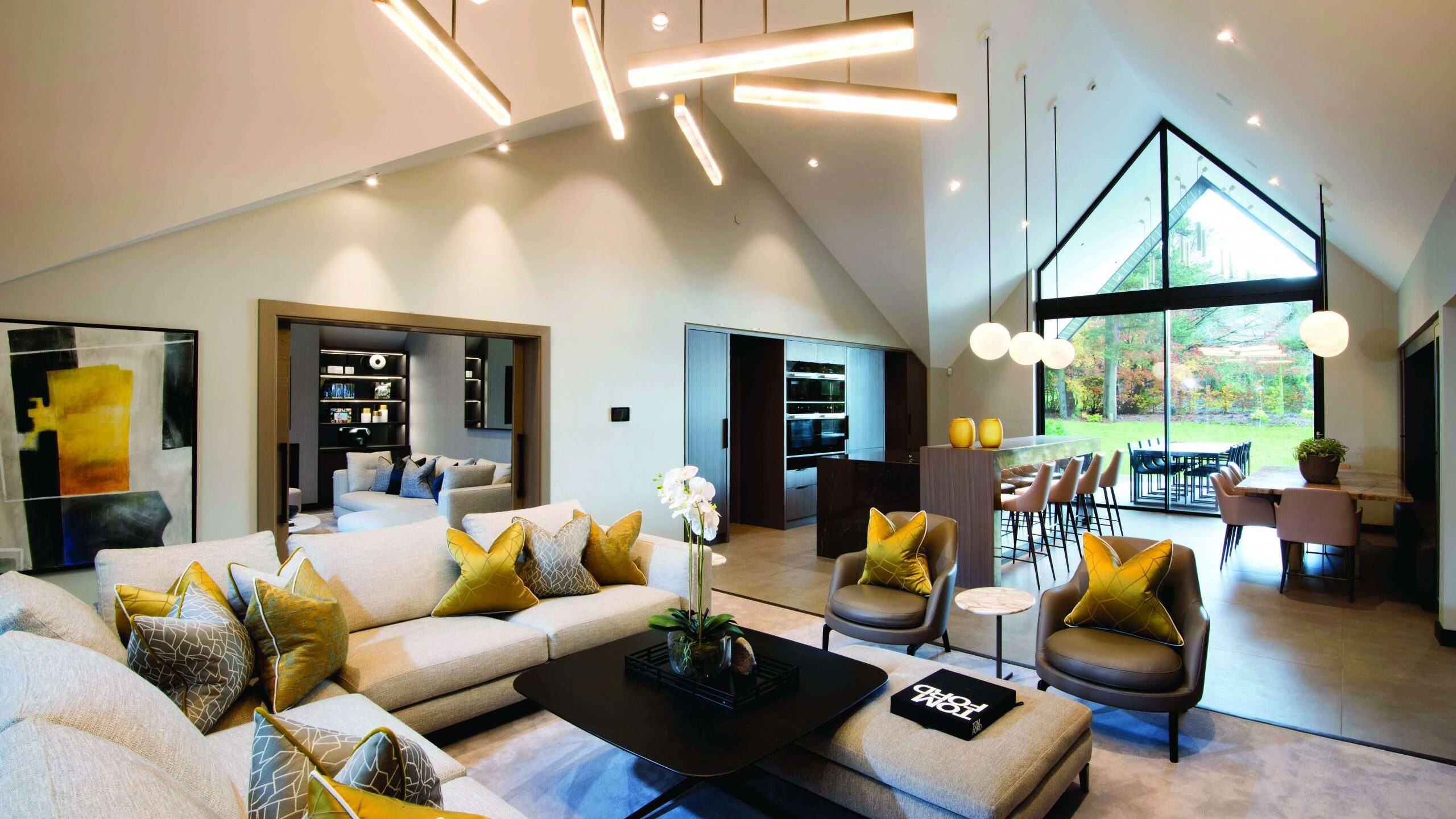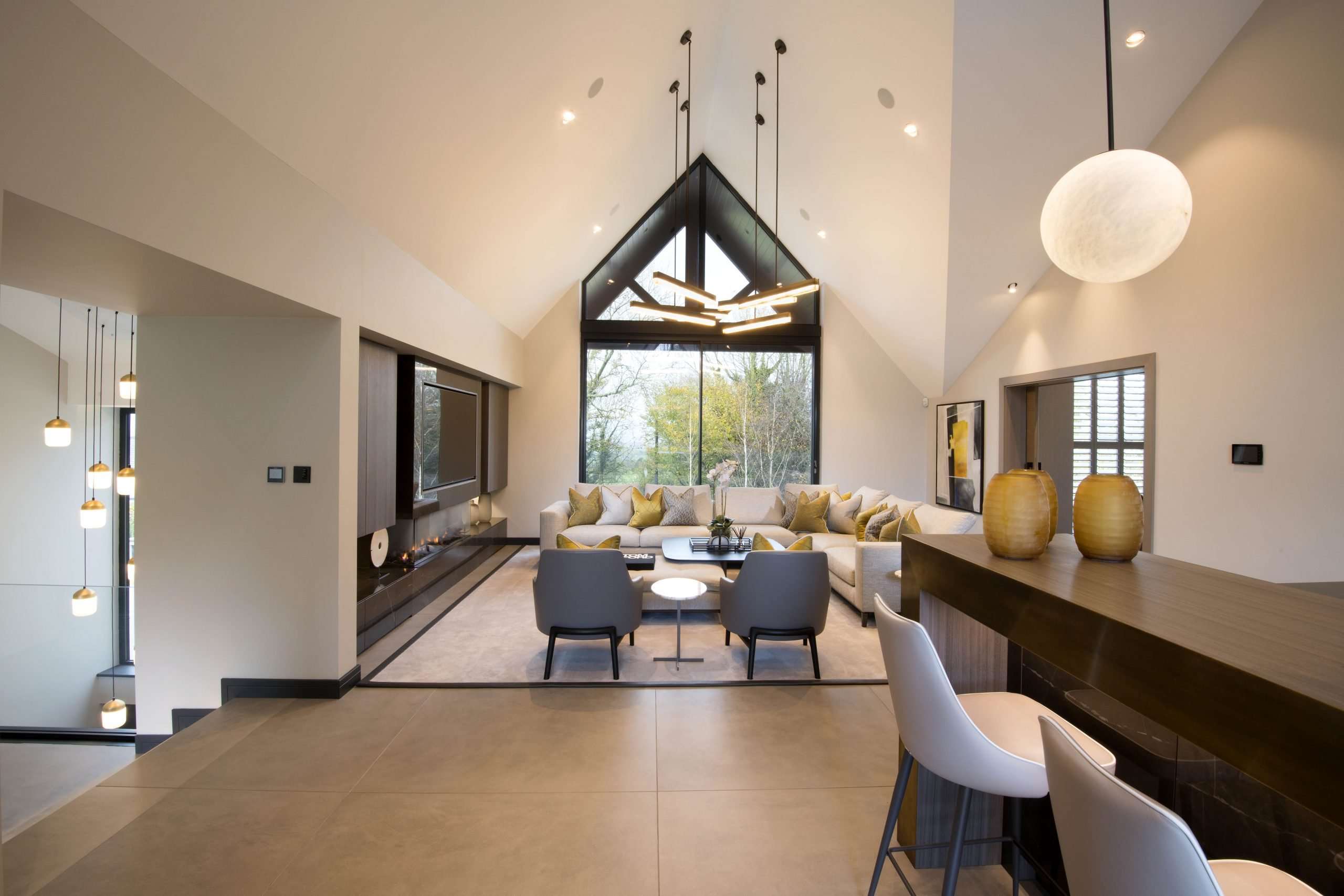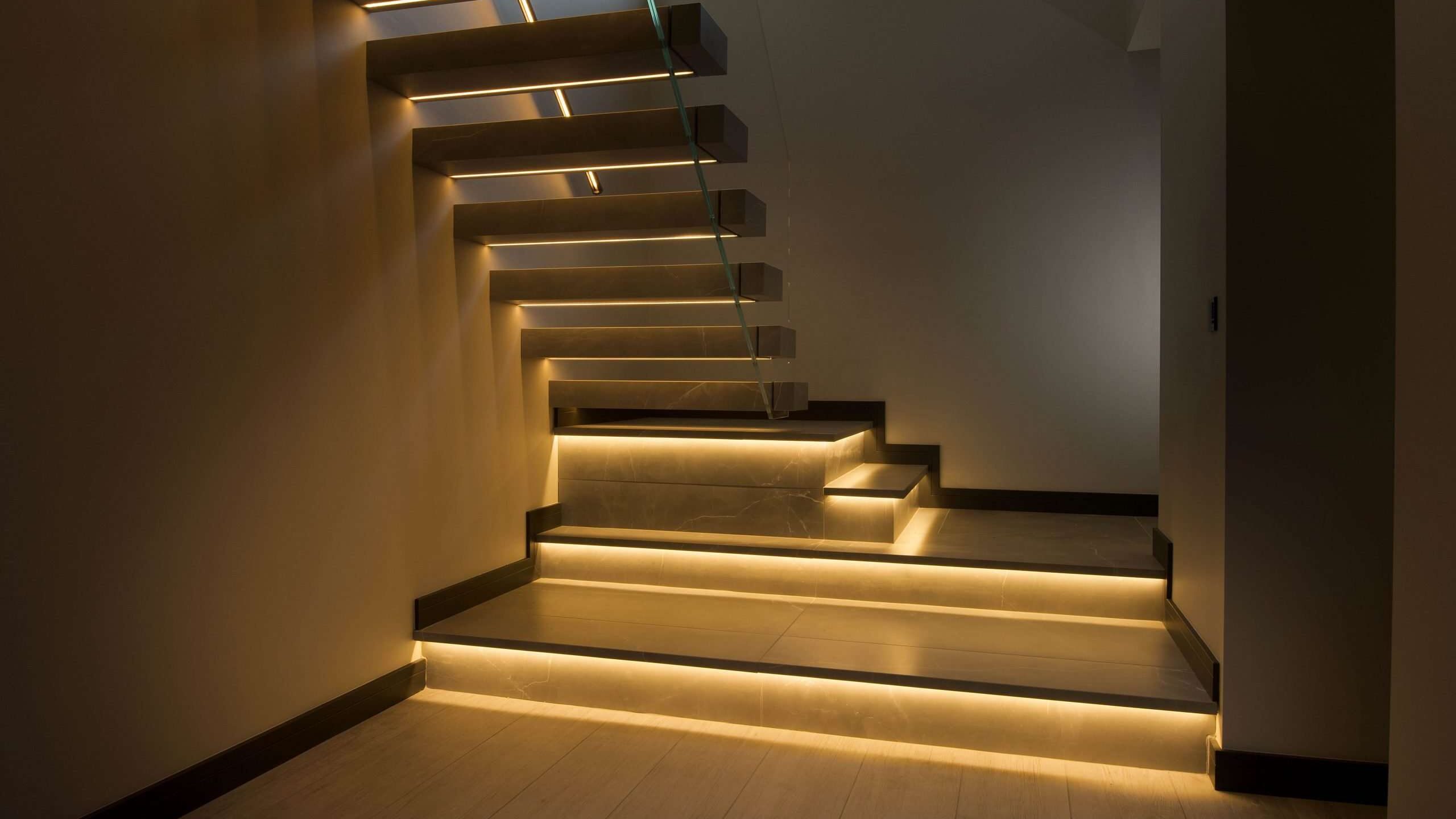 When entering the property, the eye is instantly drawn to the staircase with illuminated tread lighting. This in turn leads up to a sky bridge with concealed lighting which connects the entertainment and bedroom areas.