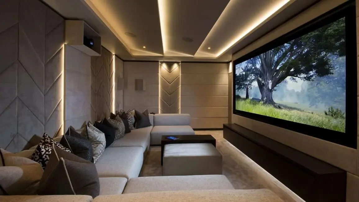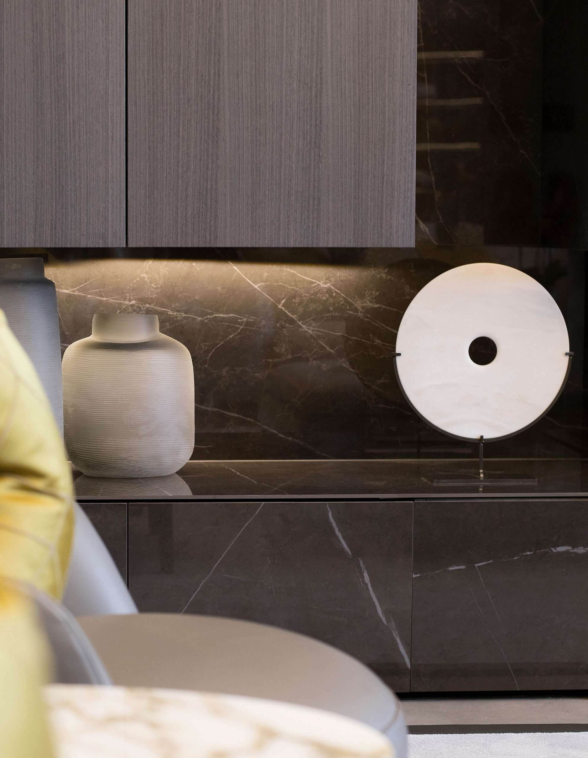 The art of textured layering is one of the key elements that elevate a design from simply good to truly stunning. For example, the visual impact of stone effect panels flanked by faux leather combined with illuminated timber shelves in dark grey stained oak is magnificent.