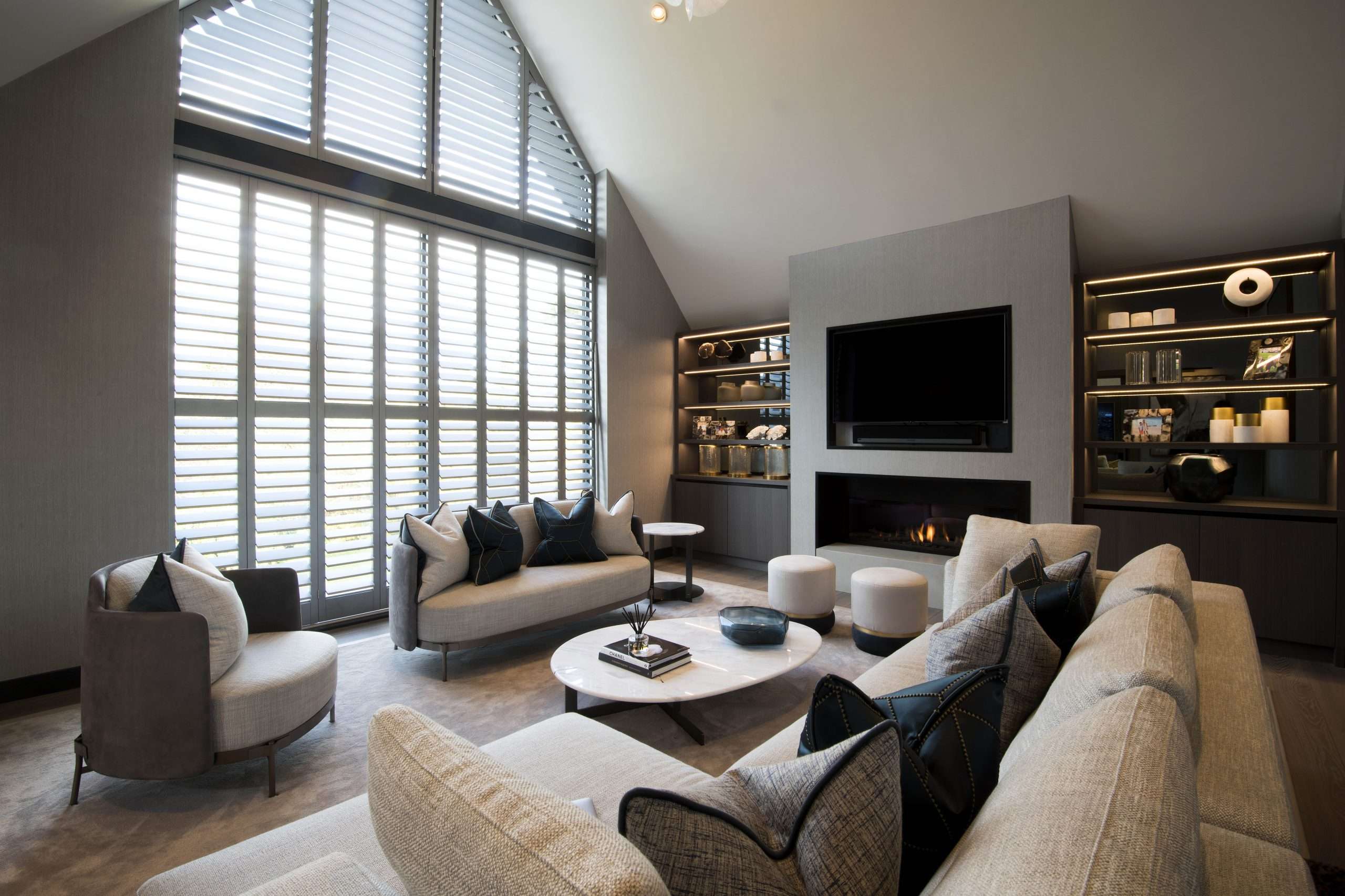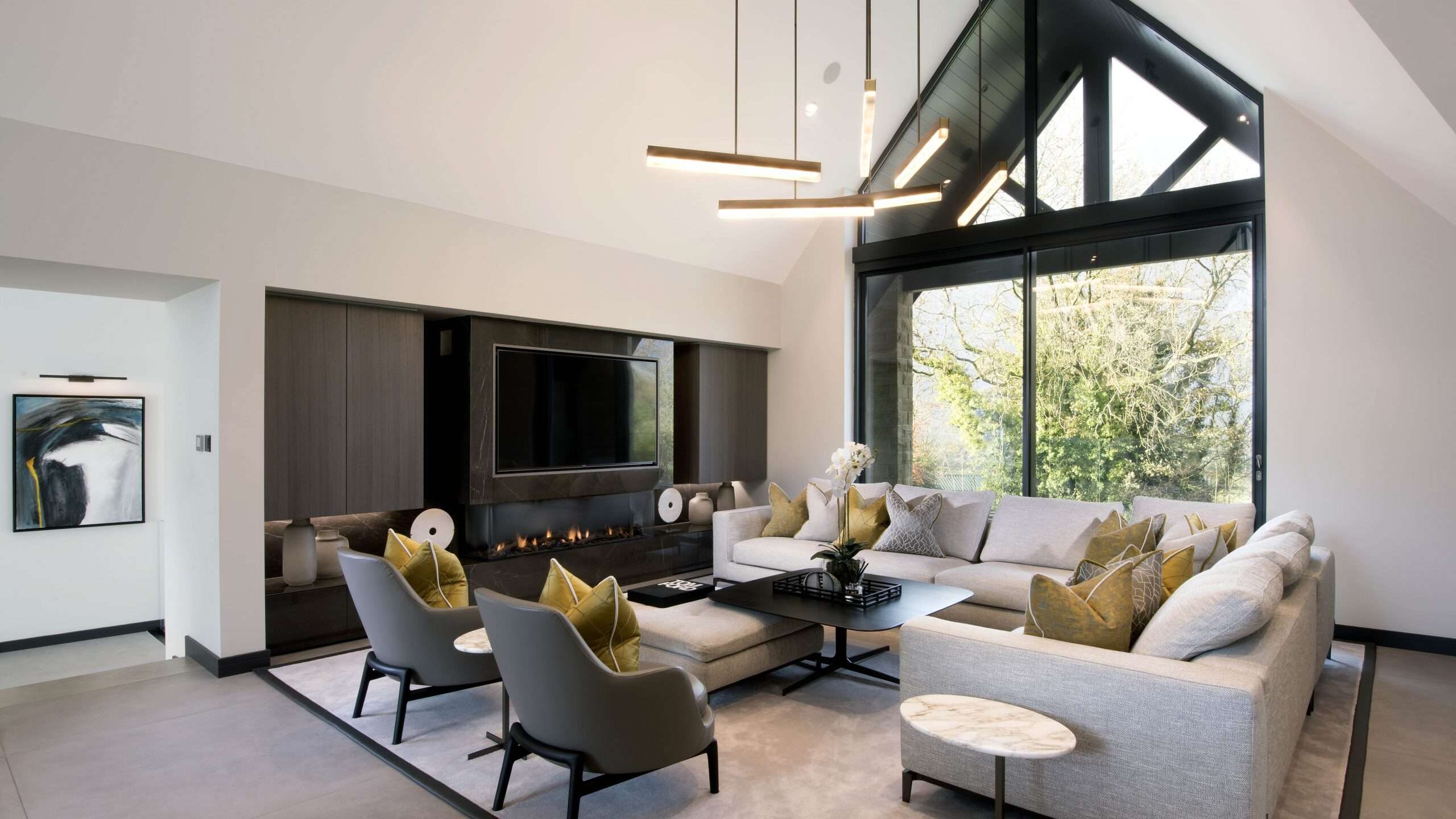 The family room speaks of unassuming style with a backlit stone effect central panel above a ribbon gas fire and illuminated dark grey stained oak shelves with a rear panel in antique bronze finish.