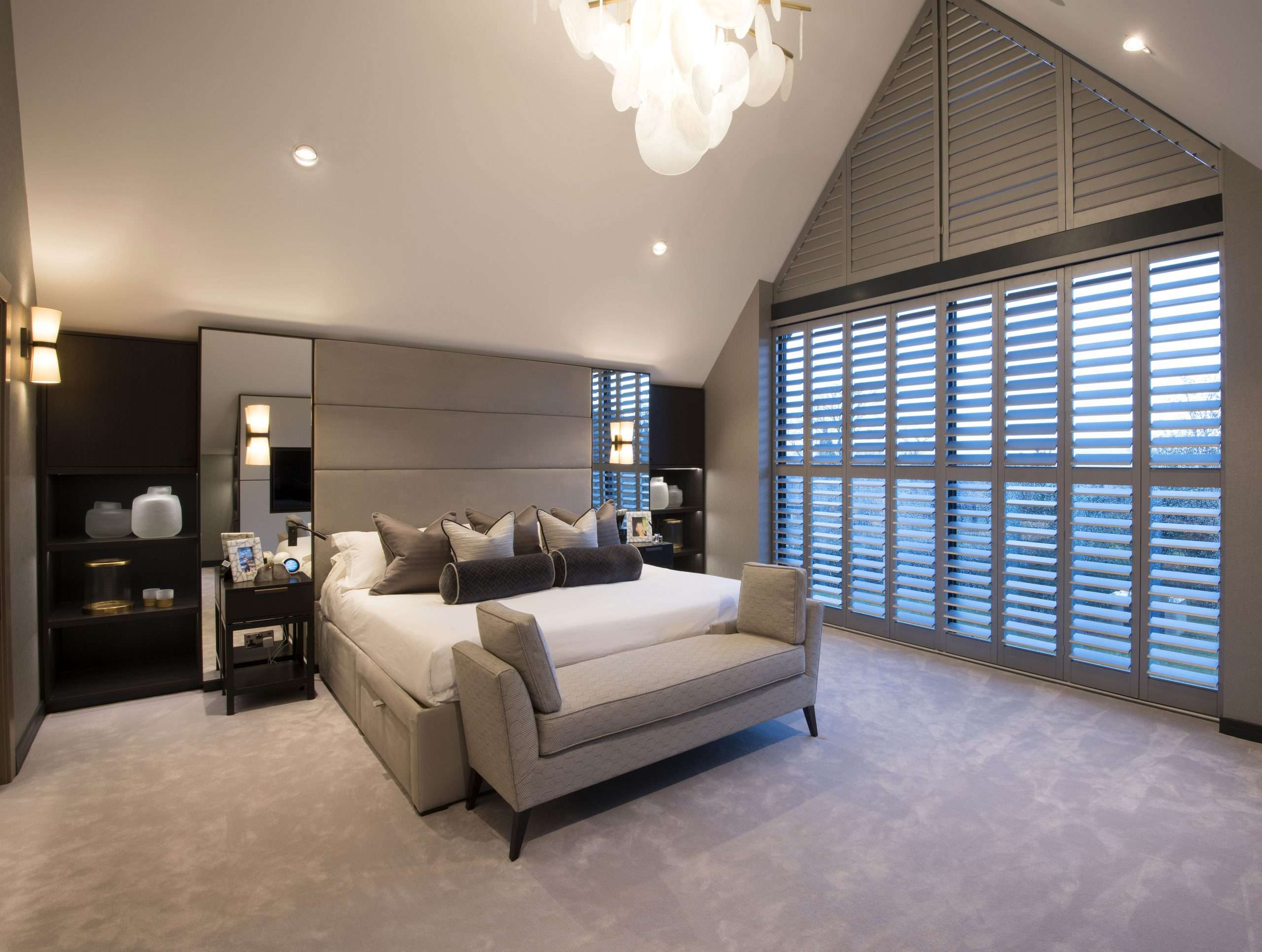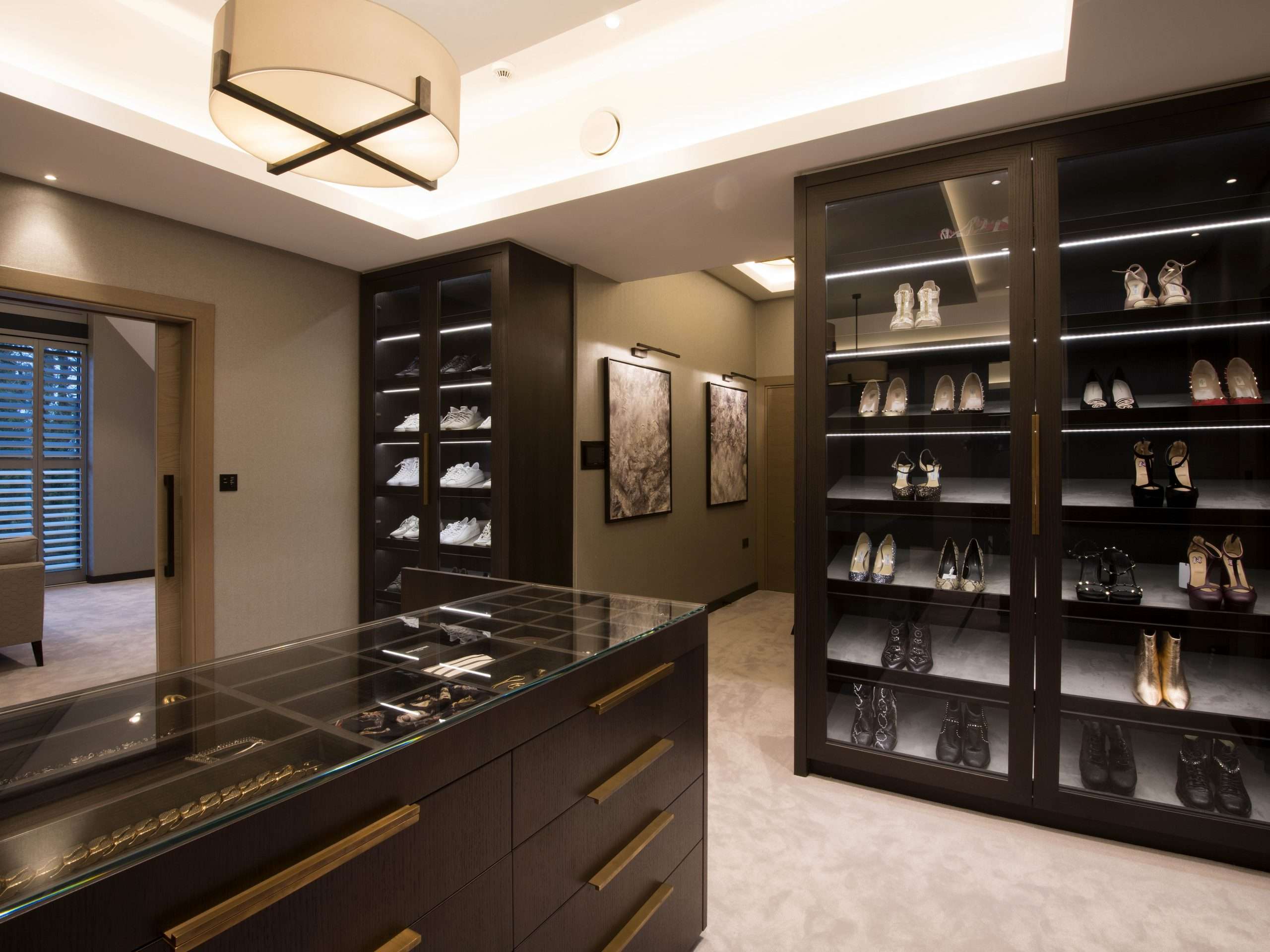 Bespoke cabinetry is used to exquisite effect in the master dressing rooms where full-height shoe display cabinets take pride of place around a display island drawer piece. Designed with illuminated angle shelves, designer footwear is exhibited to maximum effect.