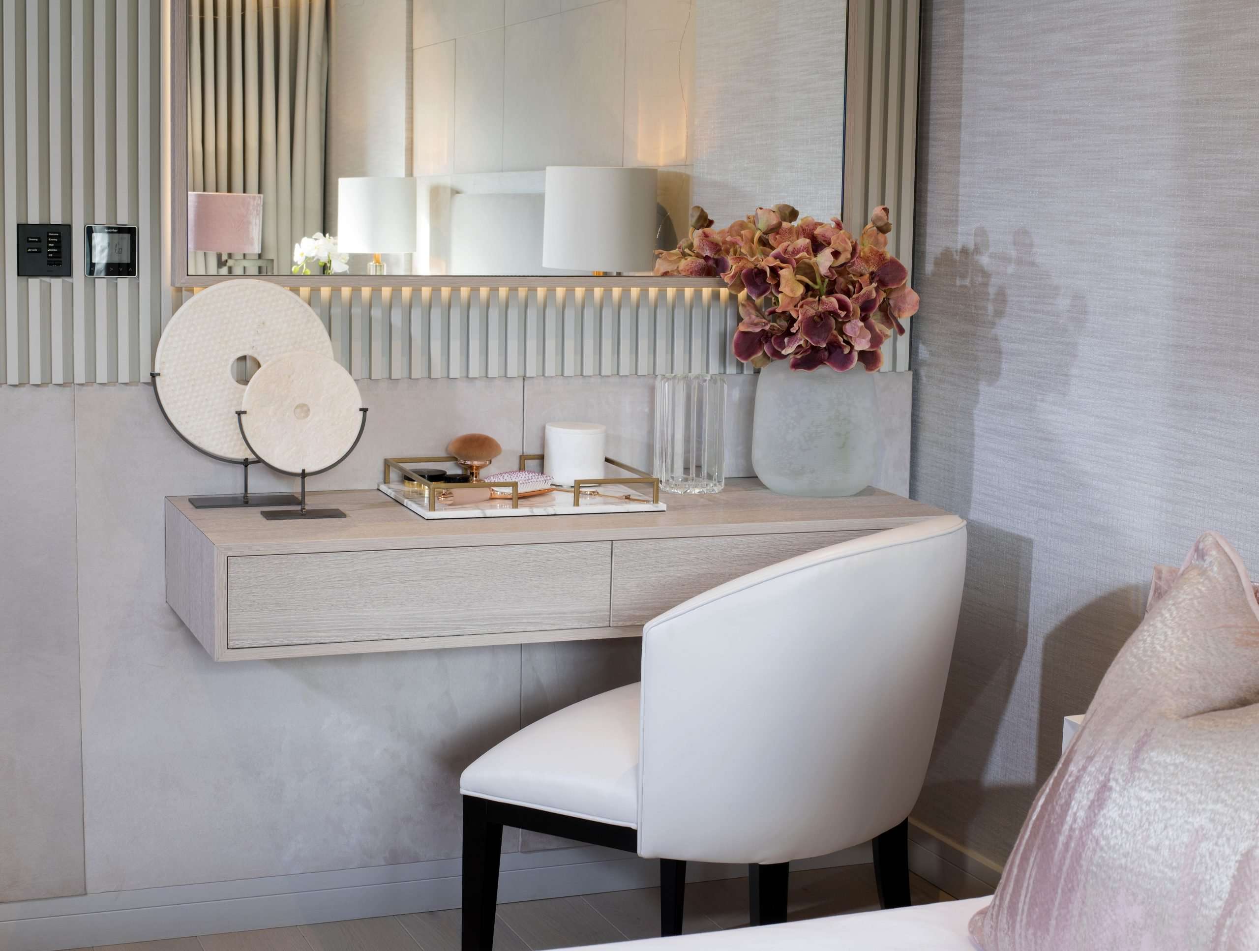 For an entirely contrasting look we have paired fabric wall coverings and offset upholstered wall panels with concealed LED lighting.