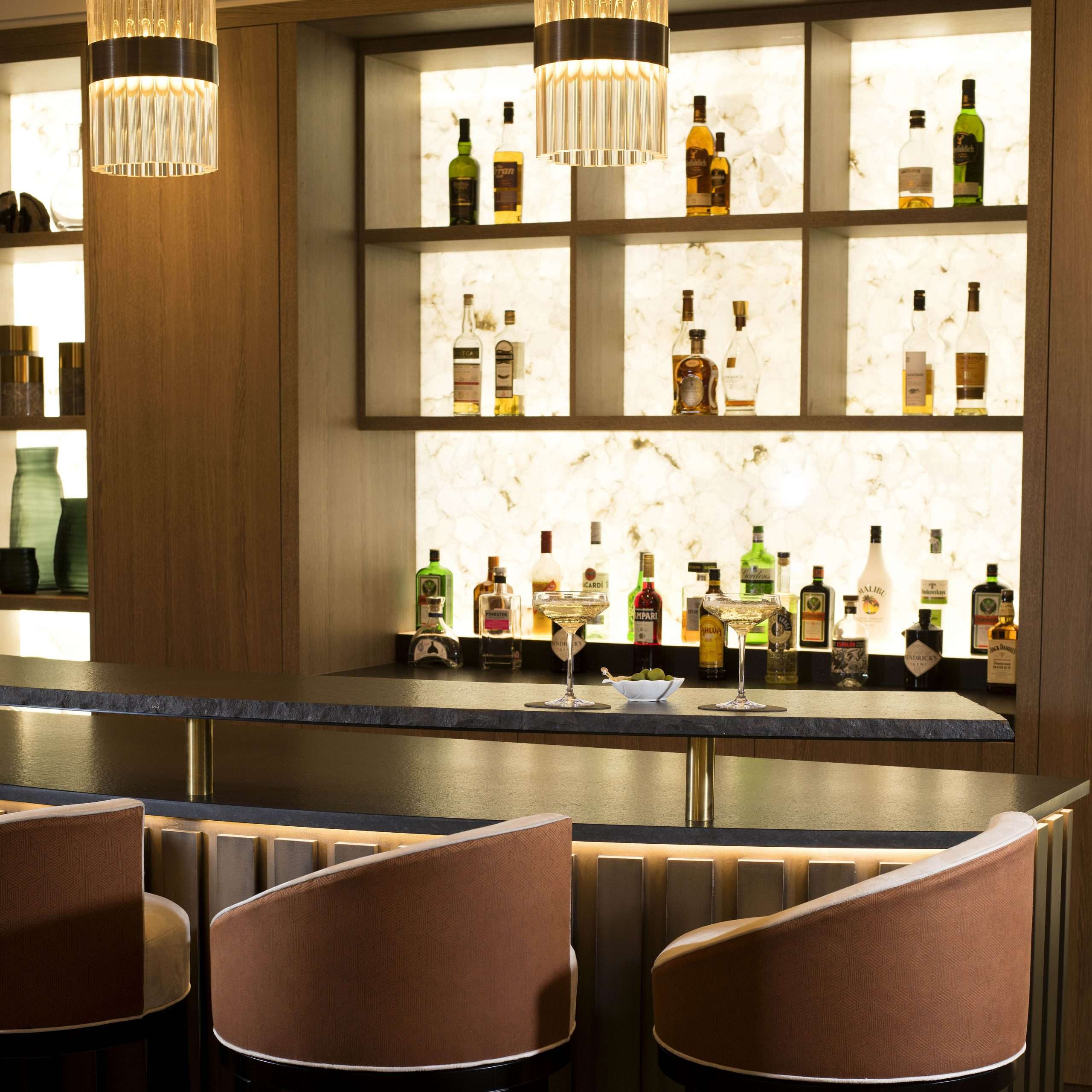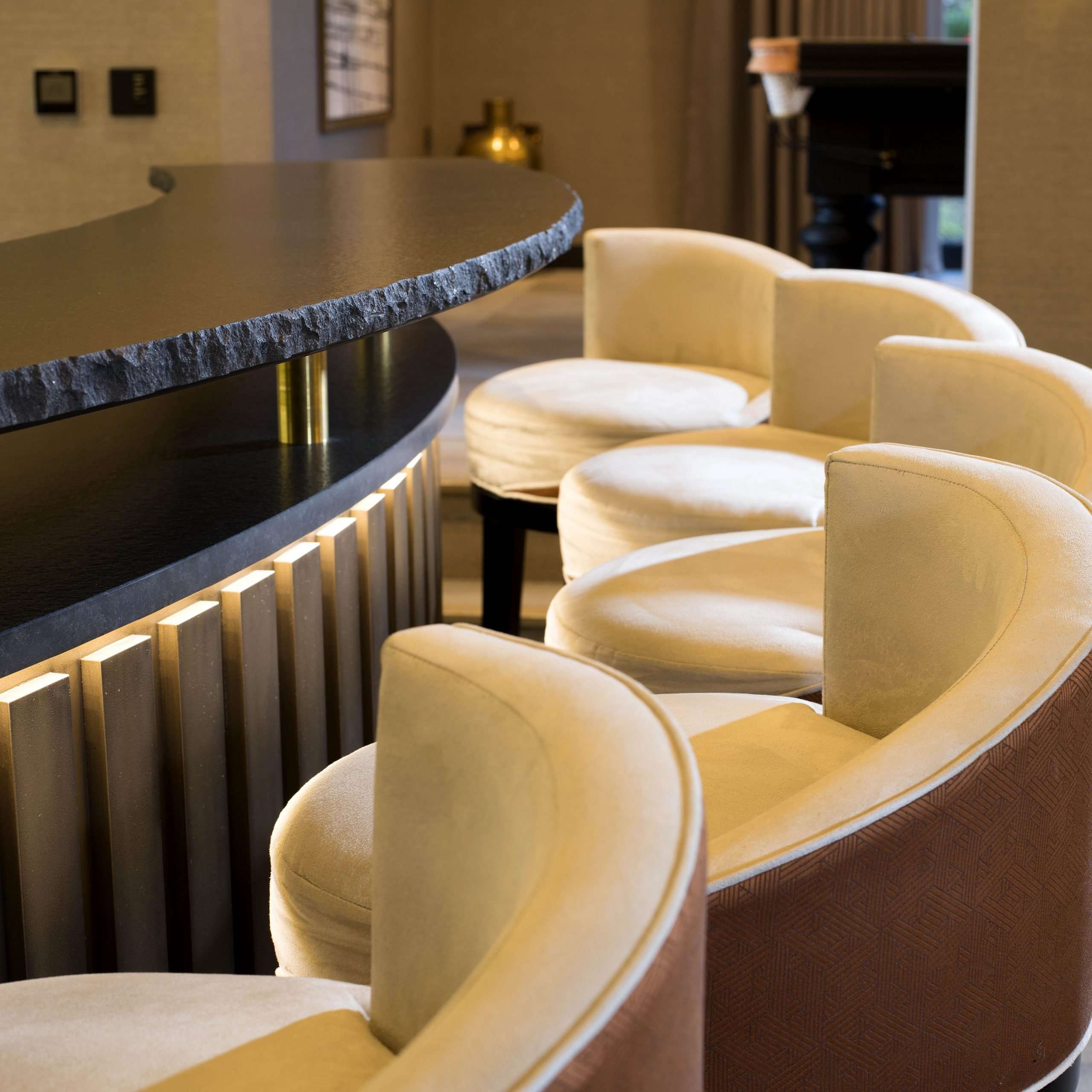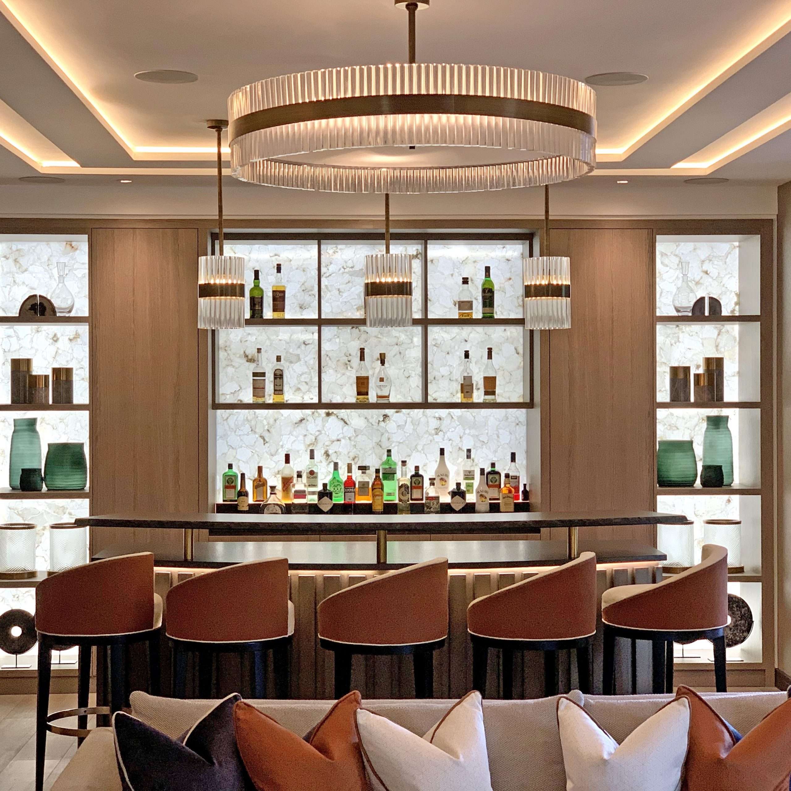 Once again, the importance of skilful layering is demonstrated. The backlit curved bar in alabaster is the focal point yet every detail in the space is crucial and works in perfect harmony to create an overall ambiance akin to the latest contemporary bars.