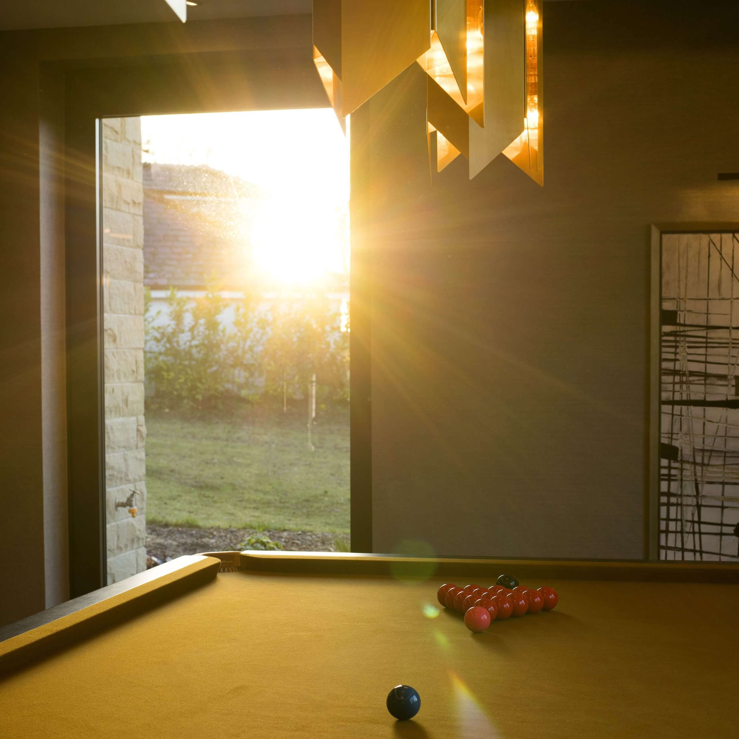 To create this seamless journey through the house we utilised a colour palette of neutral tones offset by either dark wood or grey stained oak cabinetry throughout the scheme. One of the main “open” areas of the house is the bar and games room which is accessed via critall style Portapivot doors off the hallway.