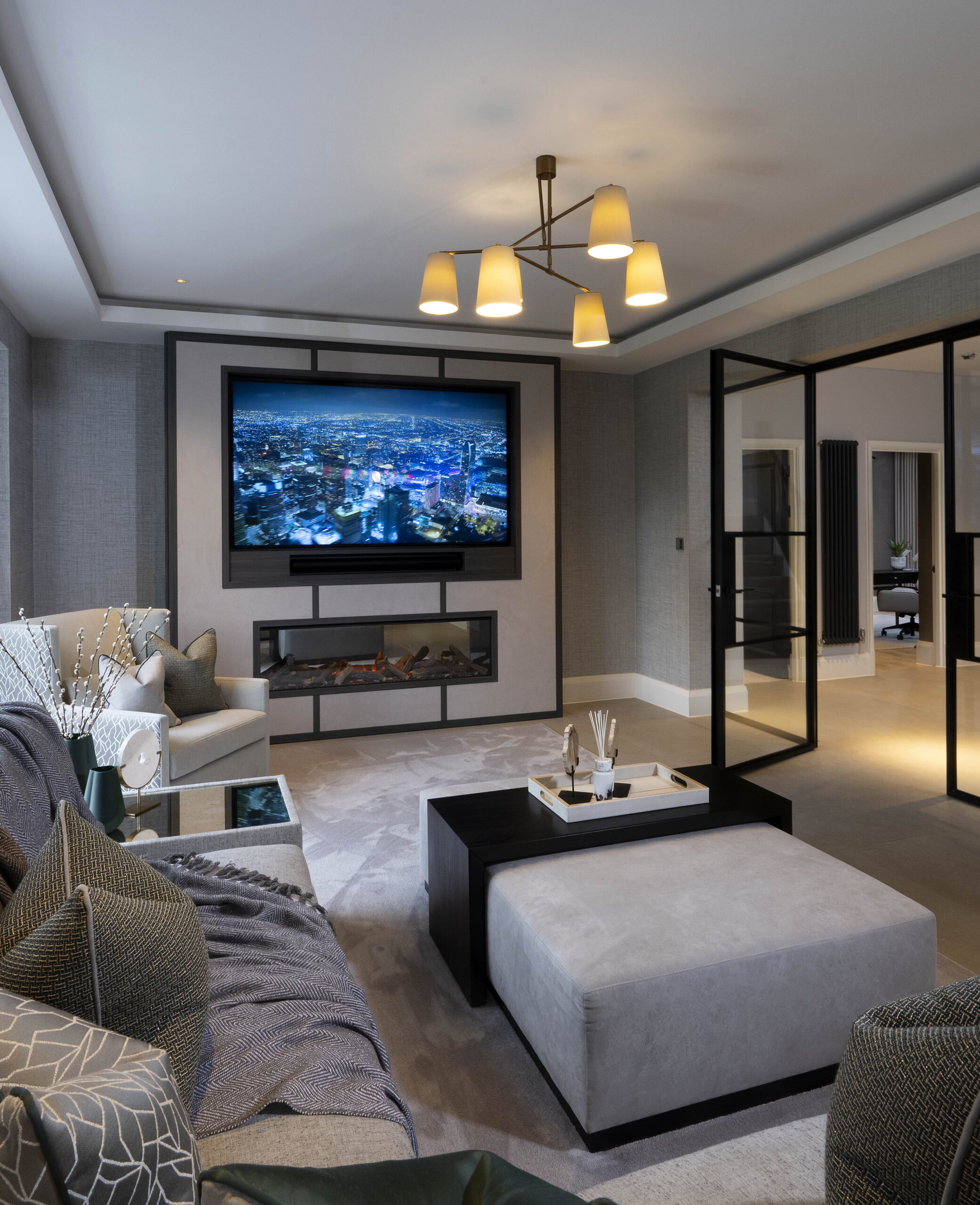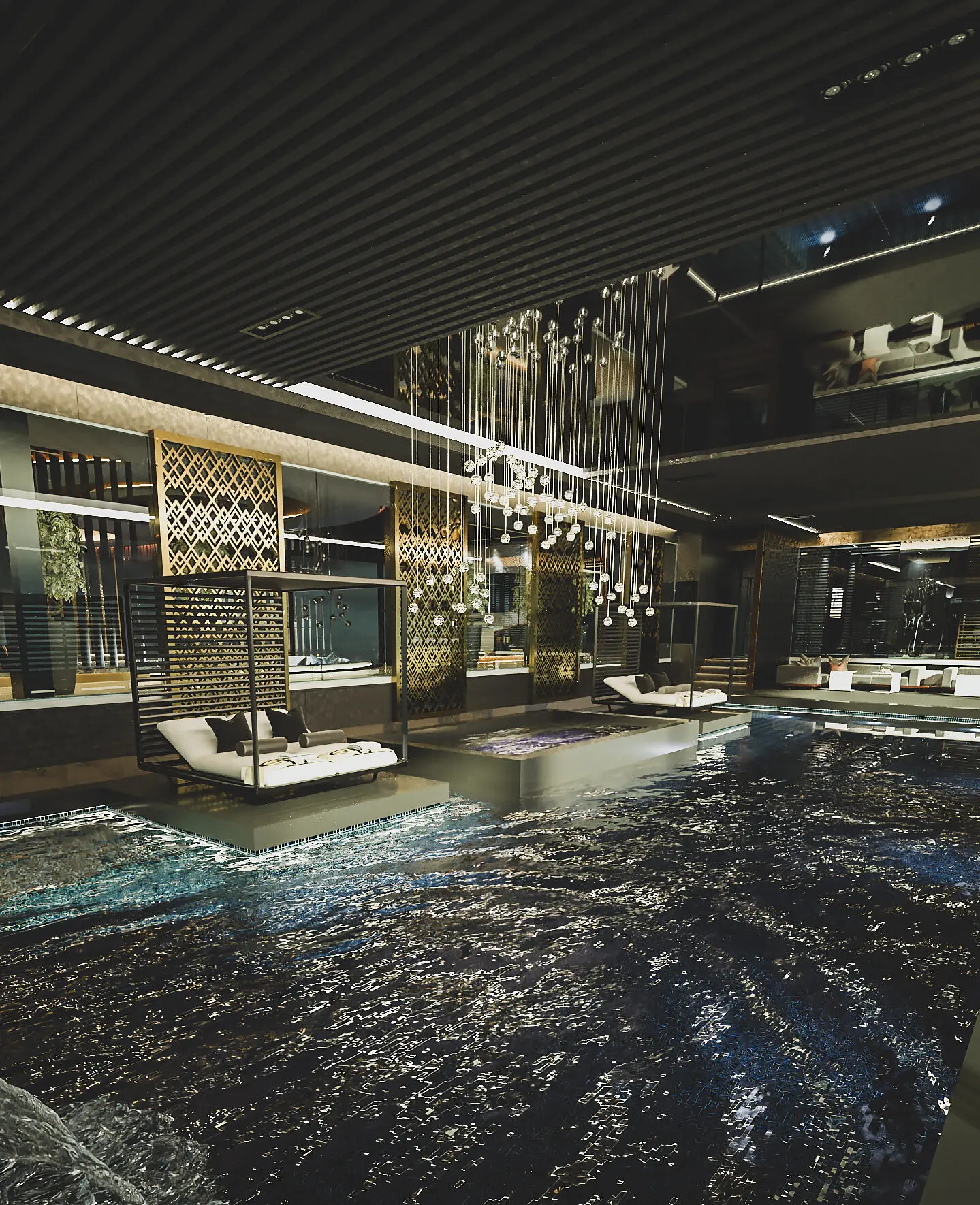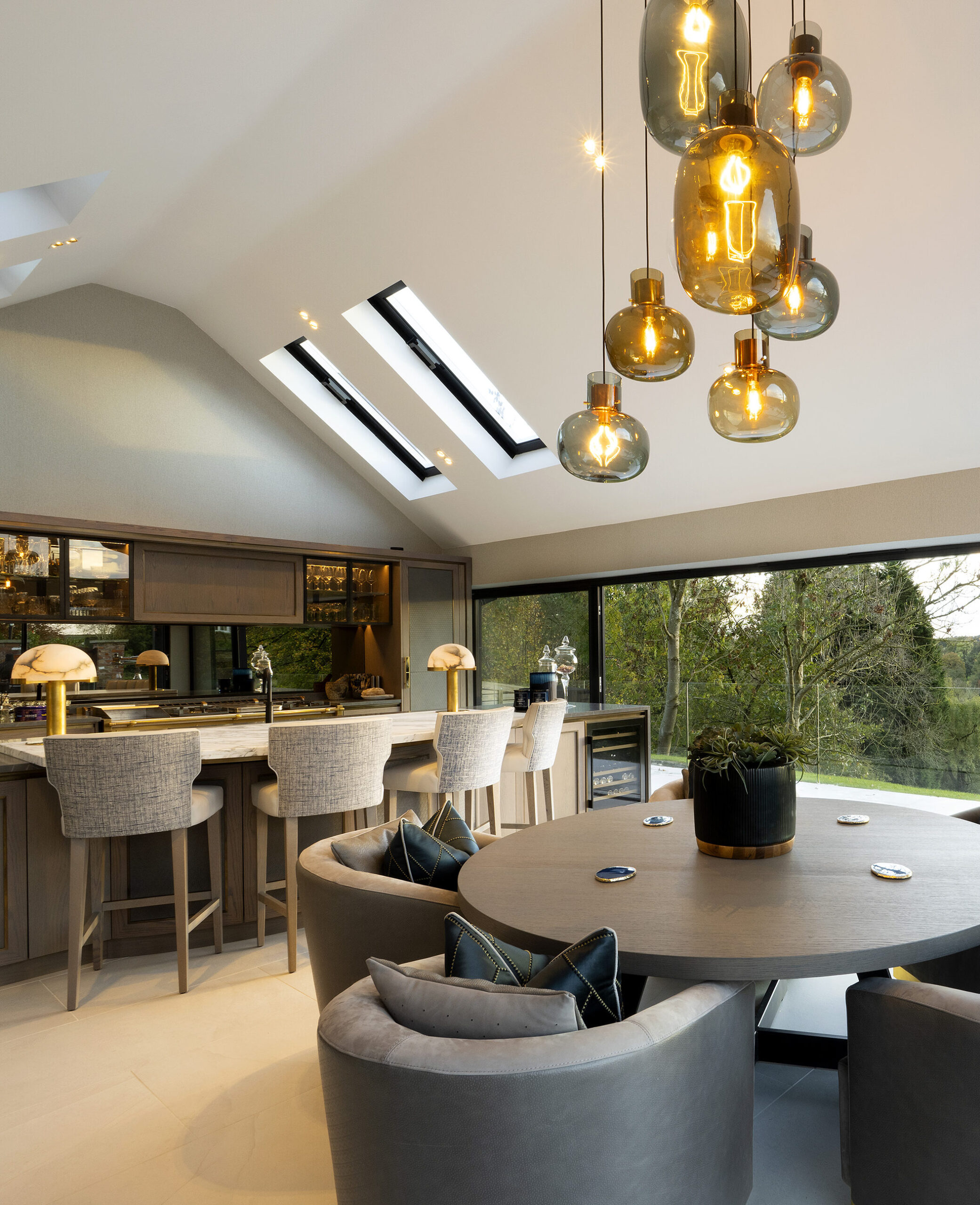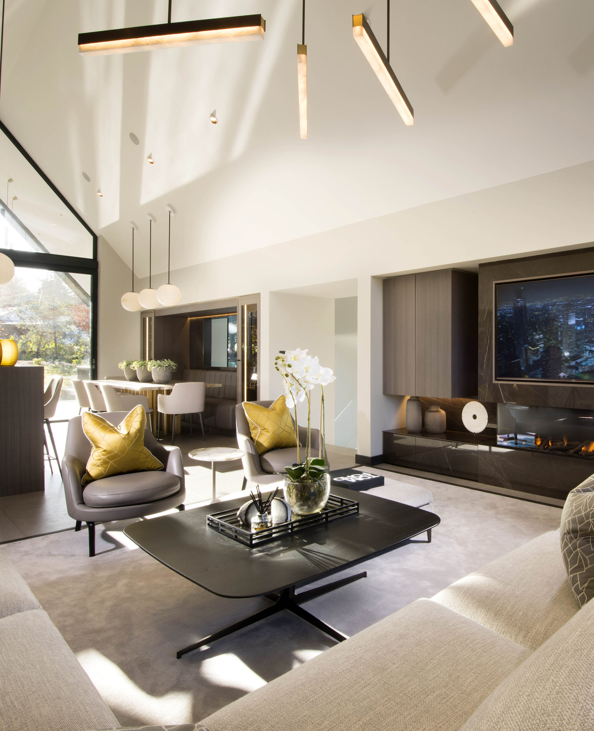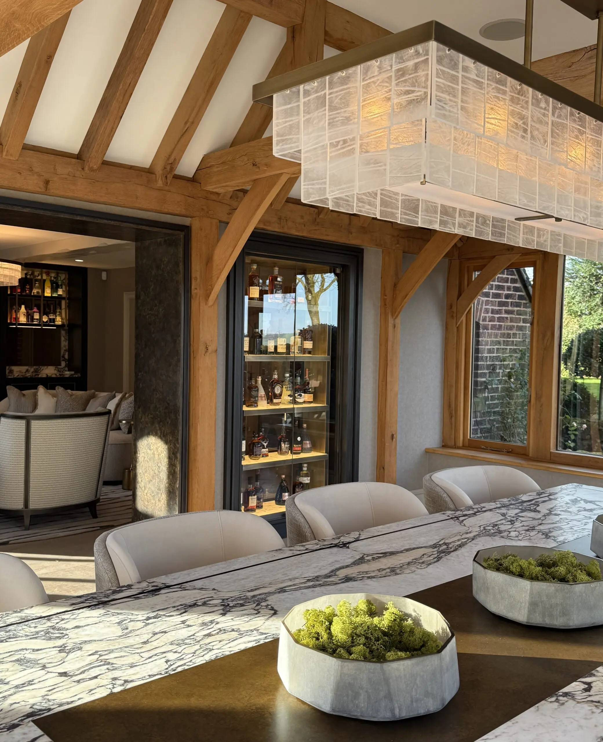 The space is further elevated by a bespoke feature ceiling, which includes a dropped coffer detail with concealed lighting. A decorative mesh metal chain encircles the low-hanging central pendant, creating a stunning focal point that exudes elegance and luxury.