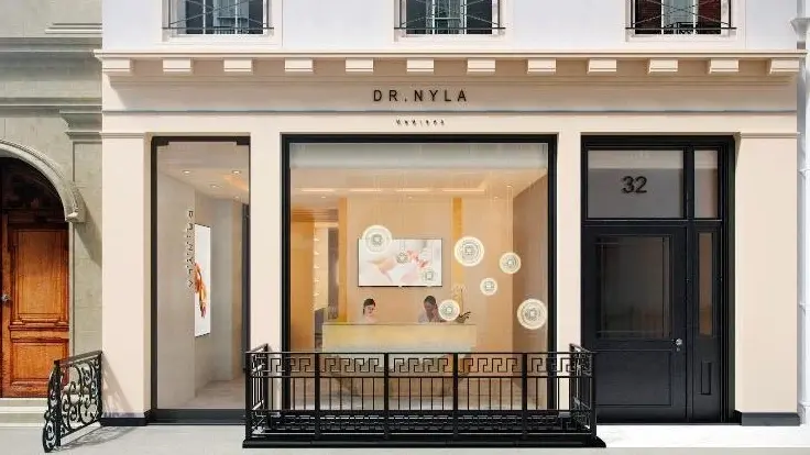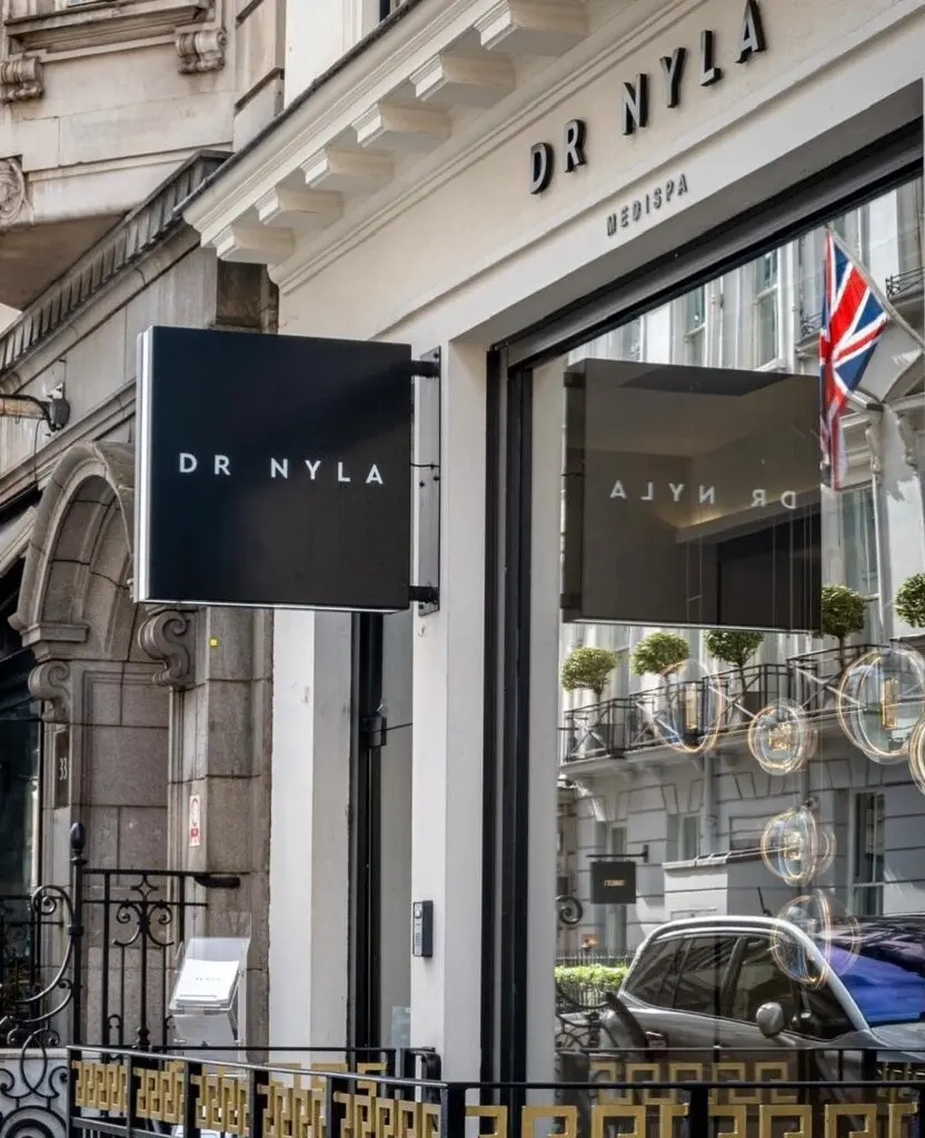 “Dr. Nyla” is prominently displayed in sleek and stylish, black uppercase lettering, which complements the black, ornate cast iron railings that add a touch of sophistication, complementing the upscale environment.
