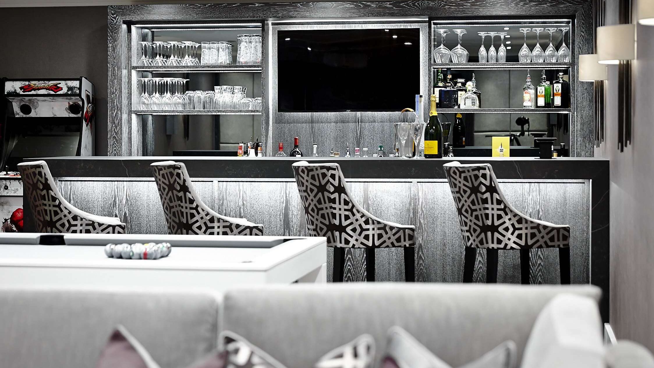 Along with the bar, this area of the room also boasts a pool table and a host of retro arcade games.