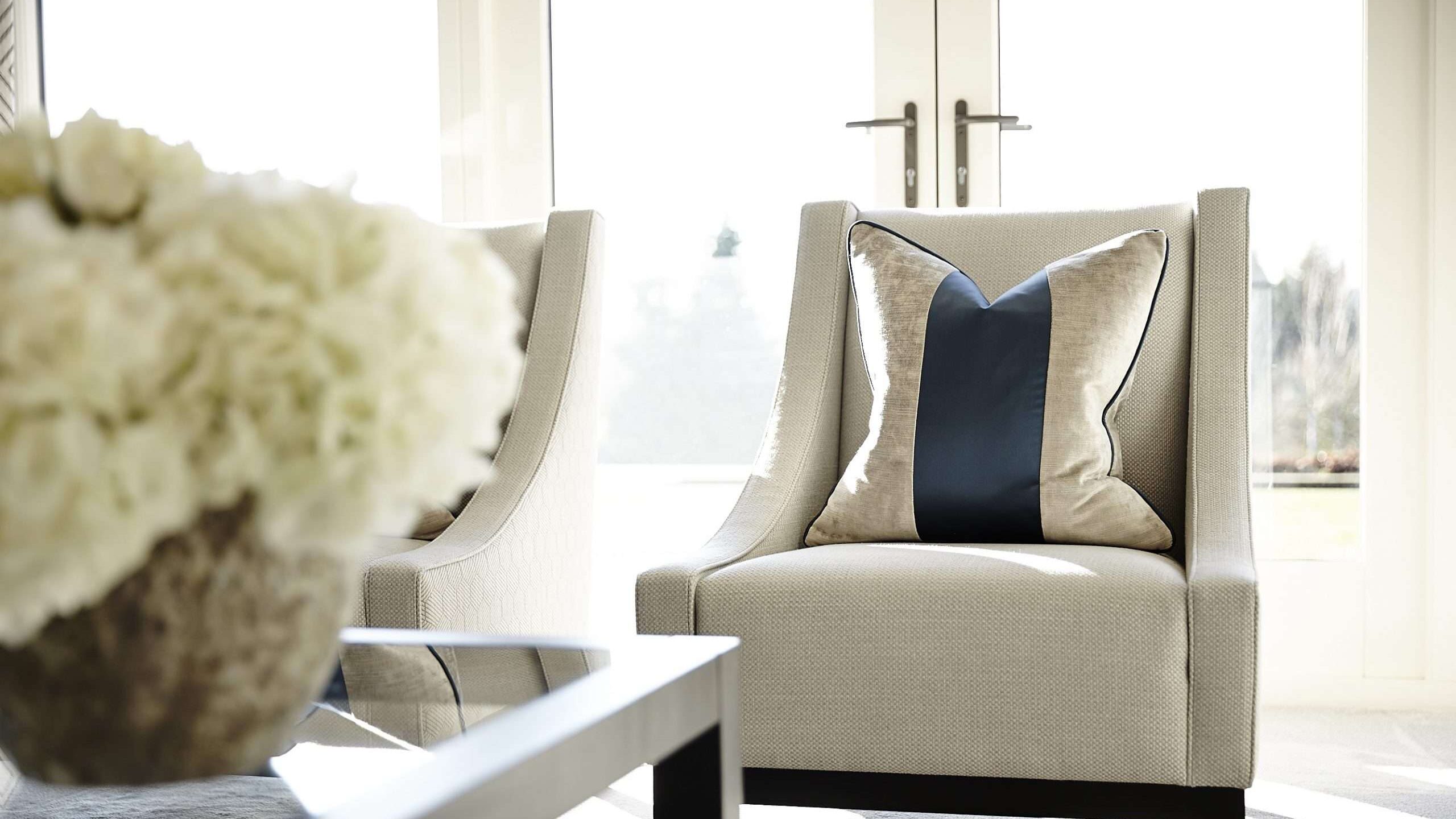 Occasional chairs with high backs and a sloping arm detail suit the formality of the room perfectly whilst a contemporary element is added through using a contrasting fabric to the front and back.
