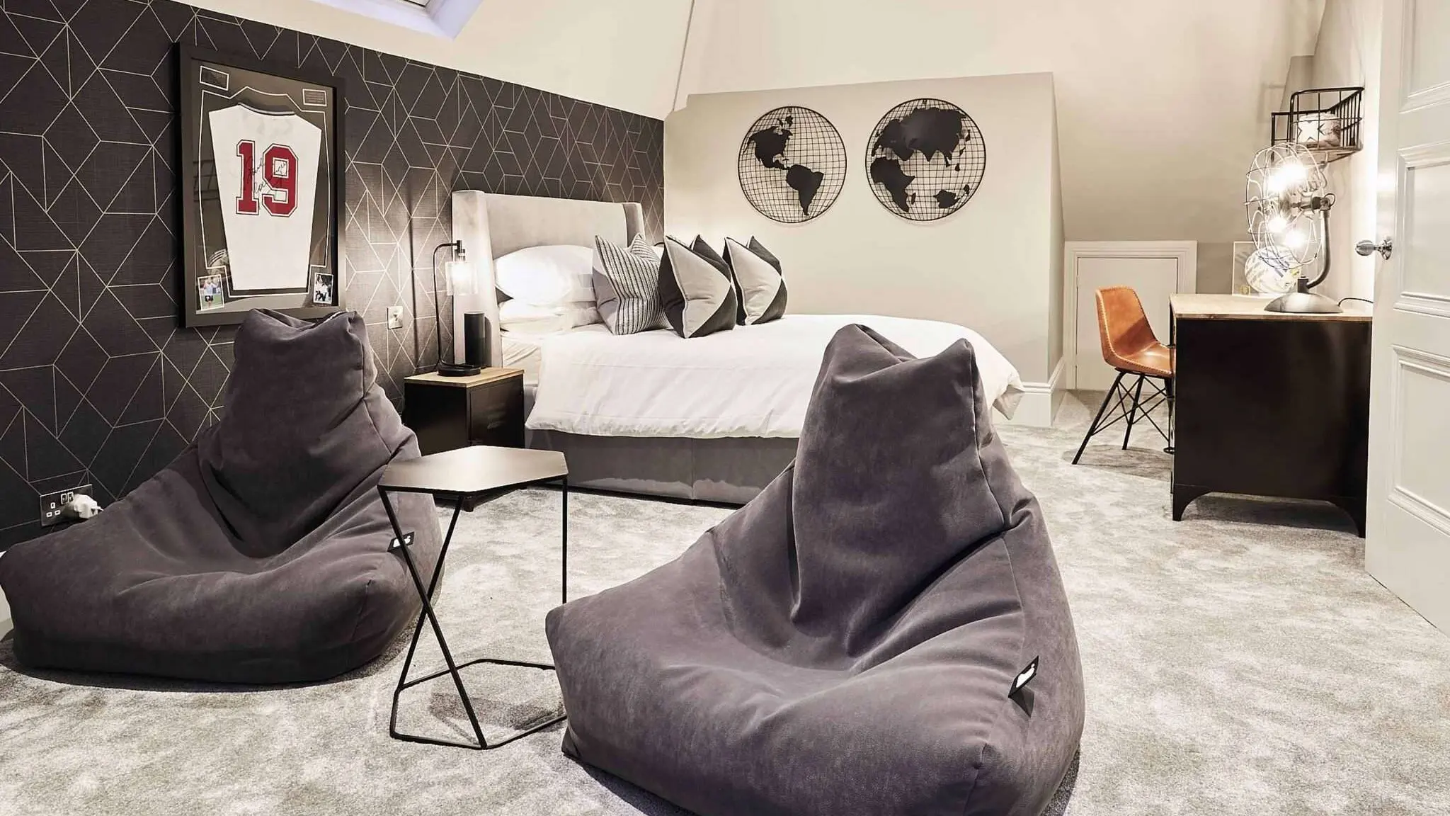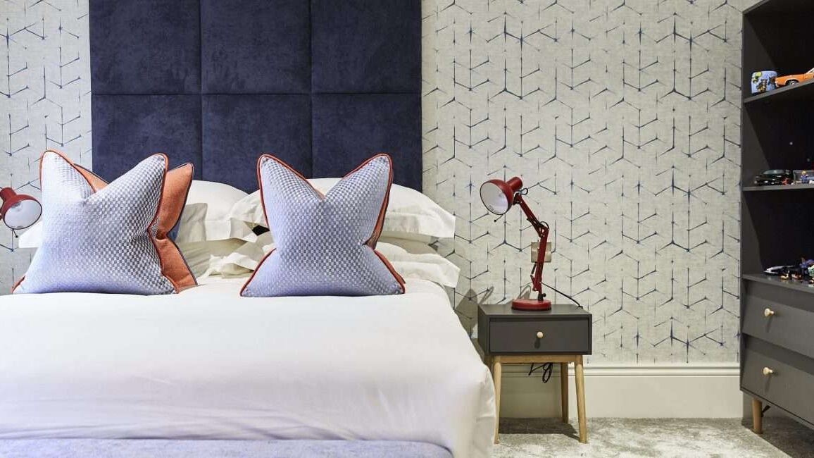 Reflective of the fact that he is slightly older, the room is adorned with wire-framed lamps, bean bags and features a dedicated Lego station.