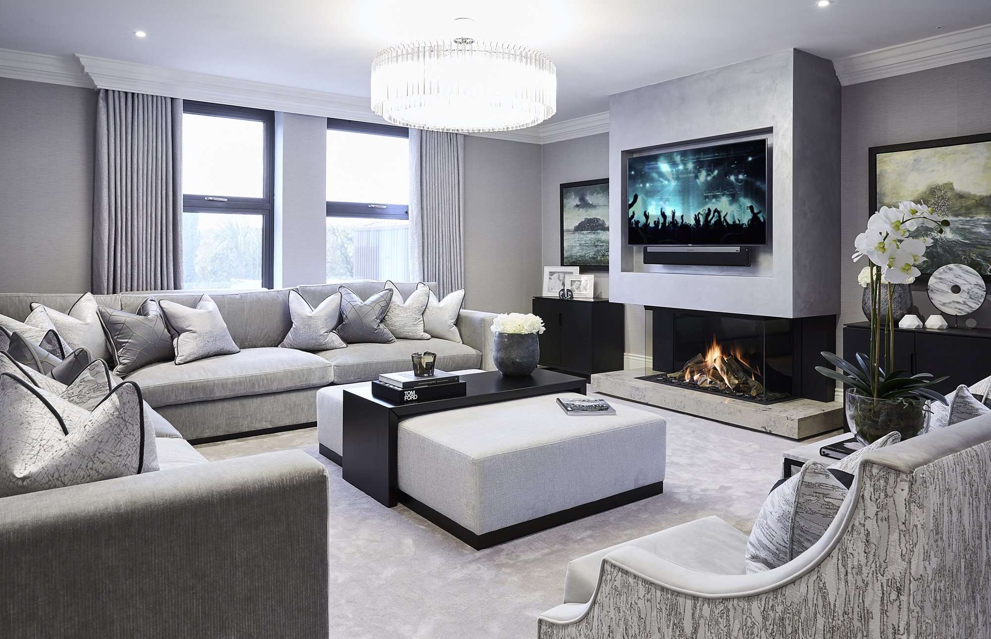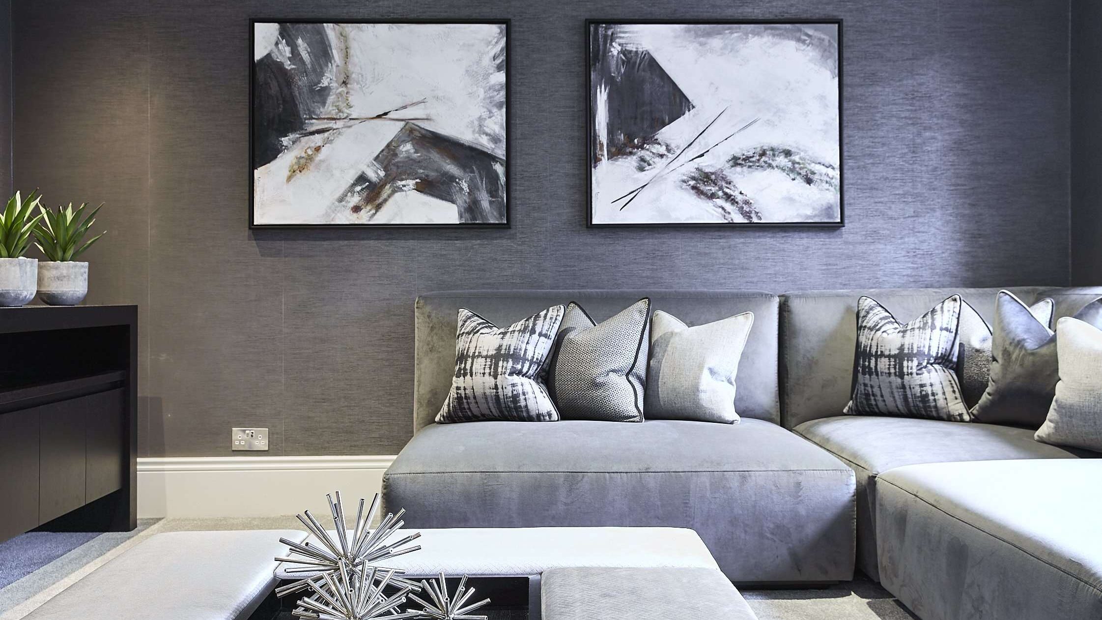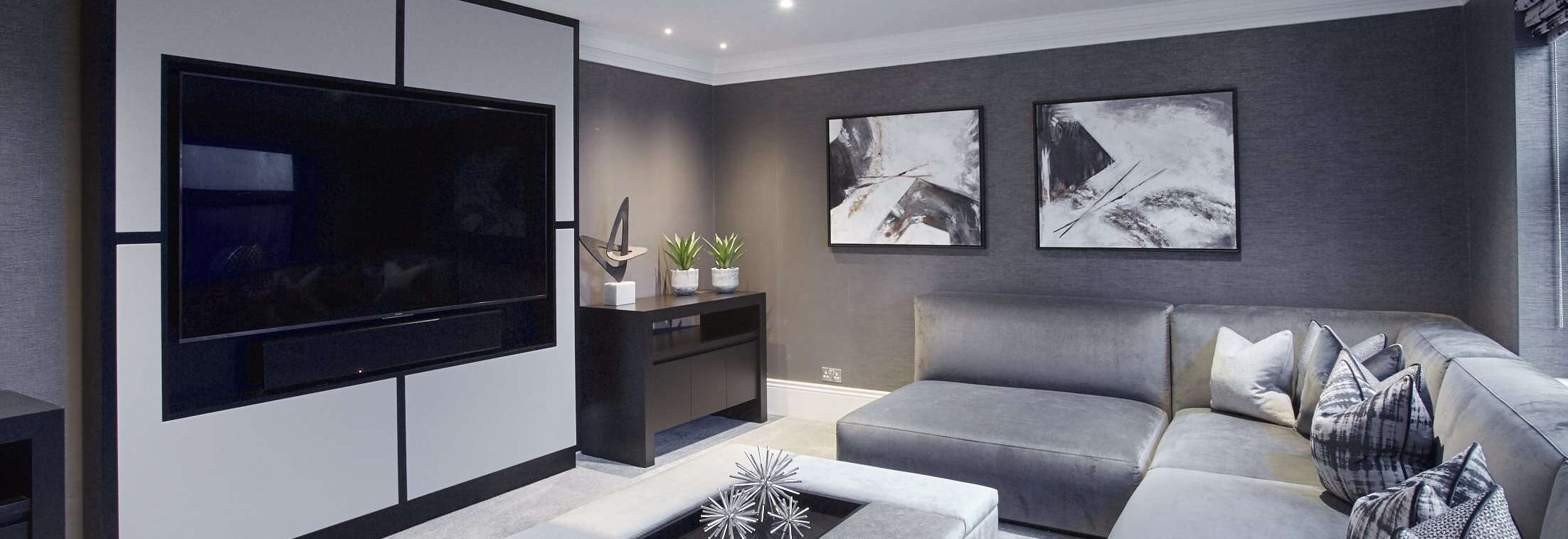 A change of tone was required for the media room which was designed to be a more masculine space. Shades of taupe and black created a moodier tone whilst strategically placed spot lights and floor lights added to the atmosphere. A feature cabinetry wall was crafted to house the media units whilst freestanding furniture ensured a feeling of balance in the room.