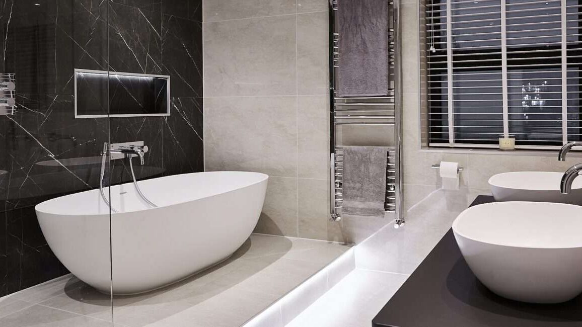 A feature wall in dark marble sets the tone whilst the freestanding bath and shower sit on a raised platform, adding interest to the space.
