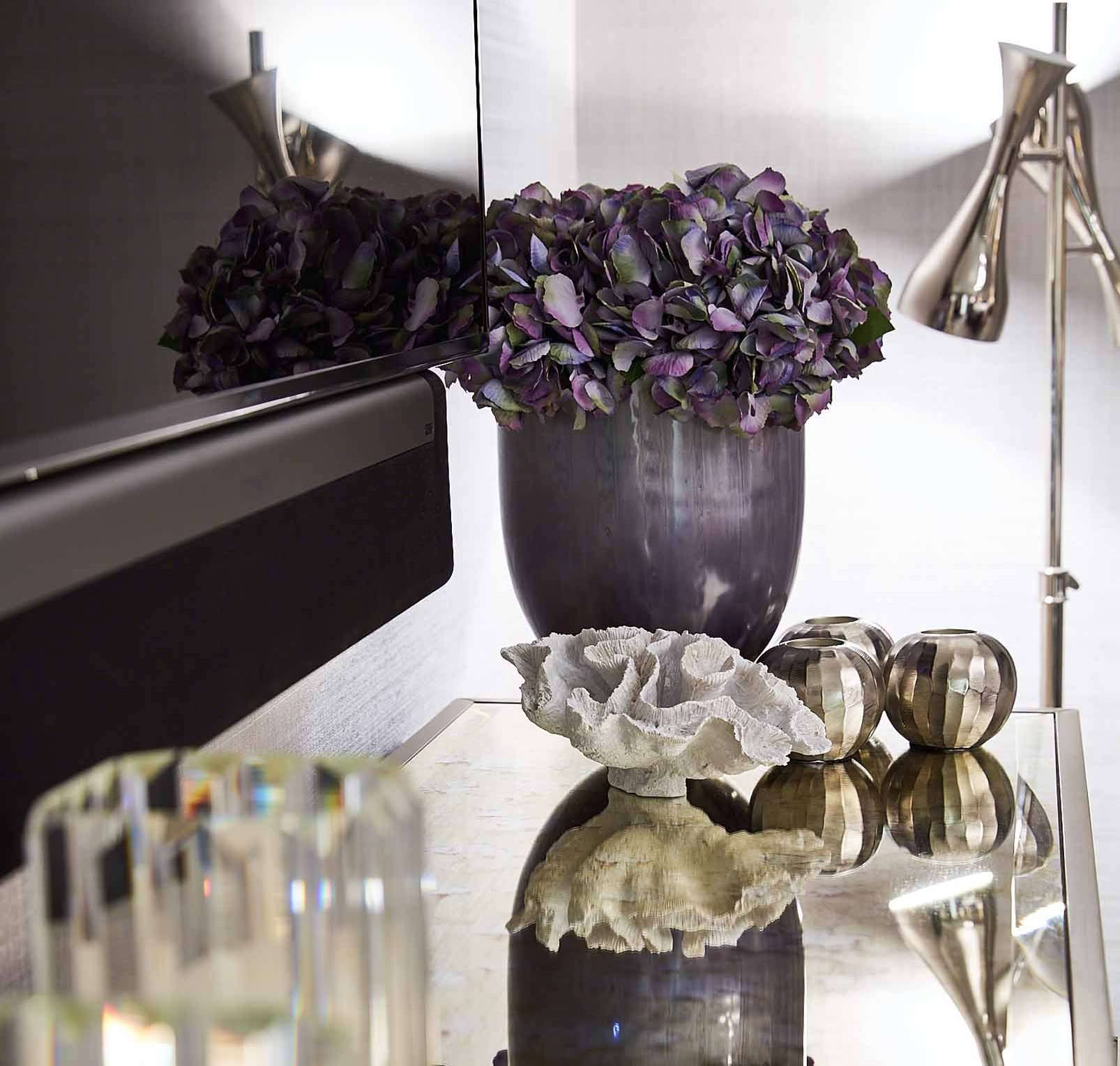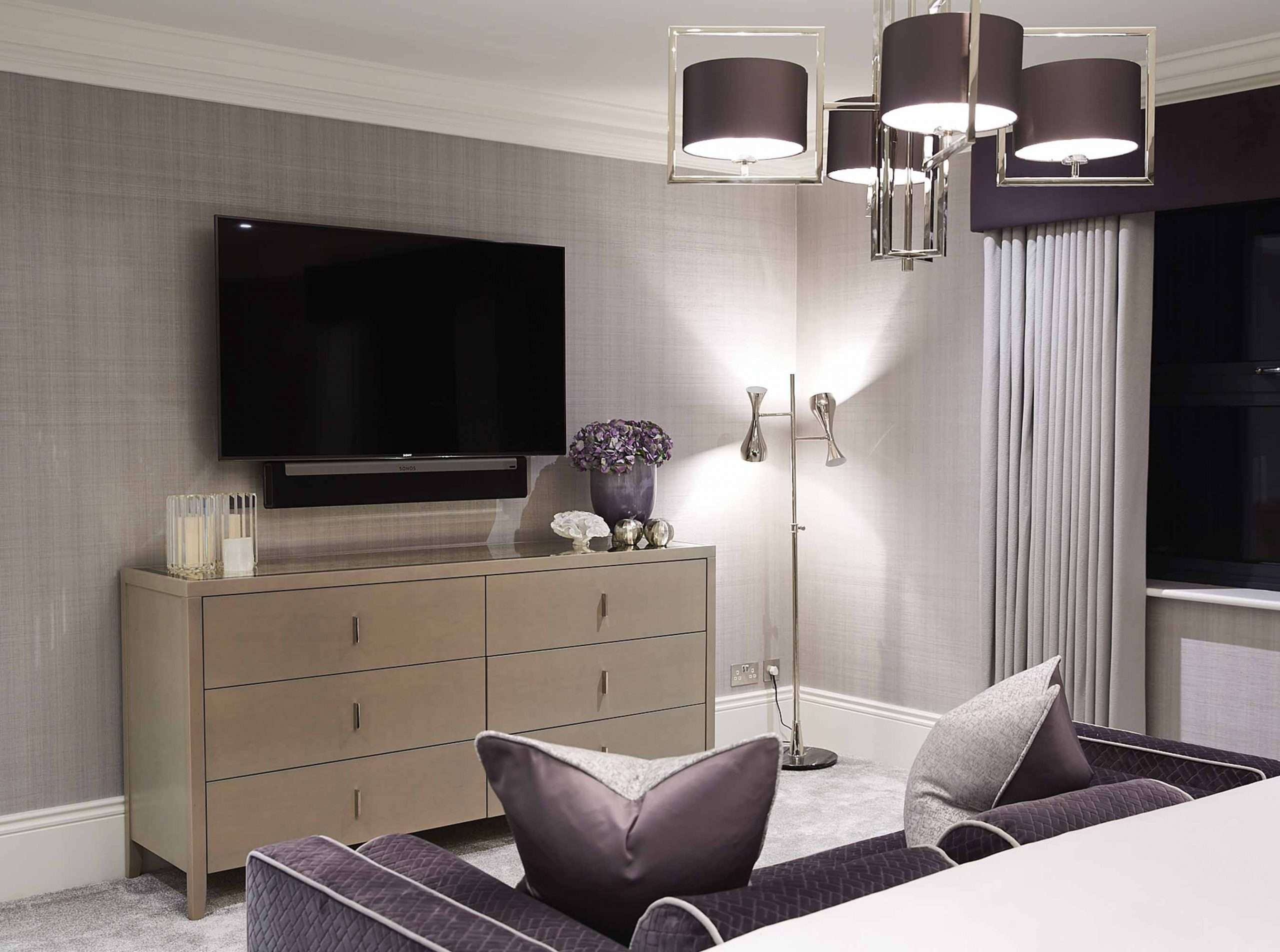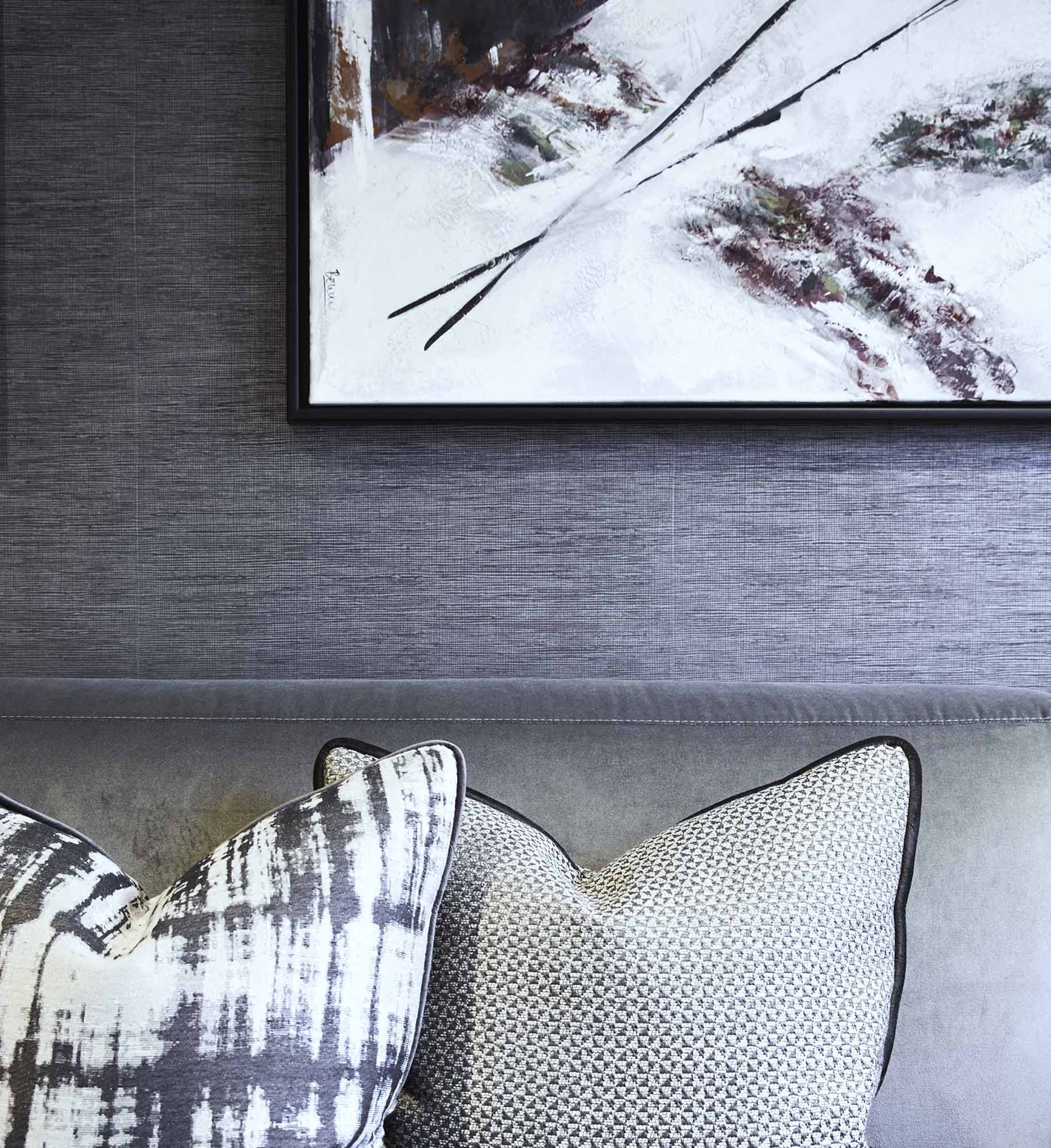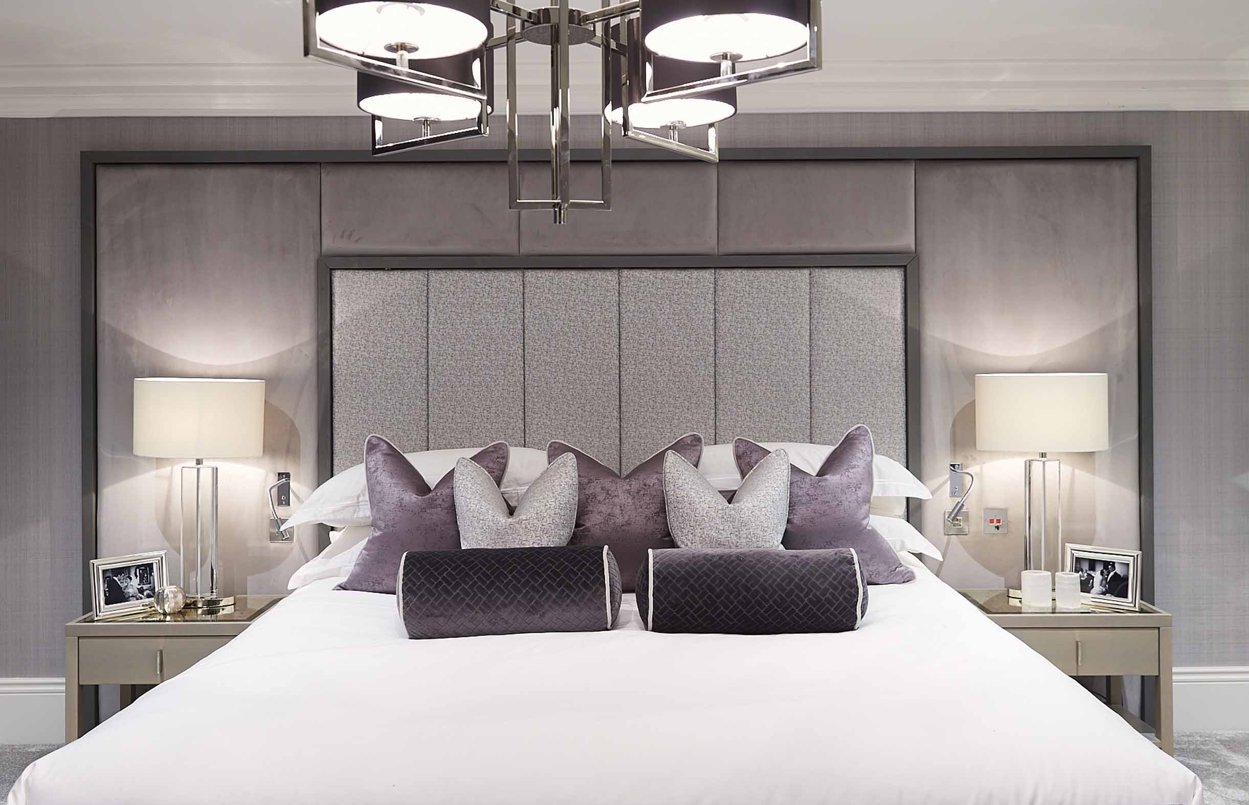 The master bedroom is designed in calming neutral tones of silvery grey. The bespoke upholstered headboard in silver velvet is placed in a prominent position which naturally draws the eye yet does not dominate. There is a sense that every element in the room works in harmony to create an experience of overwhelming serenity. The scatter cushions and occasional chairs are laced with accents of mauve to add softness to the look.