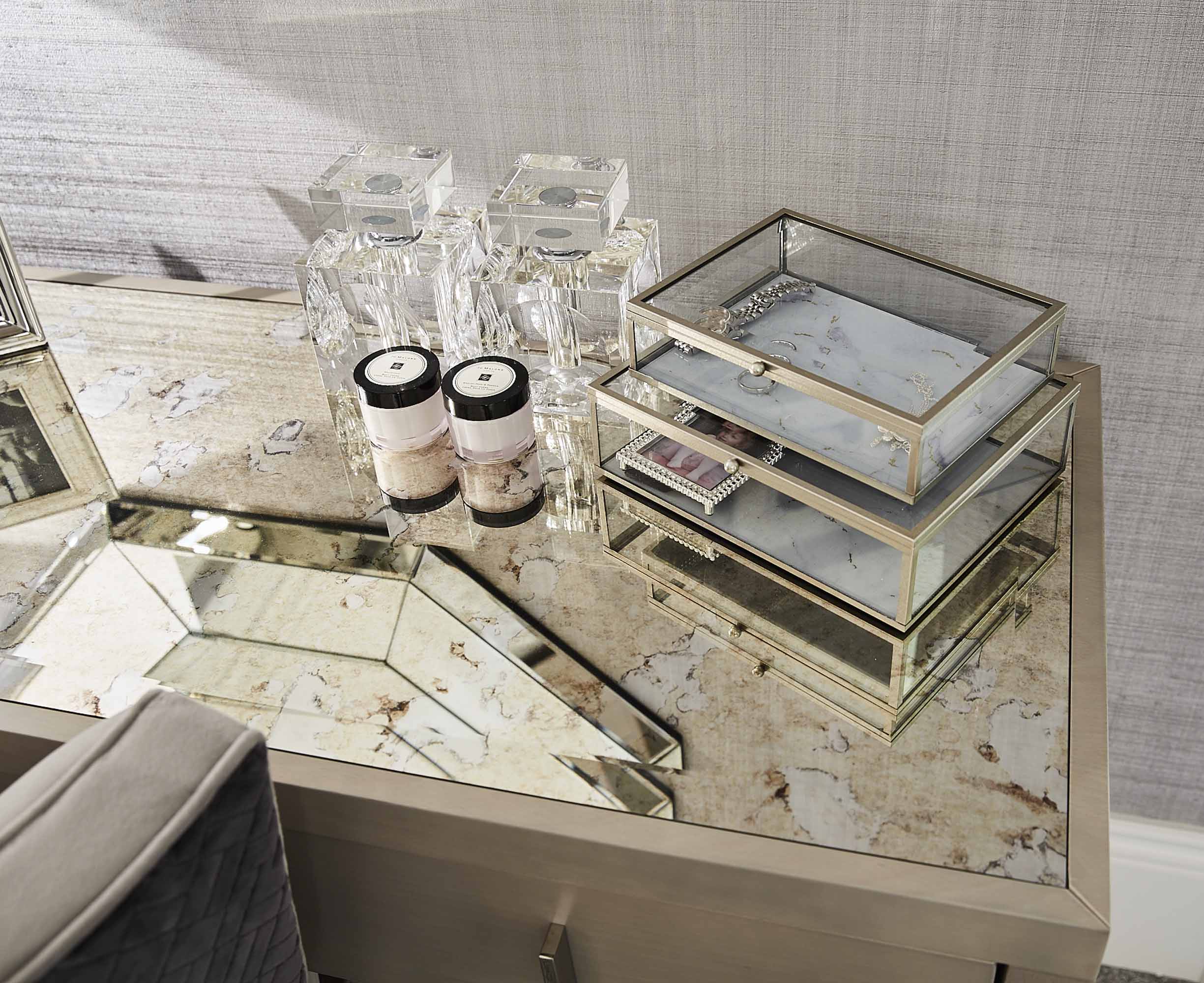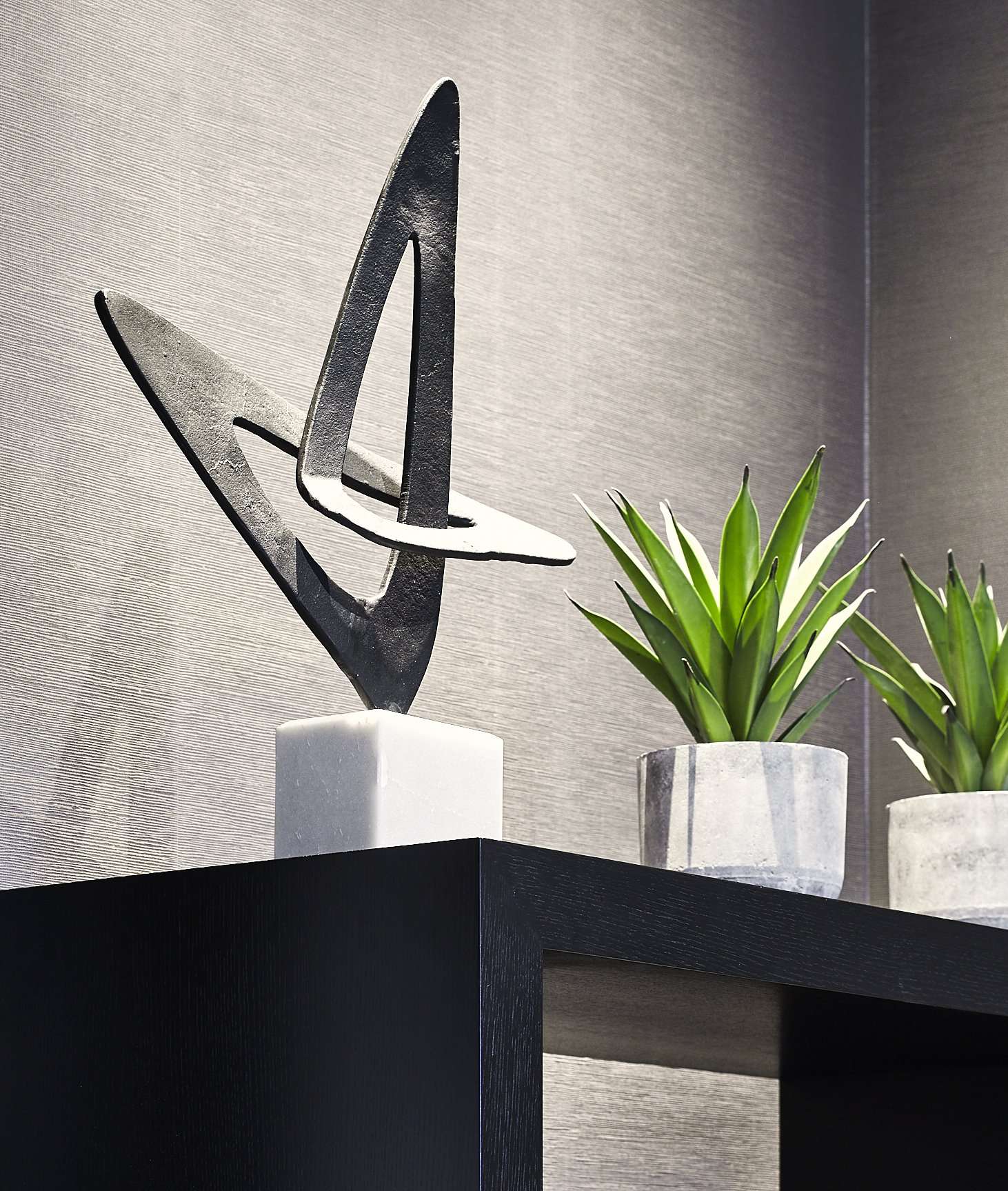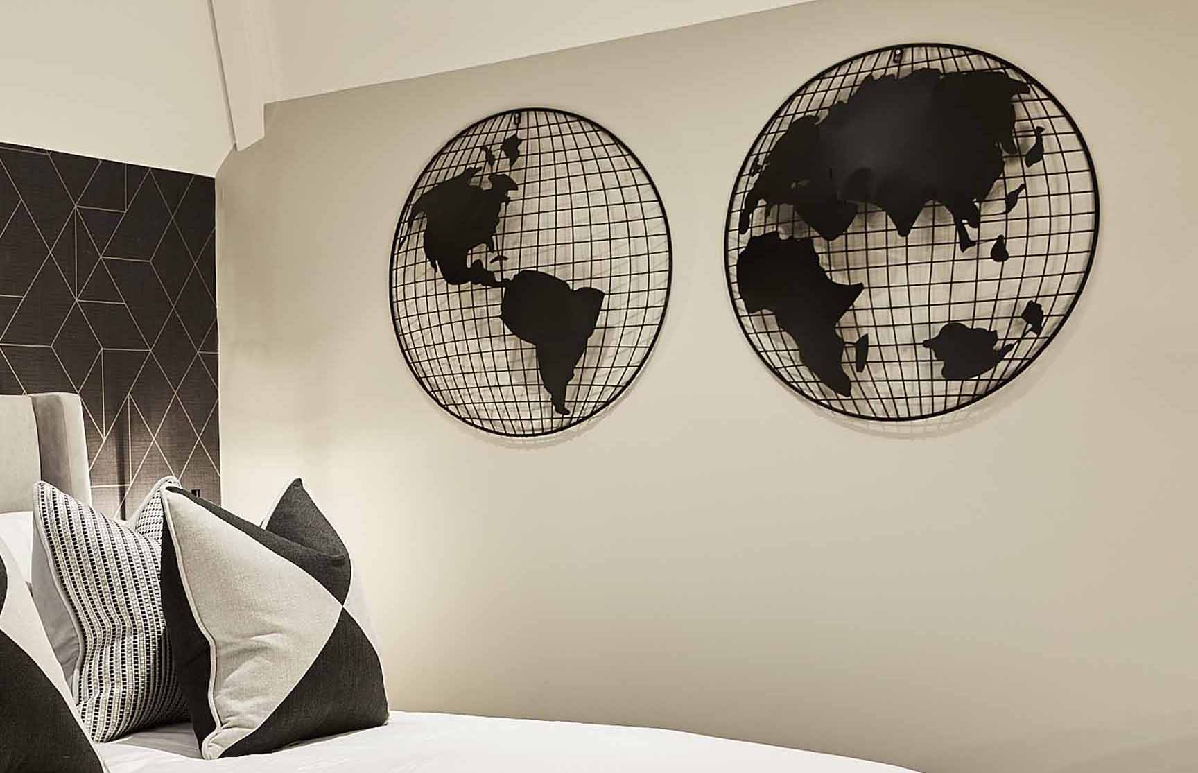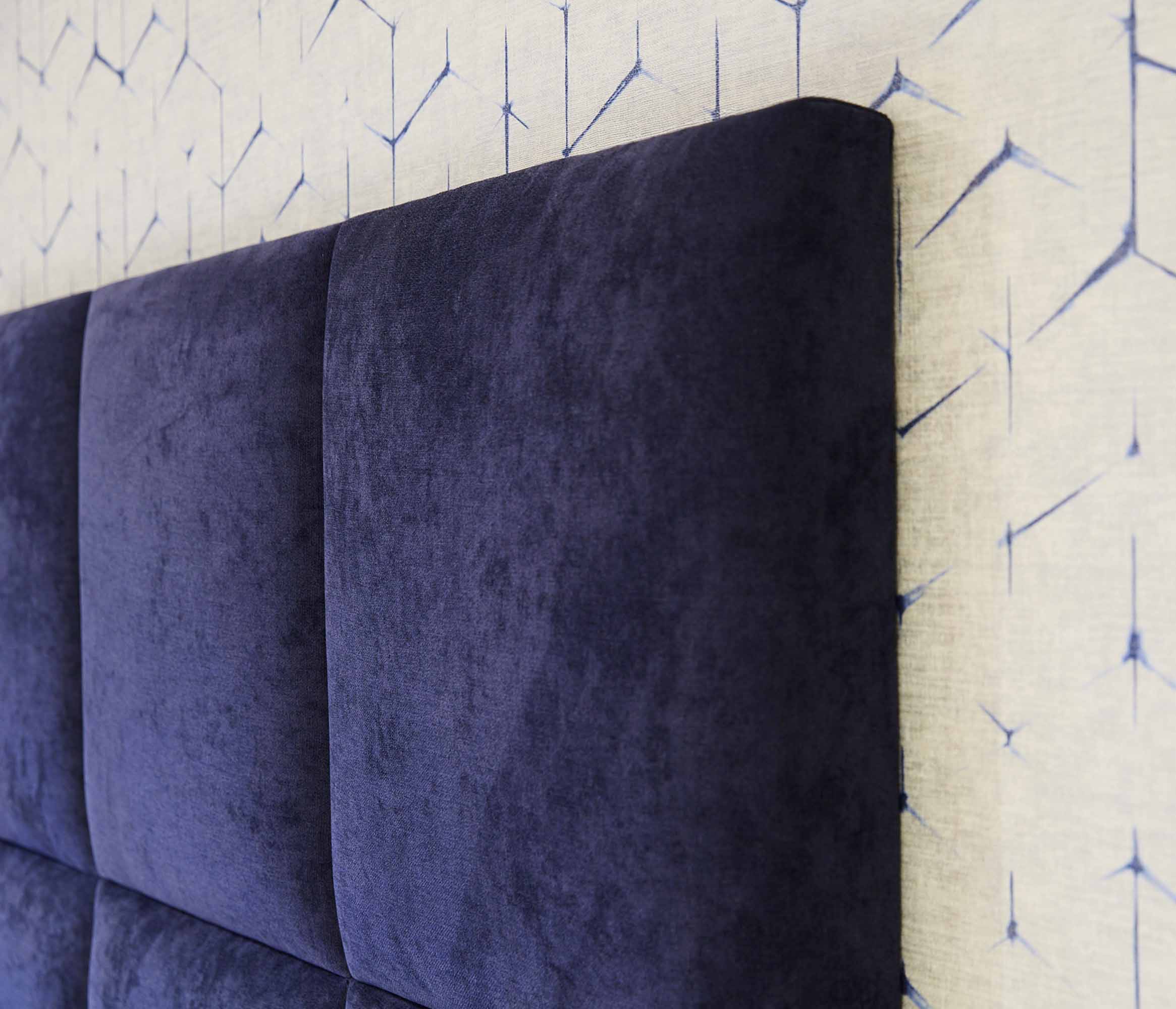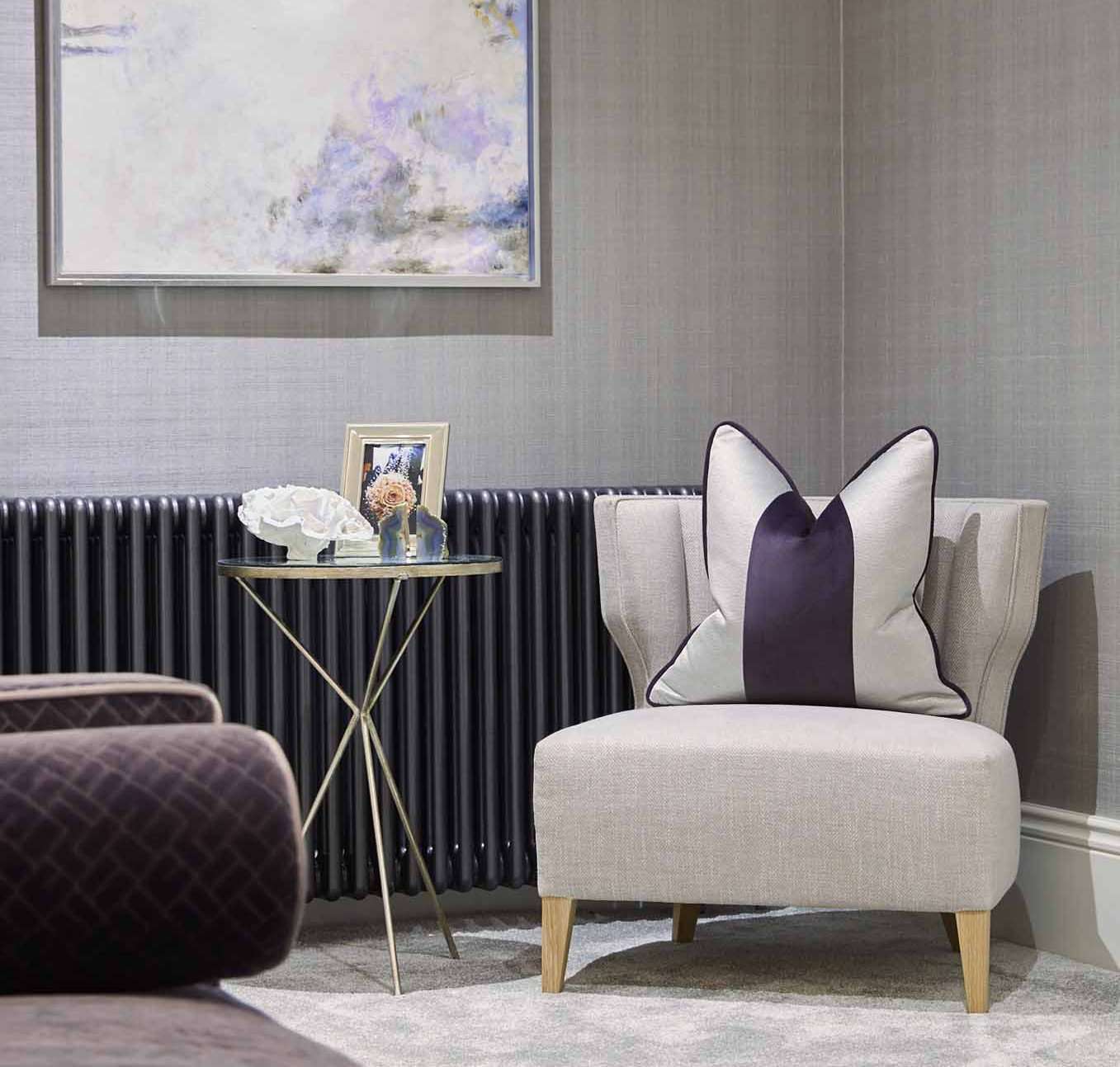The master bedroom is designed in calming neutral tones of silvery grey. The bespoke upholstered headboard in silver velvet is placed in a prominent position which naturally draws the eye yet does not dominate. There is a sense that every element in the room works in harmony to create an experience of overwhelming serenity. The scatter cushions and occasional chairs are laced with accents of mauve to add softness to the look.