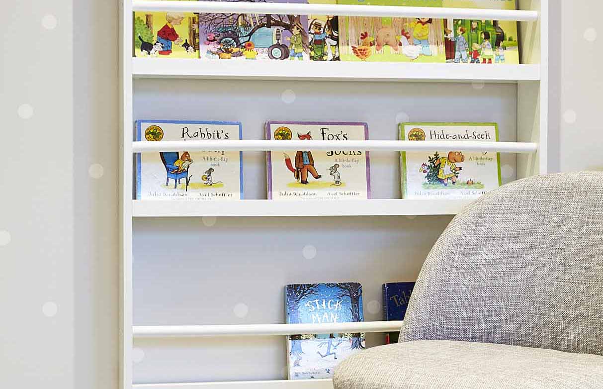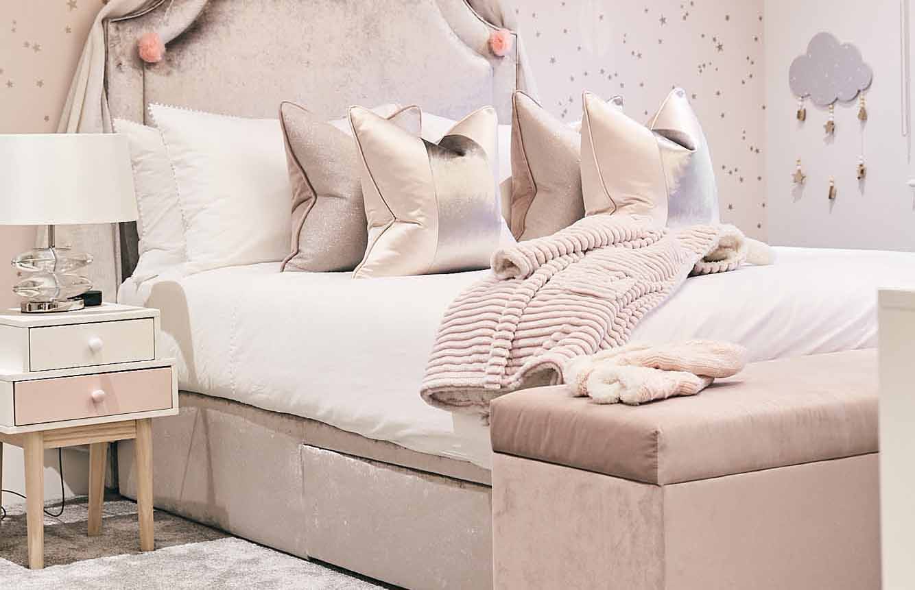 A bedroom in pink and white tones, bedecked with a healthy dose of sparkles, a feature corona with voile curtains over the bed and a reading corner designed as a castle is surely every little girl’s dream!