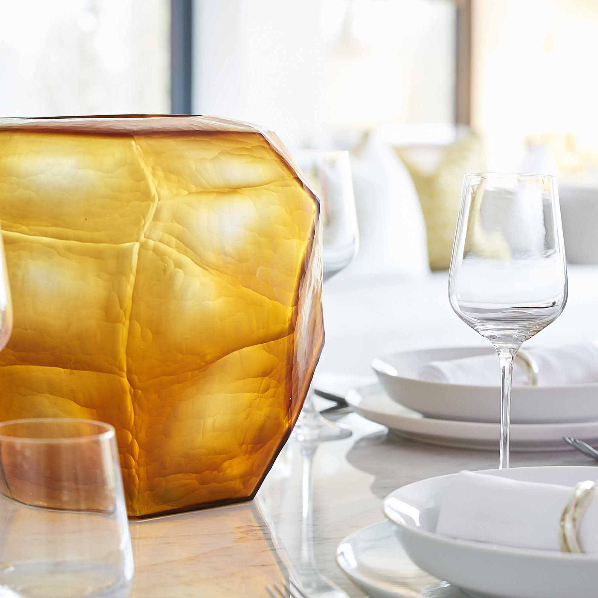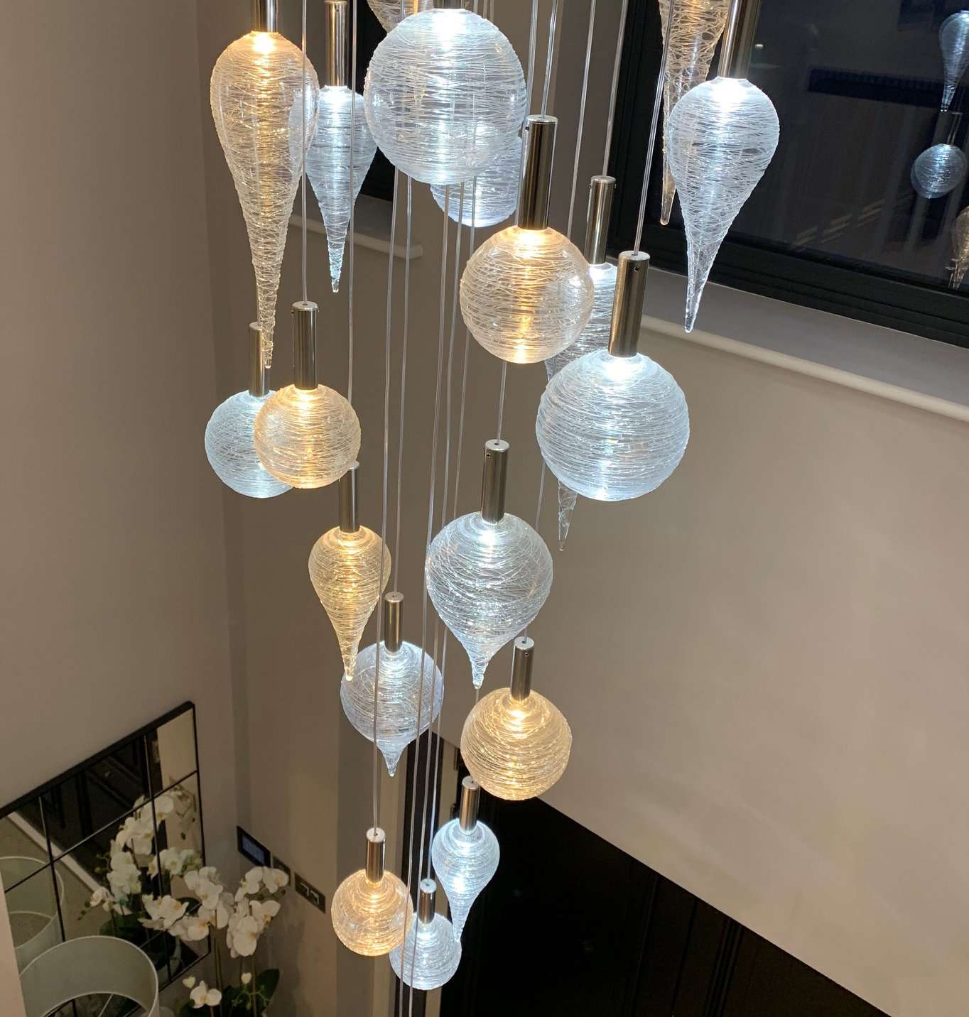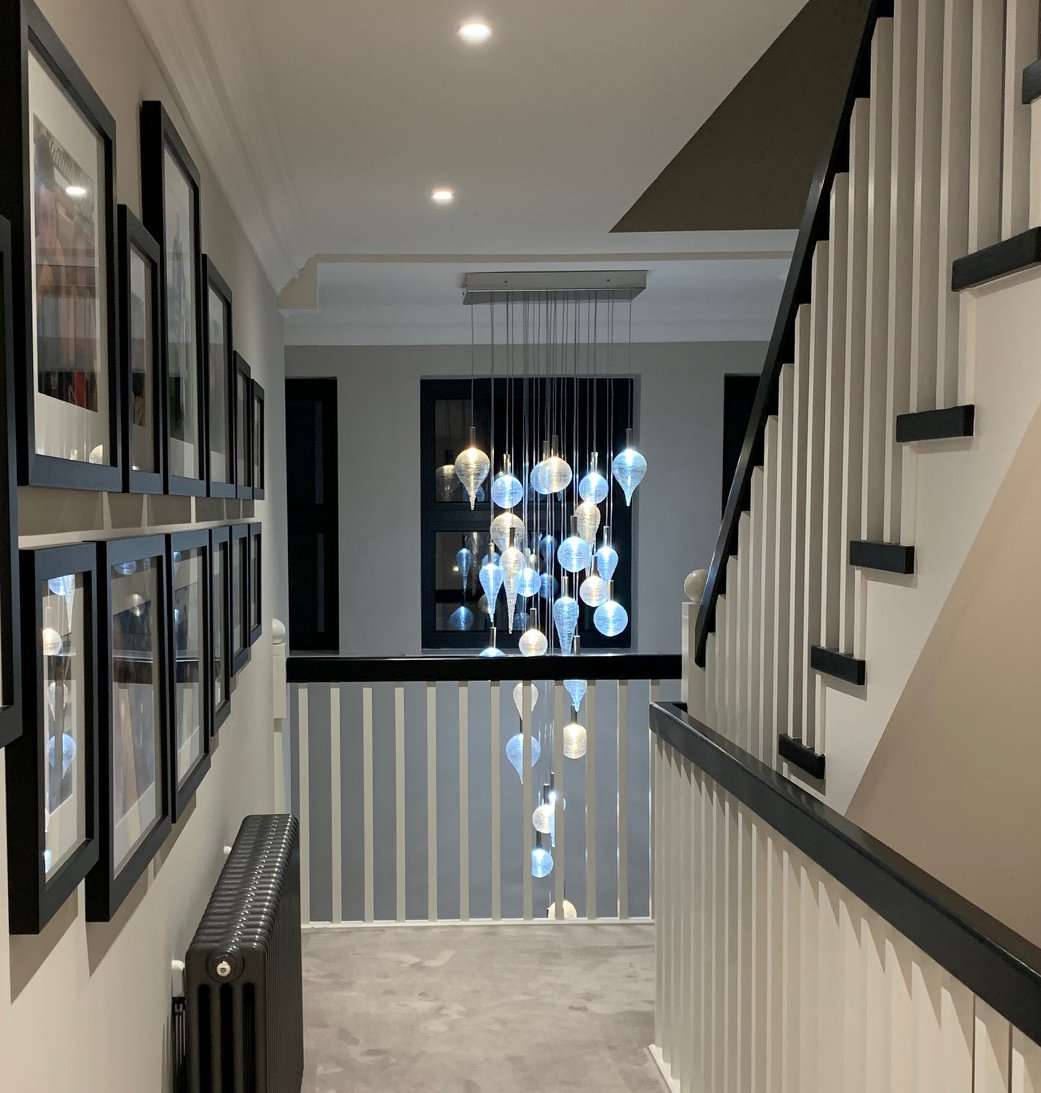 Within the space the eye is drawn to a majestic feature glass chandelier consisting of a glass globe surrounded by threaded glass which is styled to create the illusion of spun silk.