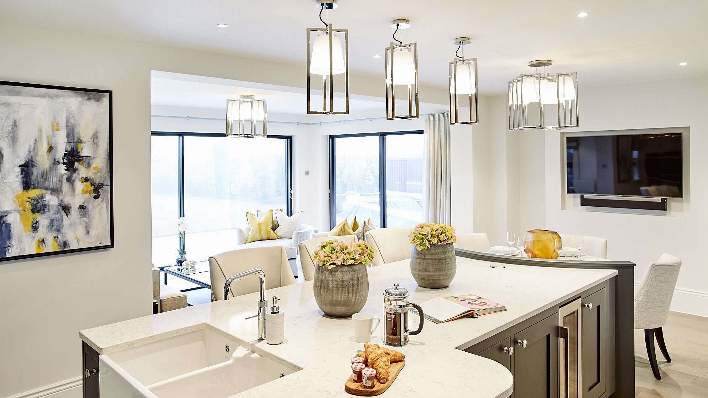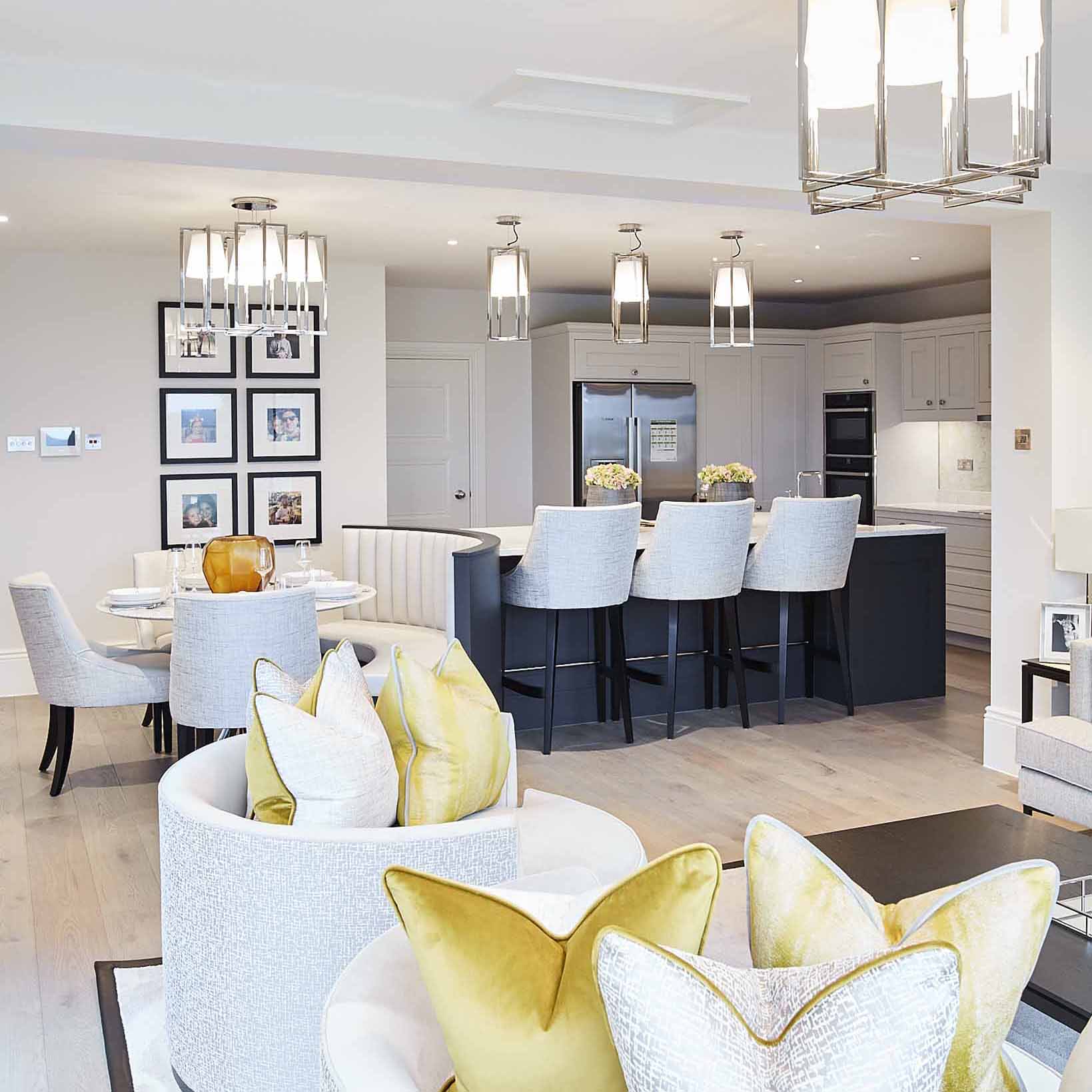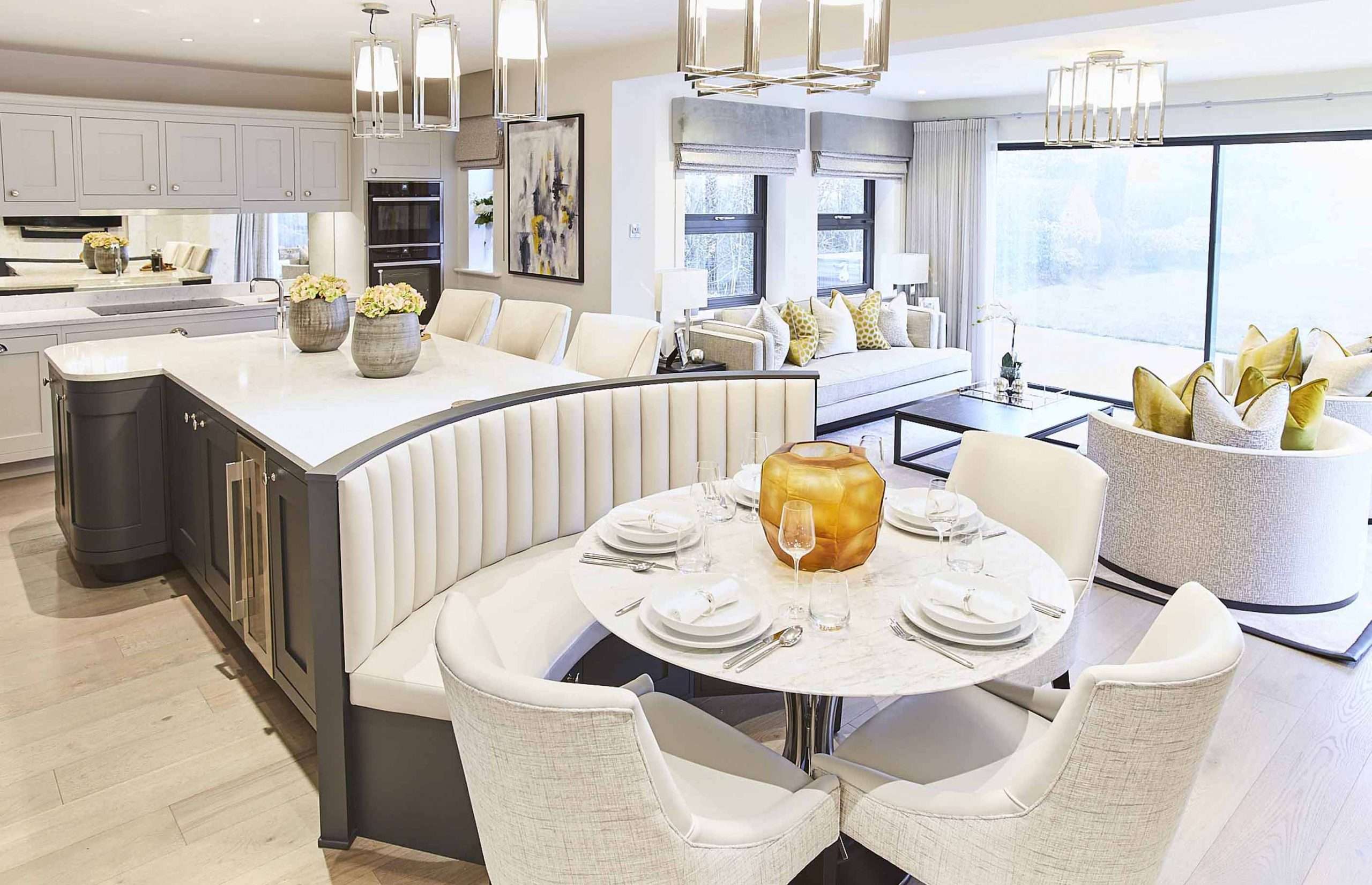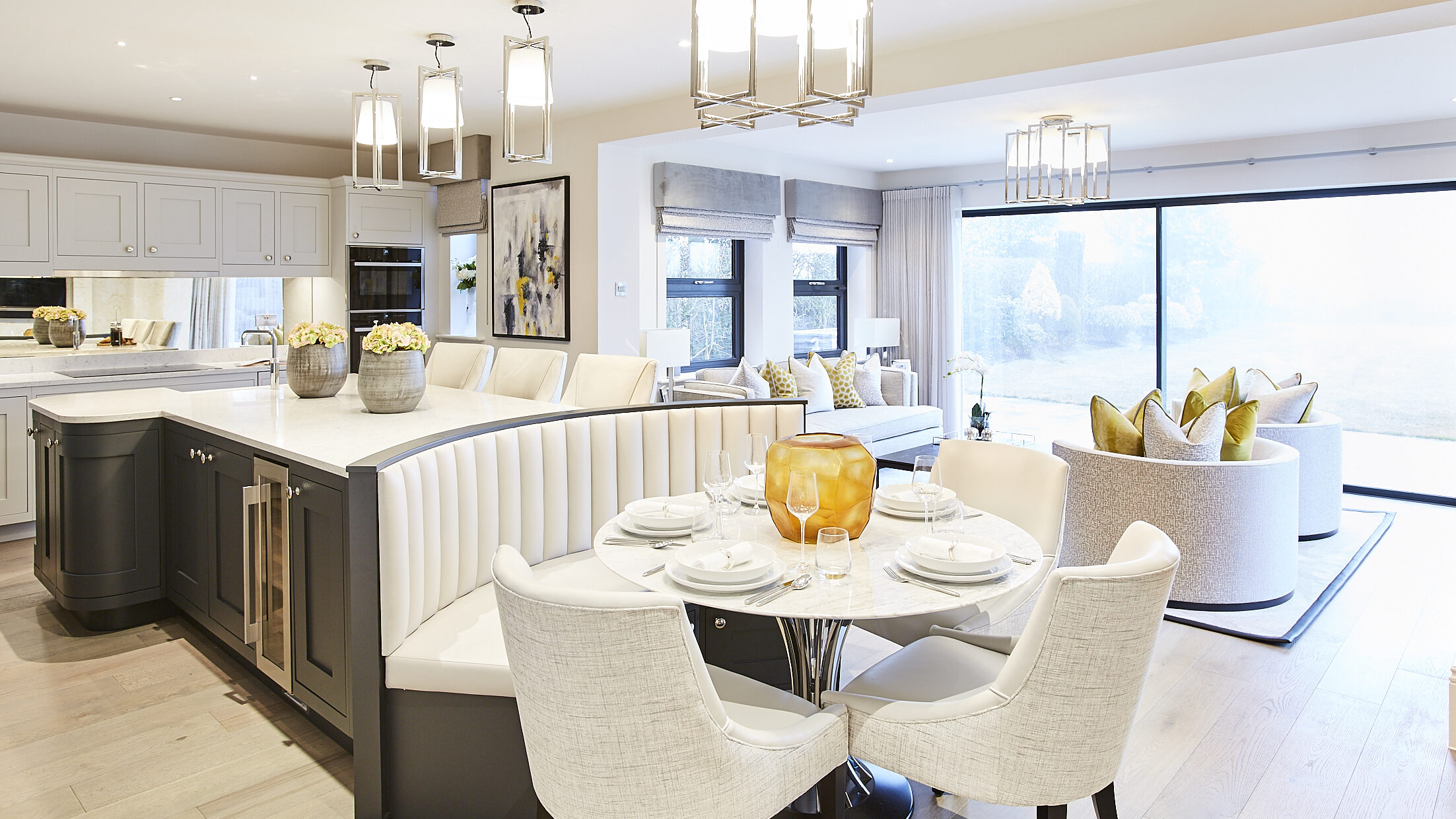 The statement kitchen is designed in a classic contemporary style with shaker style doors. In keeping with the family’s desire for informality the design incorporates a feature island and attractive curved booth seating which is perfect for family dining.