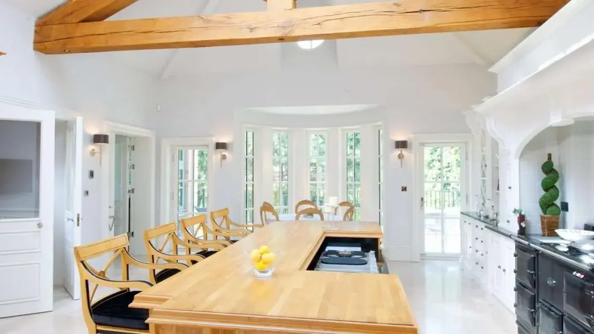 Considering the size and scale of the open spaces which are amplified in off-white neutral tones with white marble, the bespoke Clive Christian kitchen still sits well in an elegant country style with a natural wood finished island to compliment the striking oak beam centre-piece above.