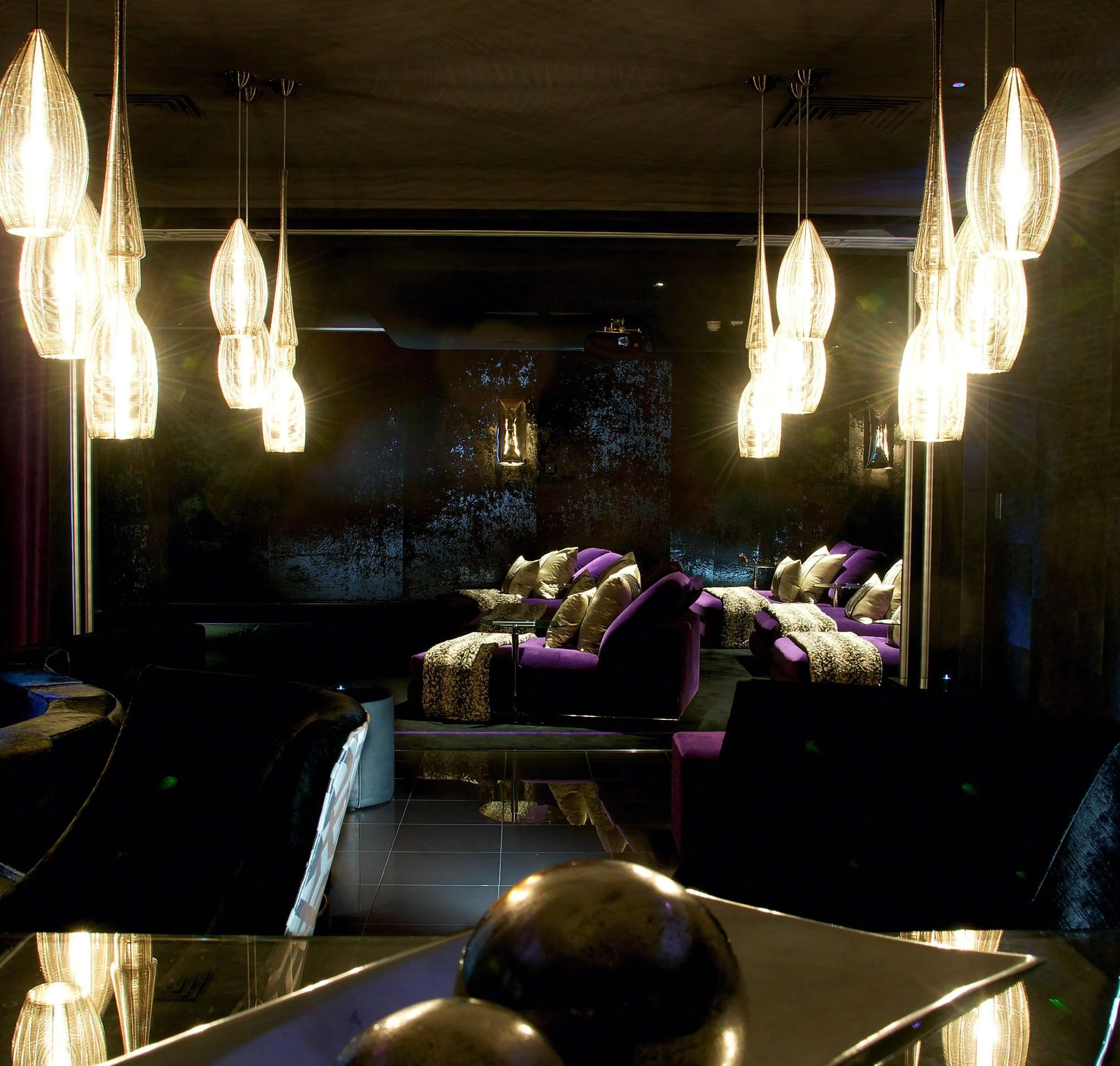 The lighting was reconfigured to provide striking Porta Romana wall lights that flanked the room whilst individual pin spots illuminated each of the lavish daybeds.