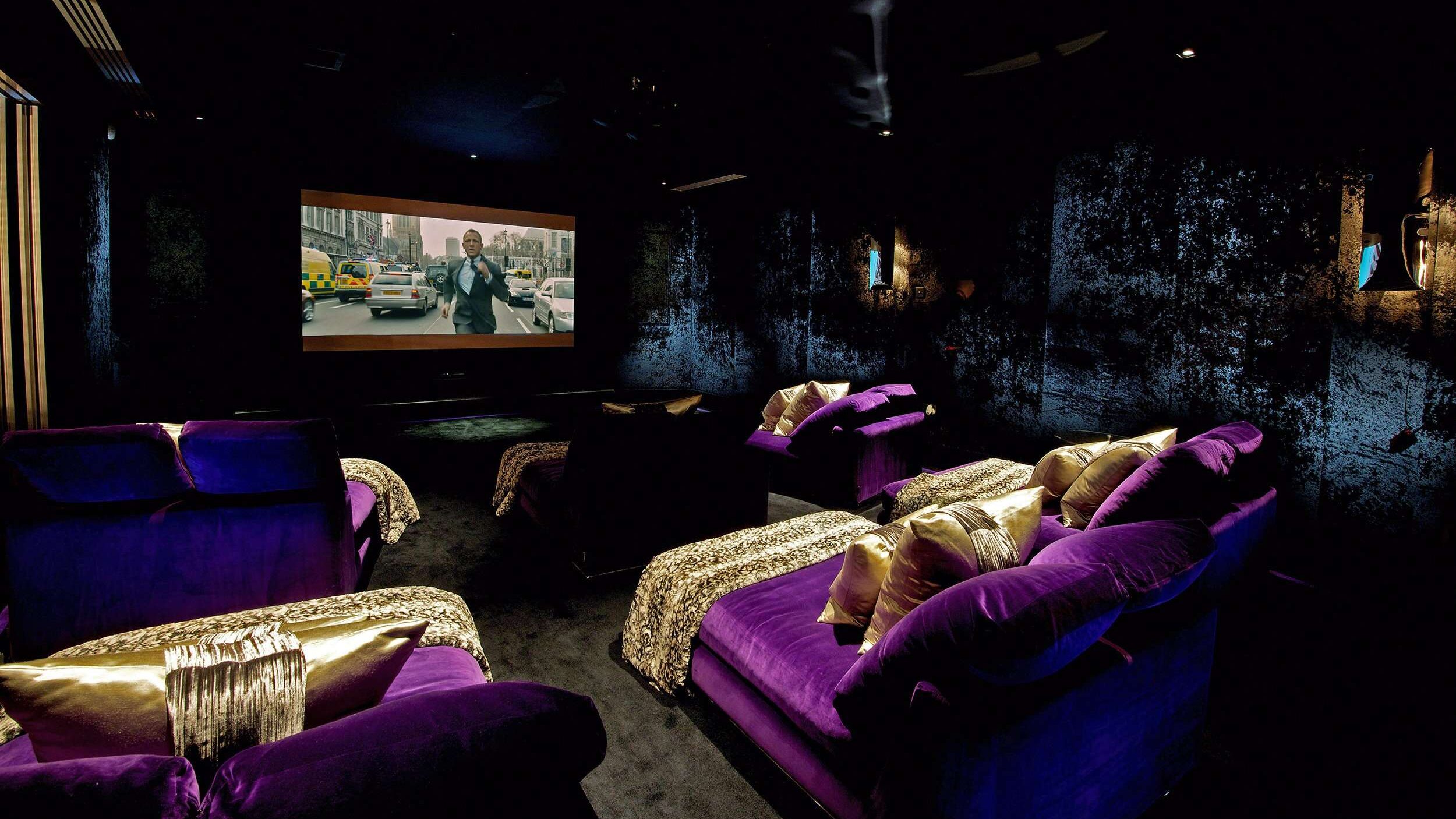 The walls to all of the cinema were upholstered in a black crushed velvet, stitched seamlessly around sockets and switches.