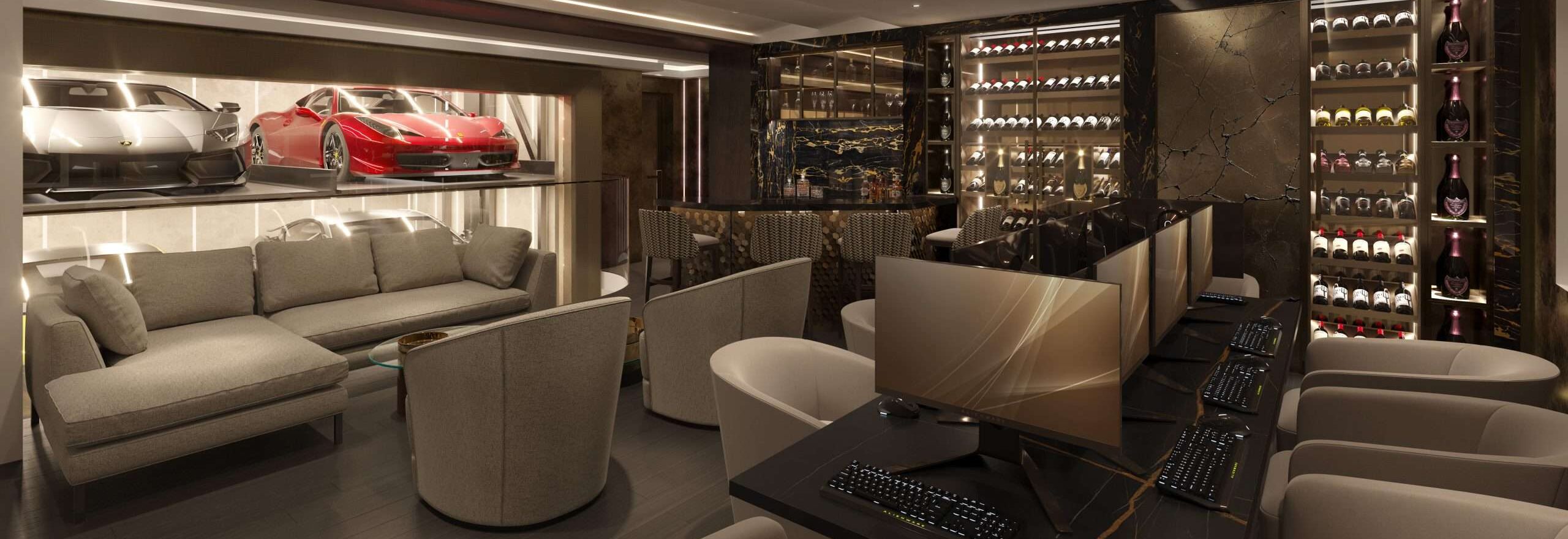 As well as designing a restaurant our client purchased a lakeside house to display part of his supercar collection. He briefed us to transform the interior to add some fun by injecting some wow-factor entertainment.