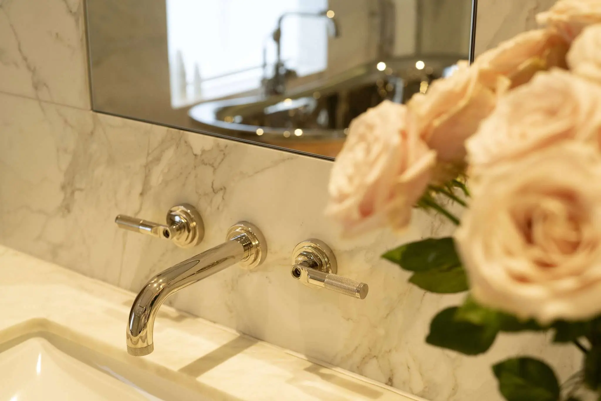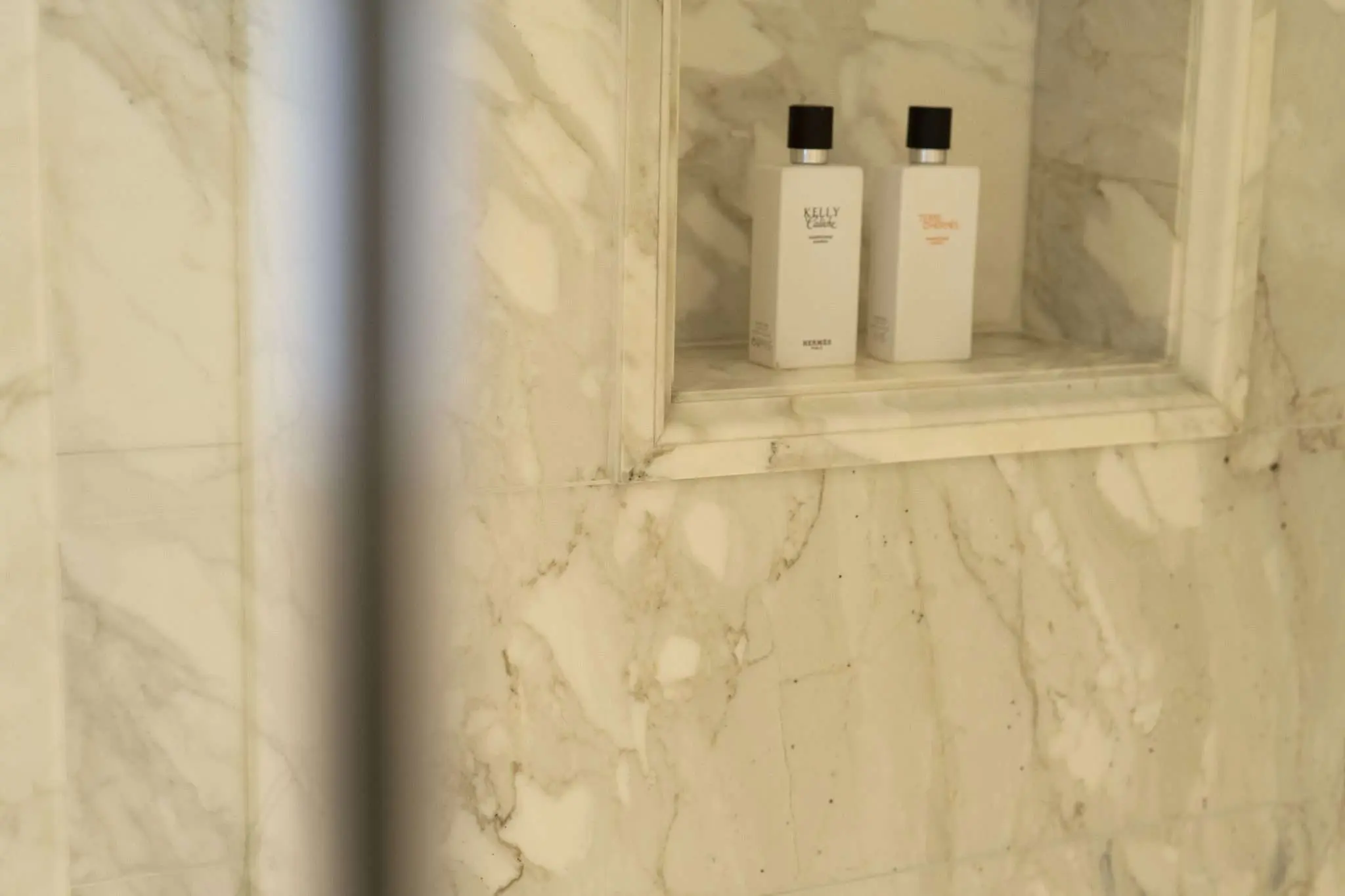 Large format book-matched marbles along with classic marble edging (see shower inlet detail) for indulgence and paired with warm timbers to the vanity achieve the desired elegant look and feel.