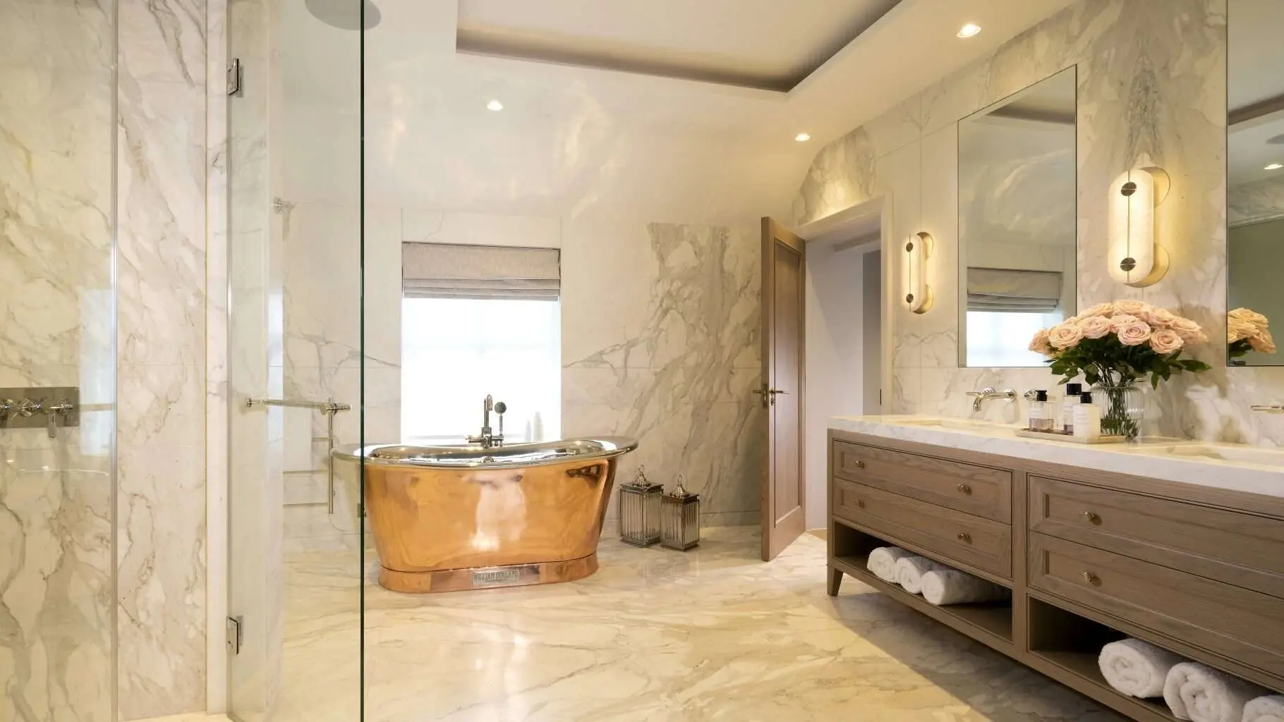 A large freestanding copper bath tub can’t help but take centre stage as it sits proudly beneath the bathroom window.