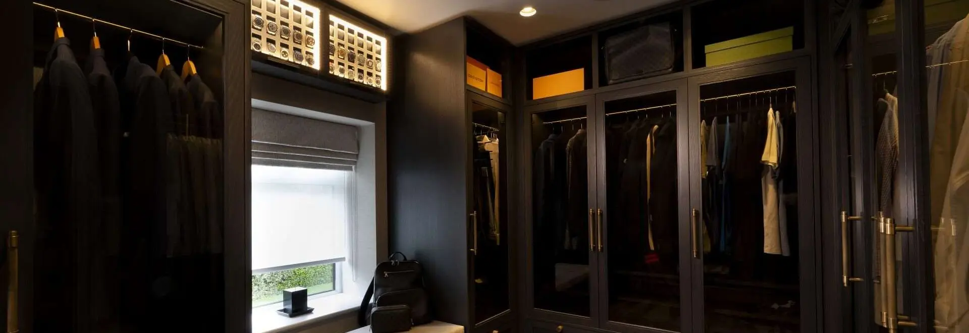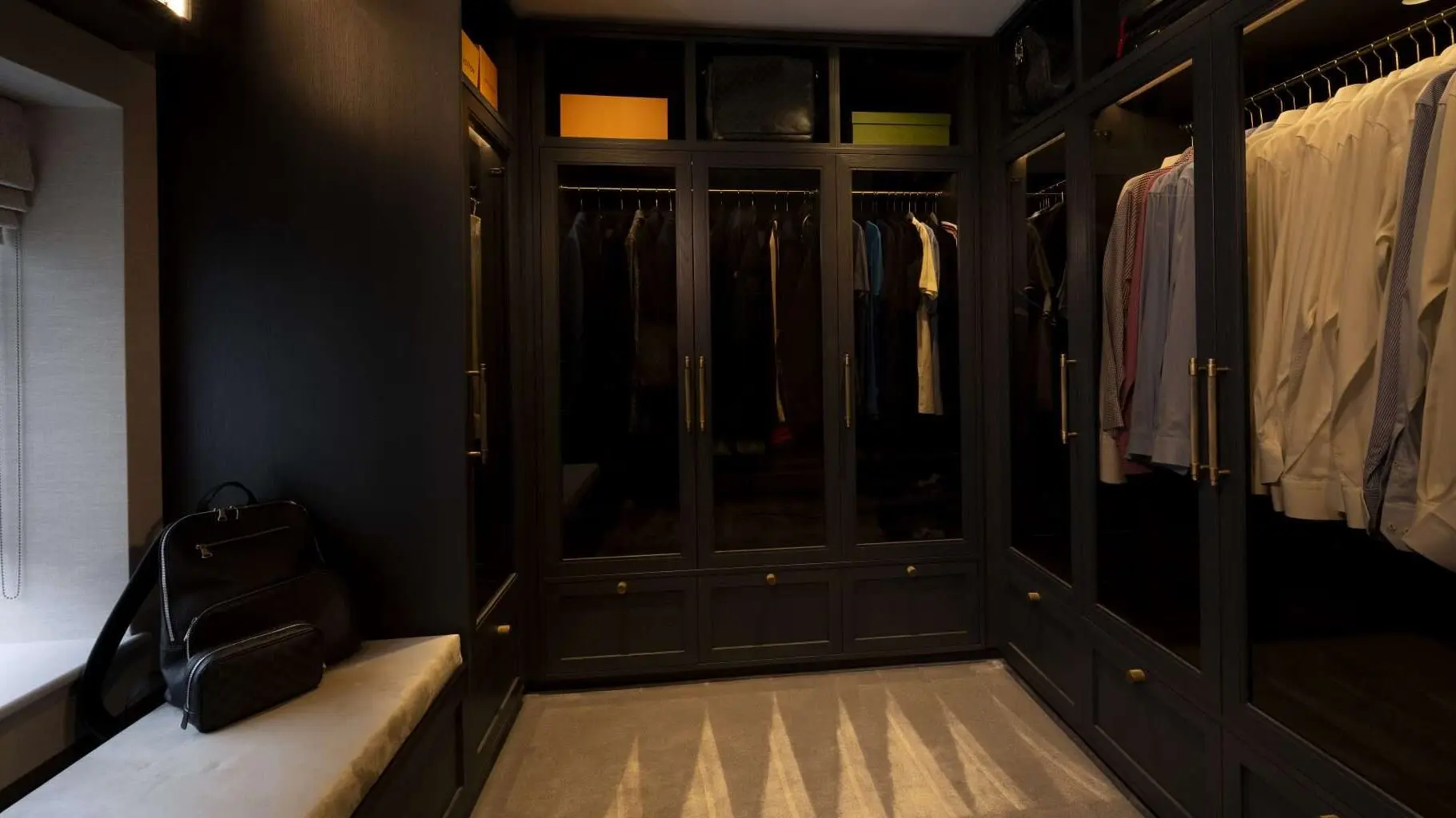 The overall scheme for our clients walk in dressing room is a dark and moody feel. Incorporating rich, dark, masculine tones and detailing to the joinery to add a sense of intrigue.