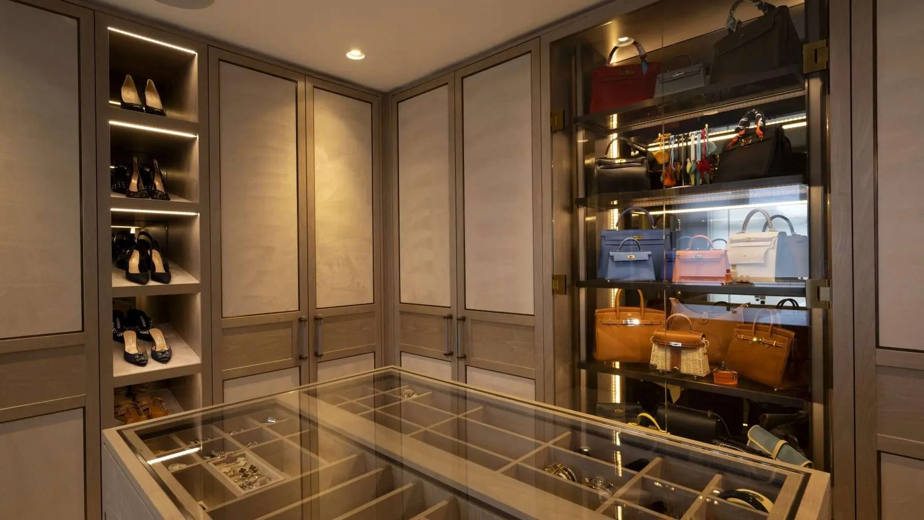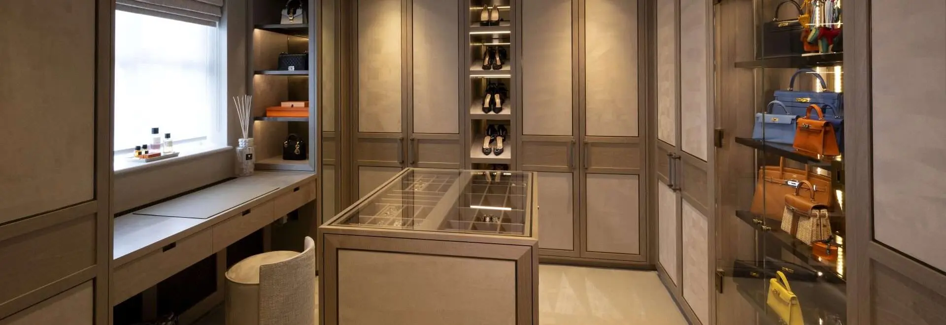 The timber framed central island with suede wrapped panels, bronze trims and recessed bronze pull handles was built for displaying our clients beautiful jewellery collection and accessories. The glass top reveals a glimpse of her extensive collection.