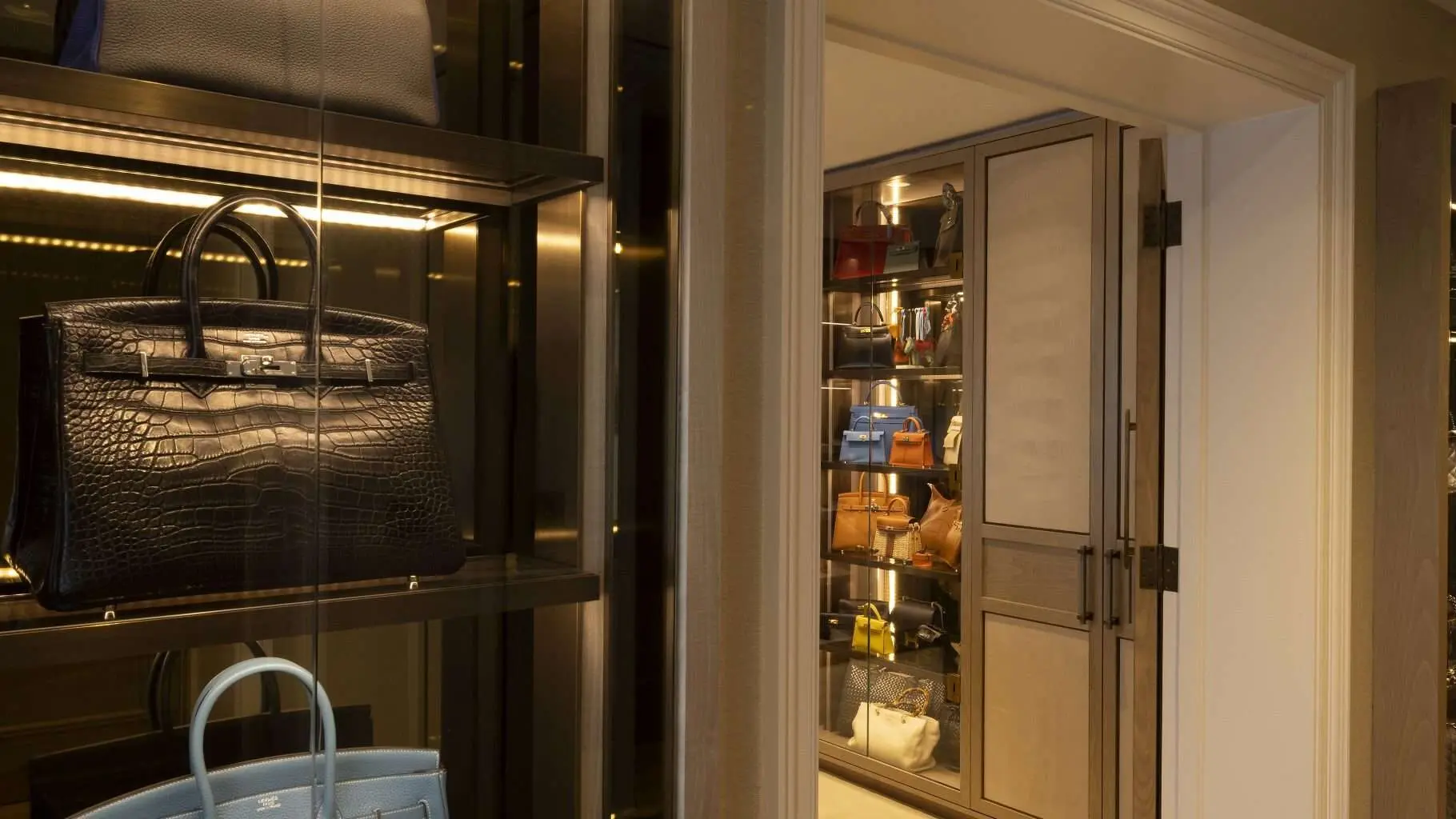 A key part of designing dressing rooms for our clients is understanding their requirements, knowing how much storage and display capacity is needed. In this case, our client had the most beautiful collection of designer handbags and shoes, so we designed bespoke cabinetry to include extensive timber and glass shelving with bronze framework and LED lighting strips to the undersides to highlight her favourite pieces.