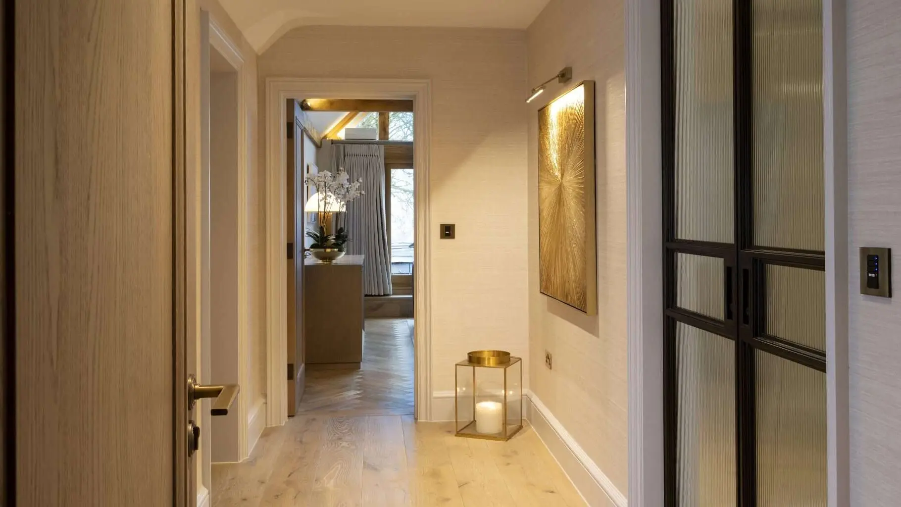The addition of fluted crittall pocket doors not only gives this room a sense of grandeur but it also opens up the space and draws light from the master suite entrance lobby.