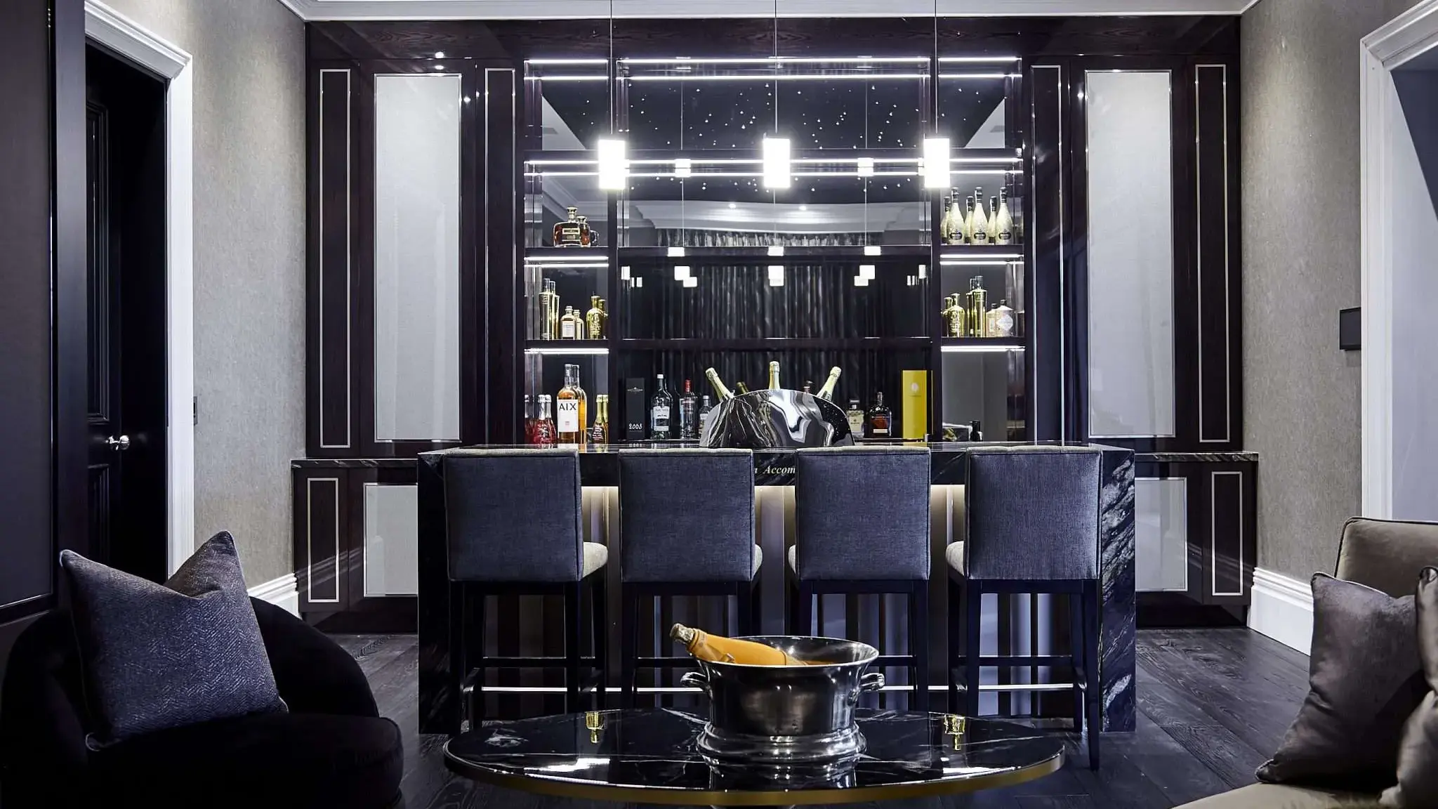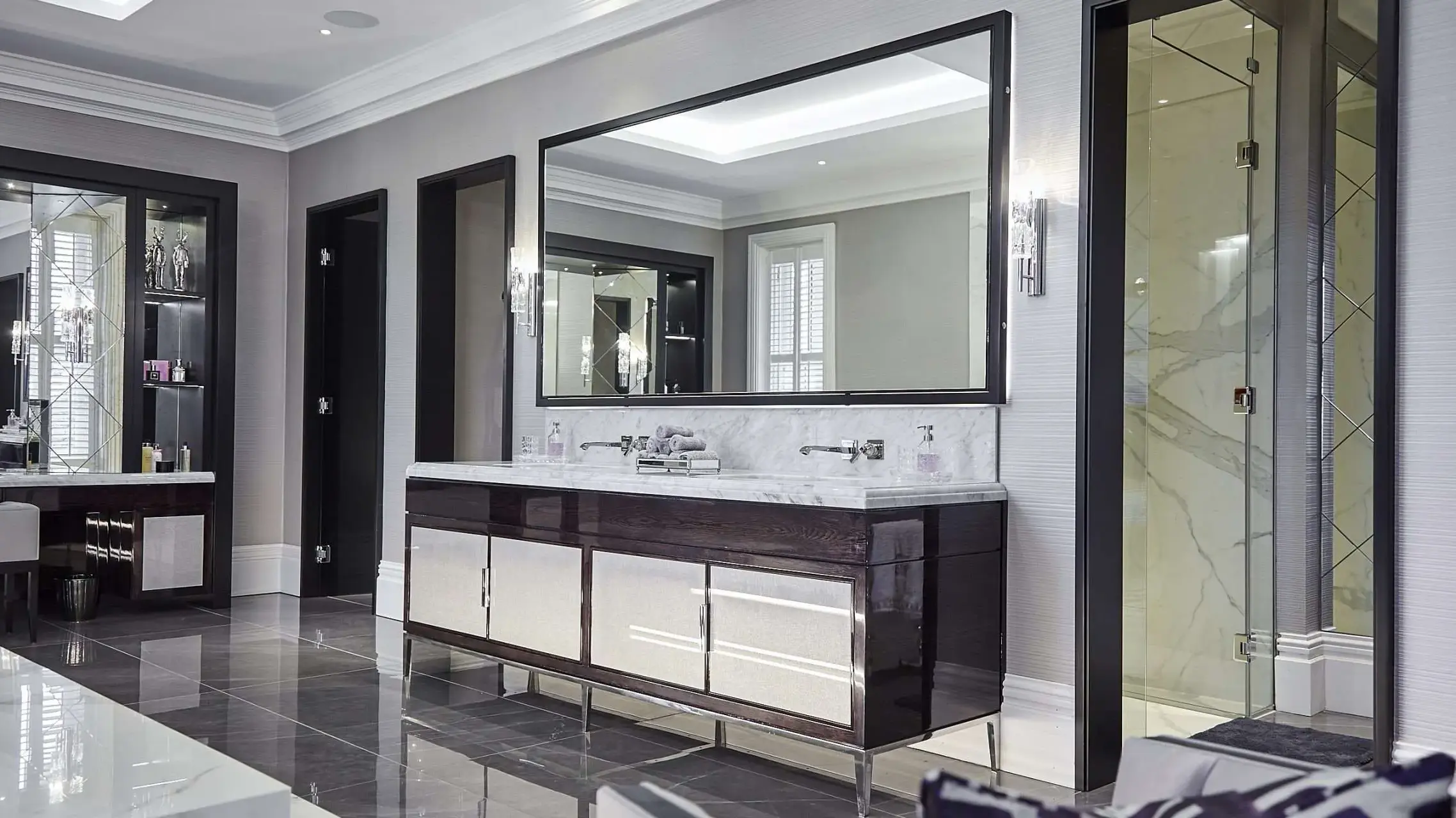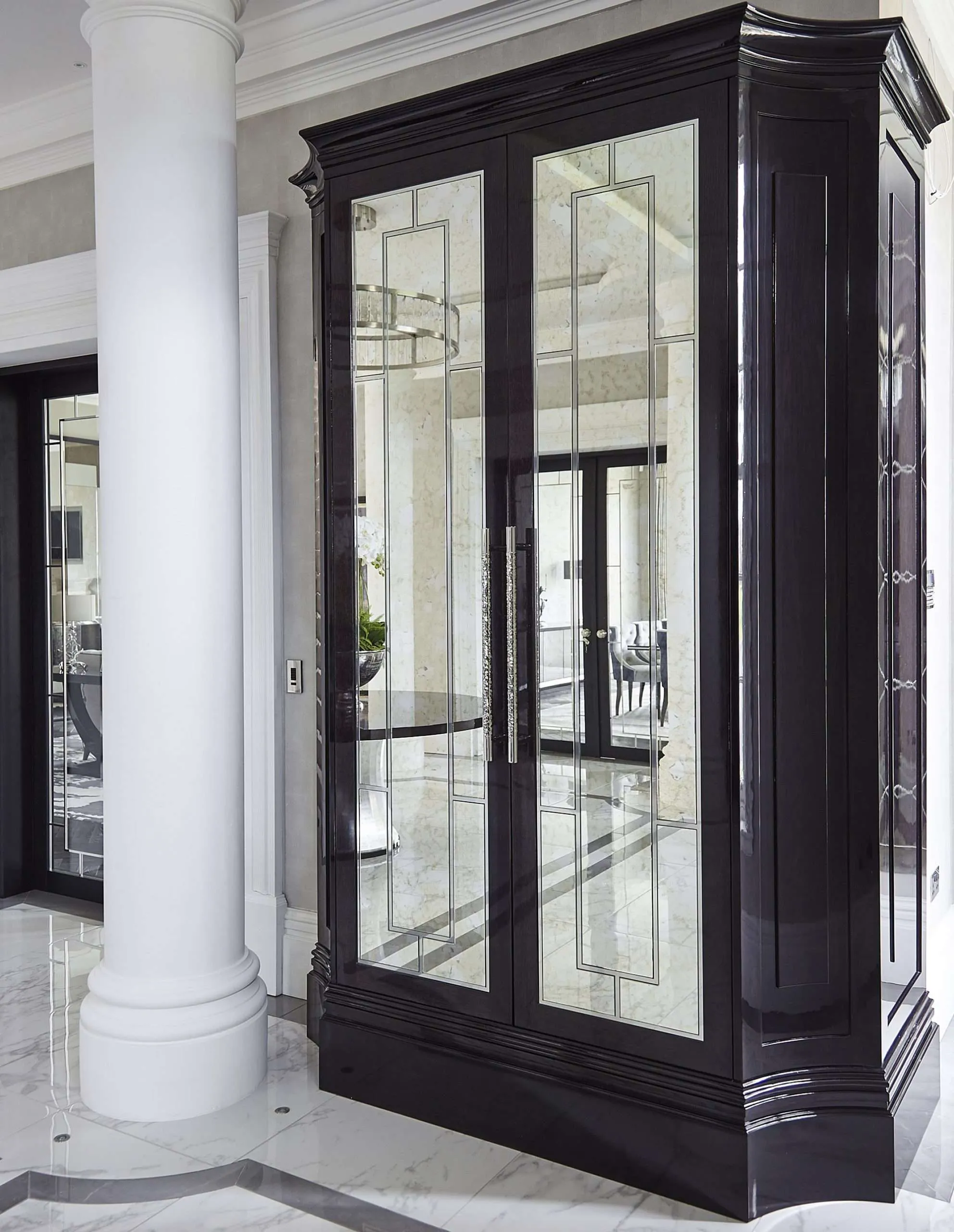 Diamond-cut eglomise mirrored panels complement the cabinetry and the overall effect is to offer an opulent and luxurious tone.