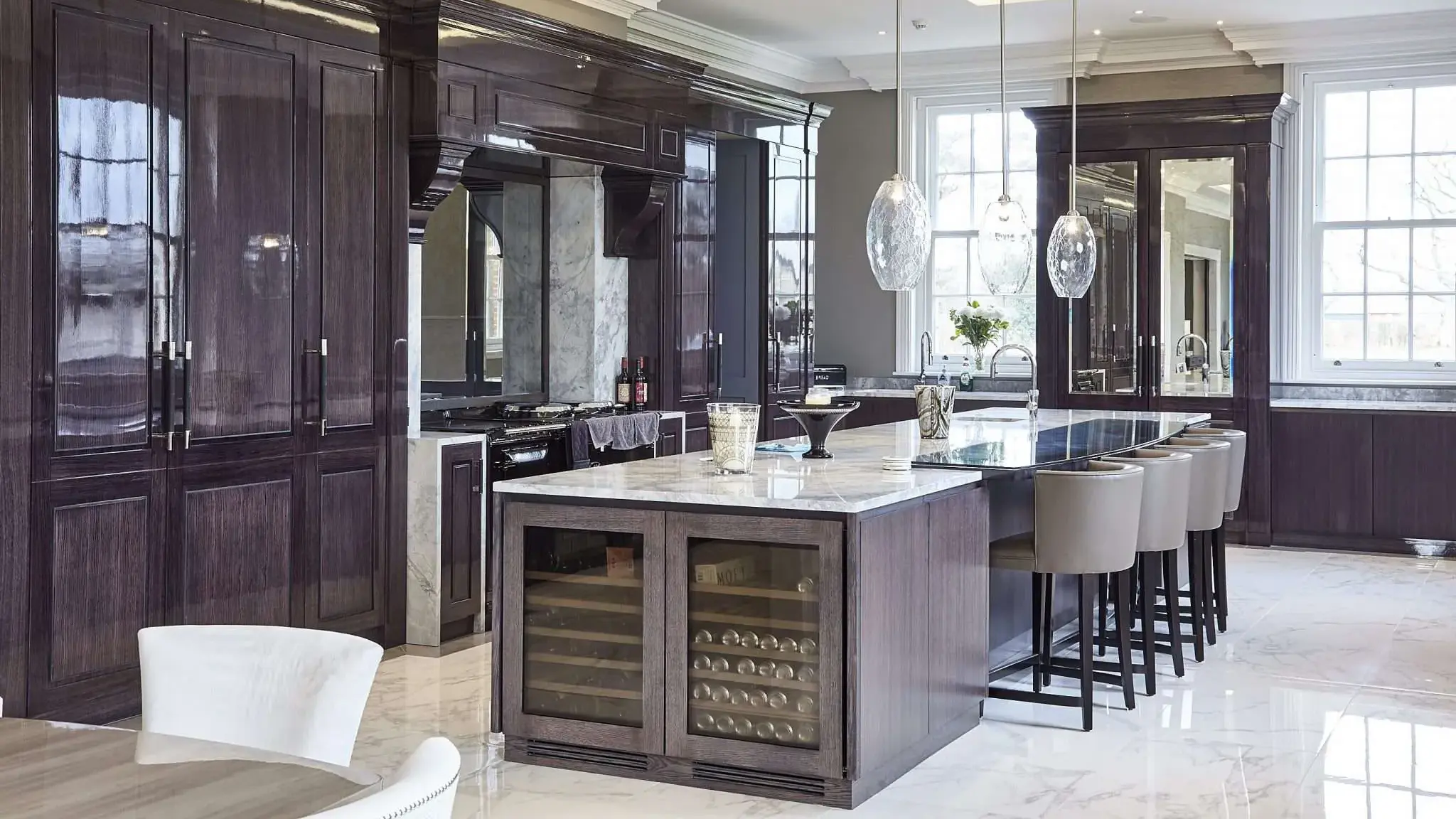 Floor to ceiling units in a dark chocolate stained oak with a super high gloss finish wrap two of the walls.