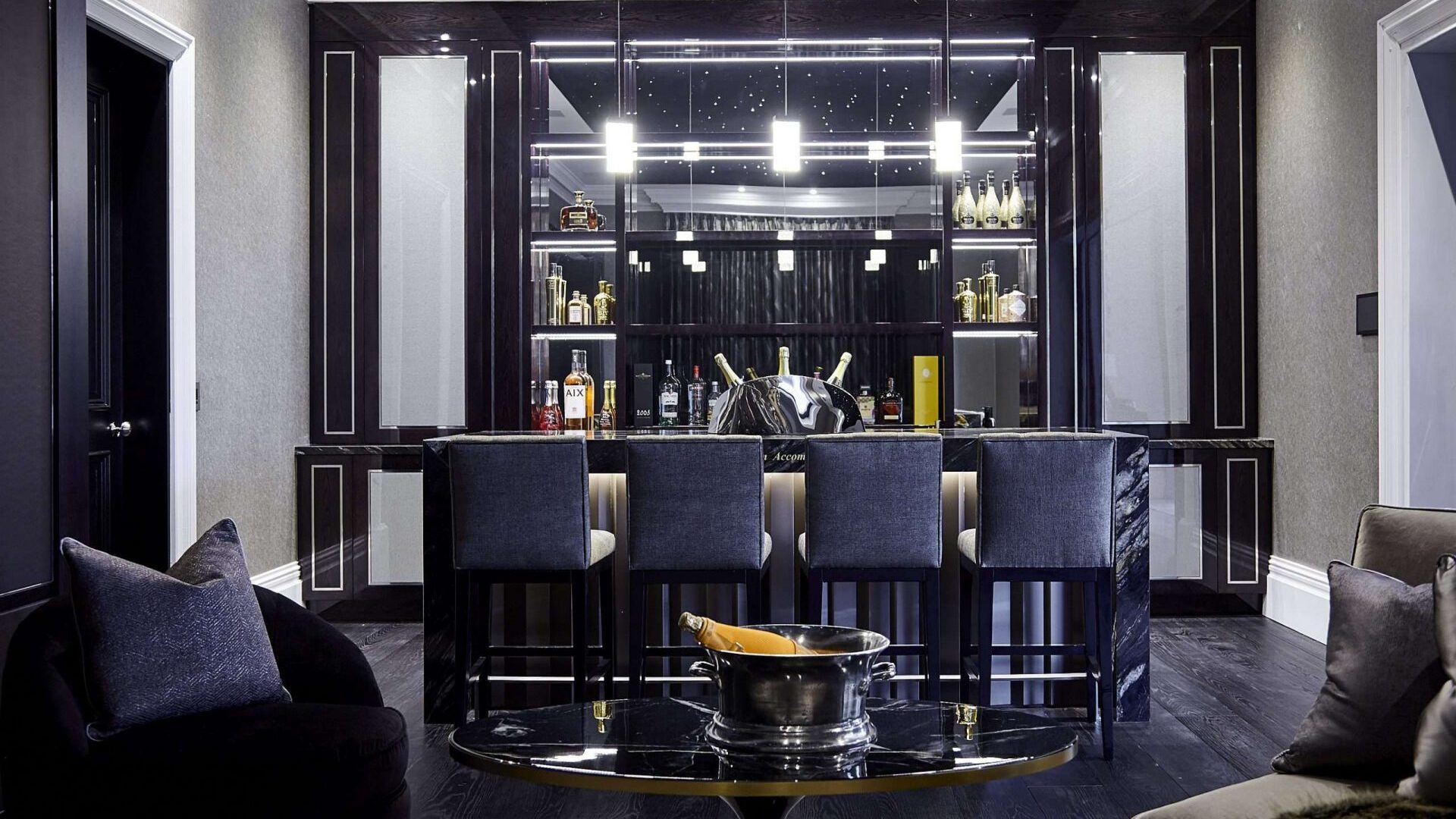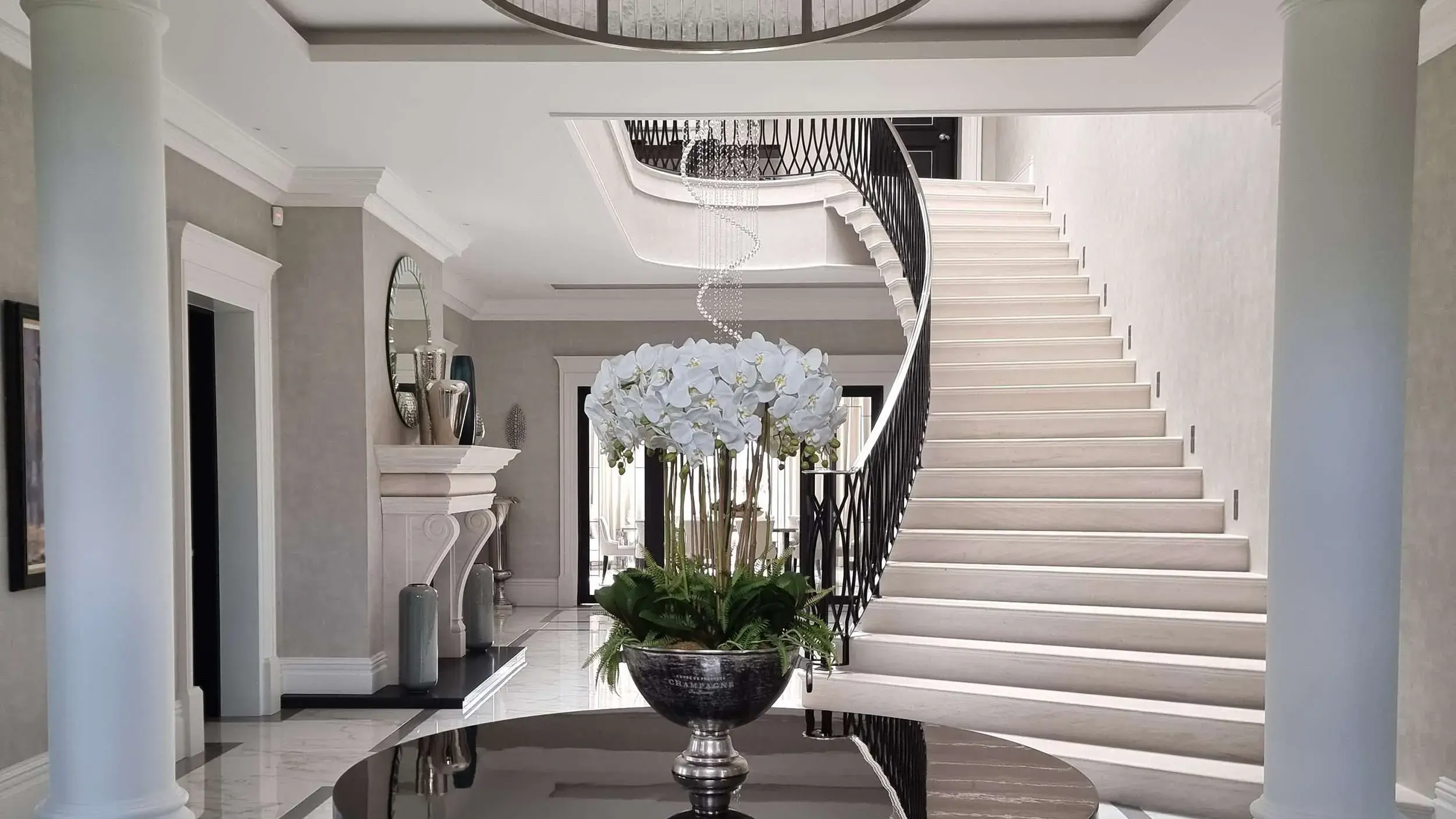 Sitting above the three floors of this wonderful staircase sits a stunning glass dome we designed which radiates plenty of natural light through these floors. Cascading through the centre of each floor hangs a show stopping 9 meter chandelier which elegantly hangs from the glass dome in the roof of the property, spiralling down to the grand entrance lobby