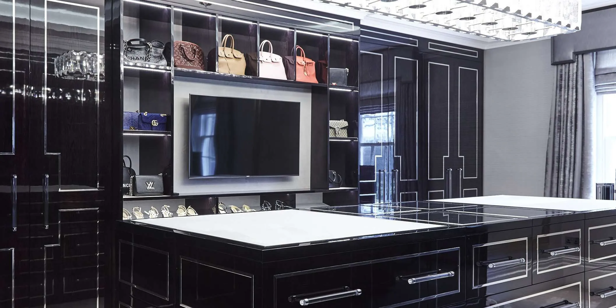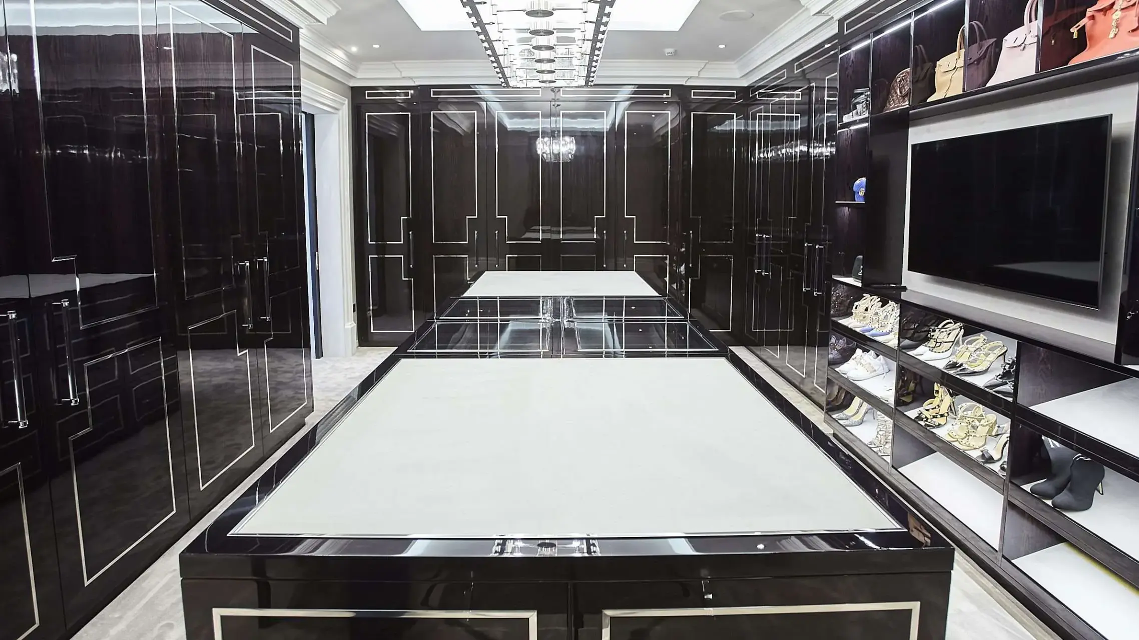 The master dressing room rivals the kitchen in terms of the scale of the cabinetry specification. It is arranged with almost 360-degree storage and display units as well as a centre island.