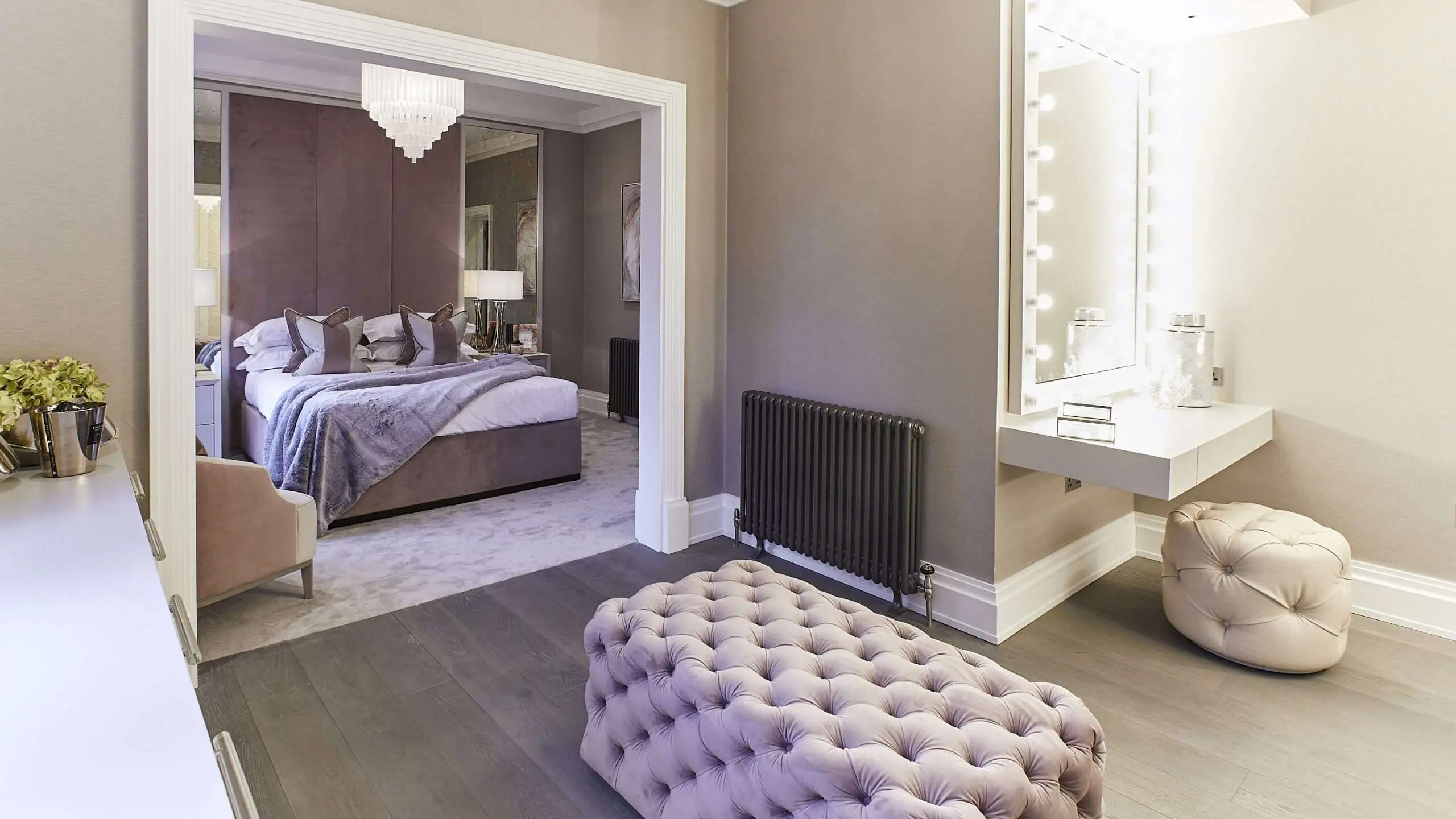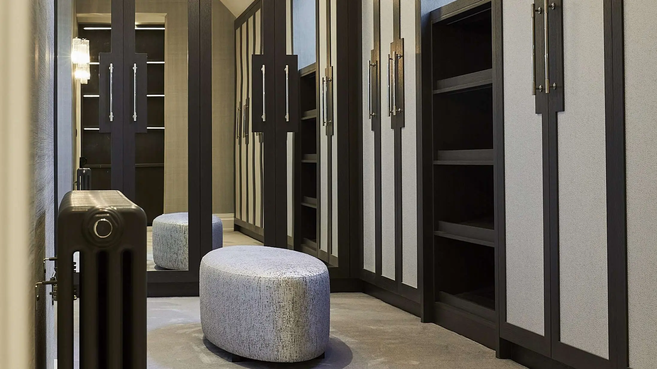 The master dressing room continues the theme of understated sophistication with bespoke cabinetry throughout and a central display island with a feature chandelier.