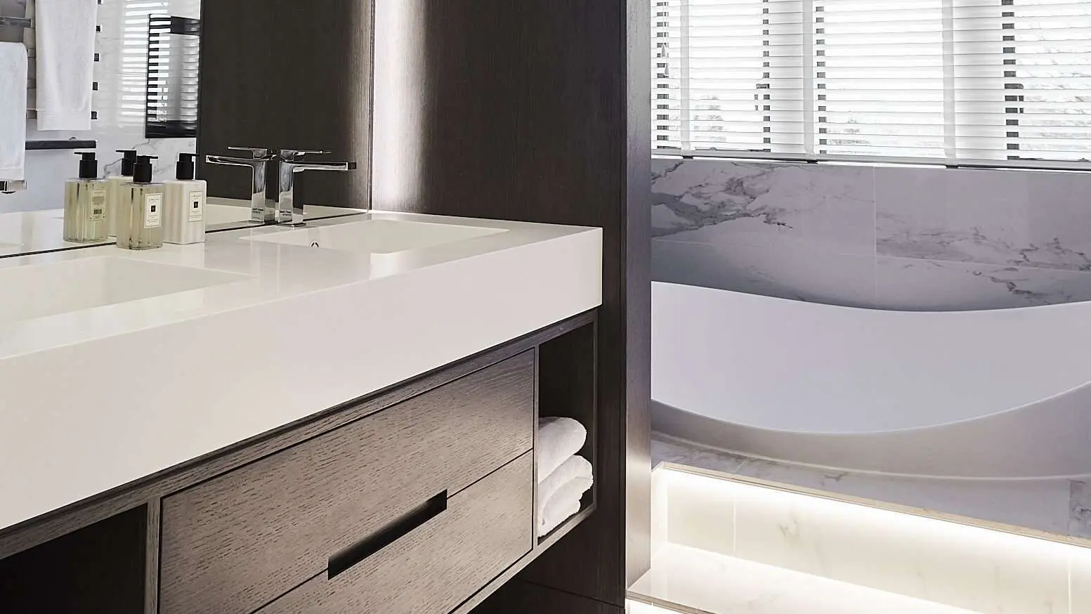 Crafting a style that is smooth and seamless, the tile also wraps the top and sides of the vanity units. A feature wall of book-matched marble adds a dash of mature glamour.