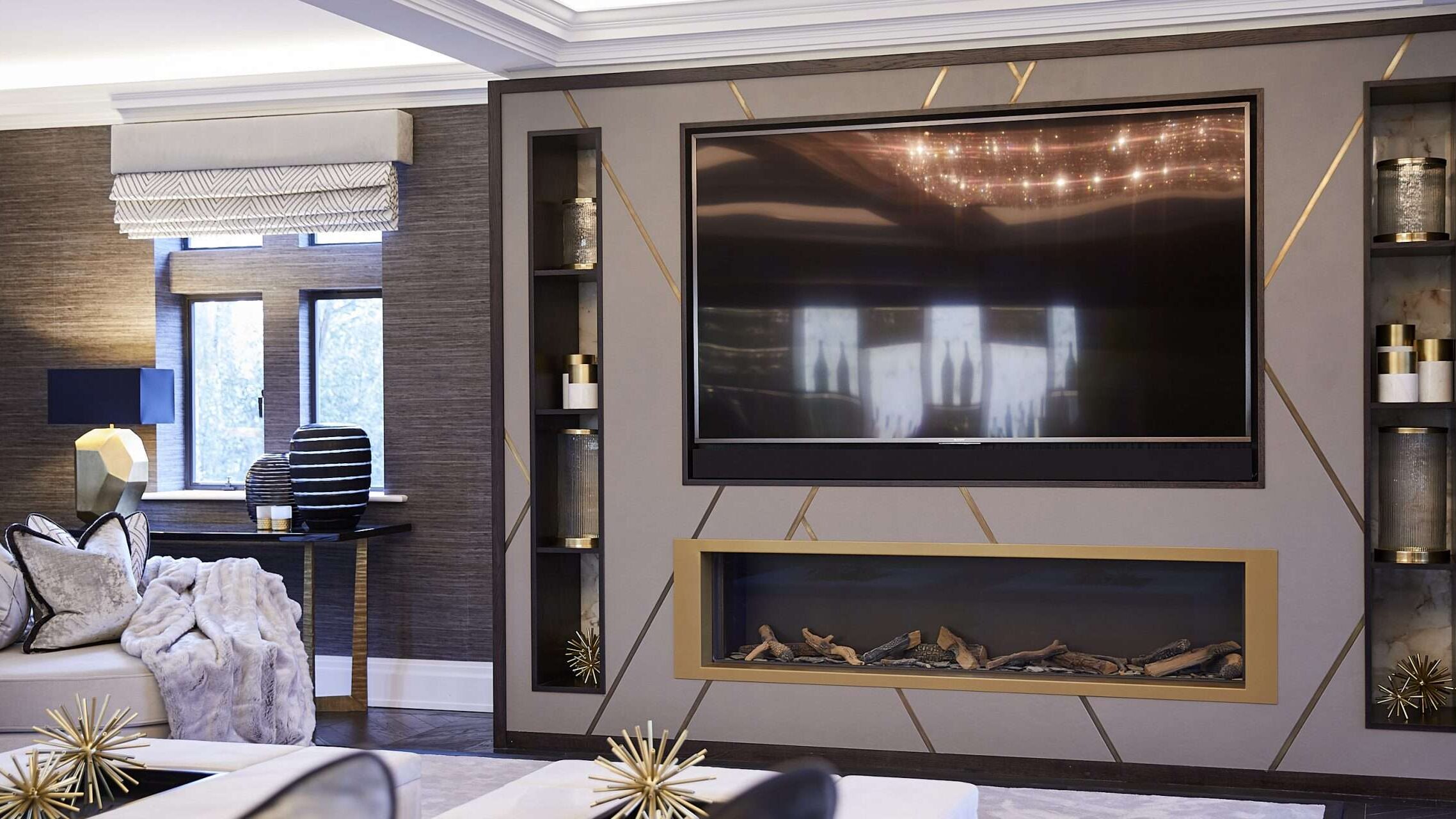 The oversized TV is positioned above the ribbon gas fire and niches on either side feature atmospheric backlit onyx panels.