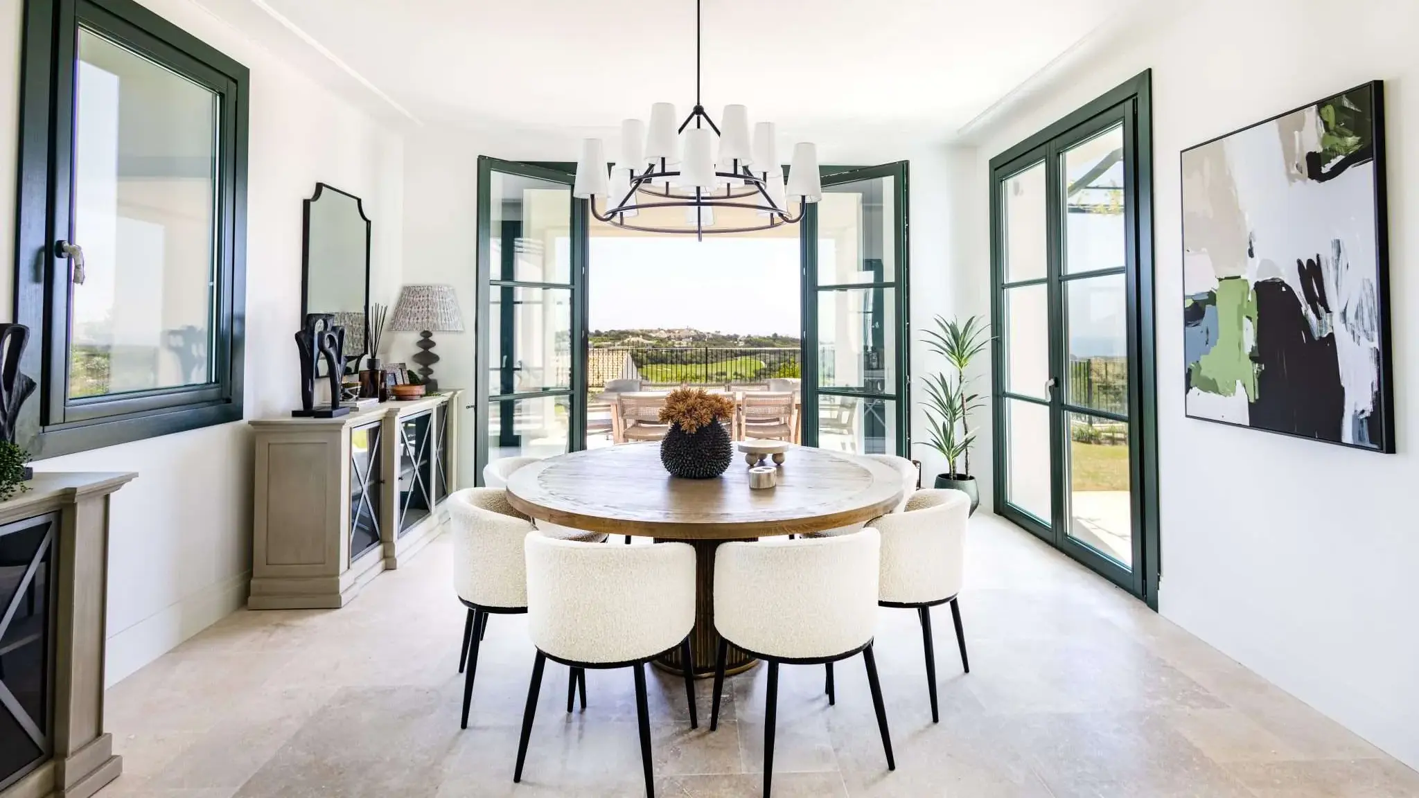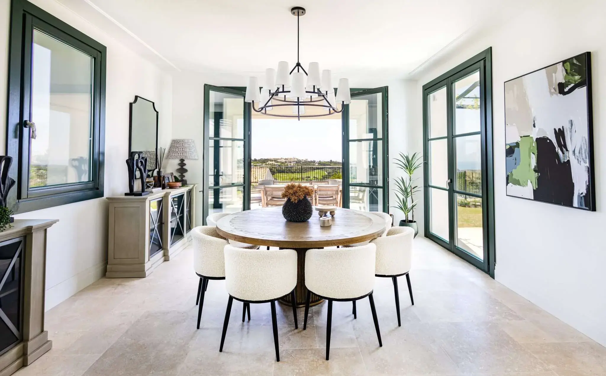 A large round table was incorporated to create a social setting, a perfect space for entertaining. We added boucle dining chairs to add a softness and two large sideboards with black metal detailing to tie in the rest of the aesthetic.