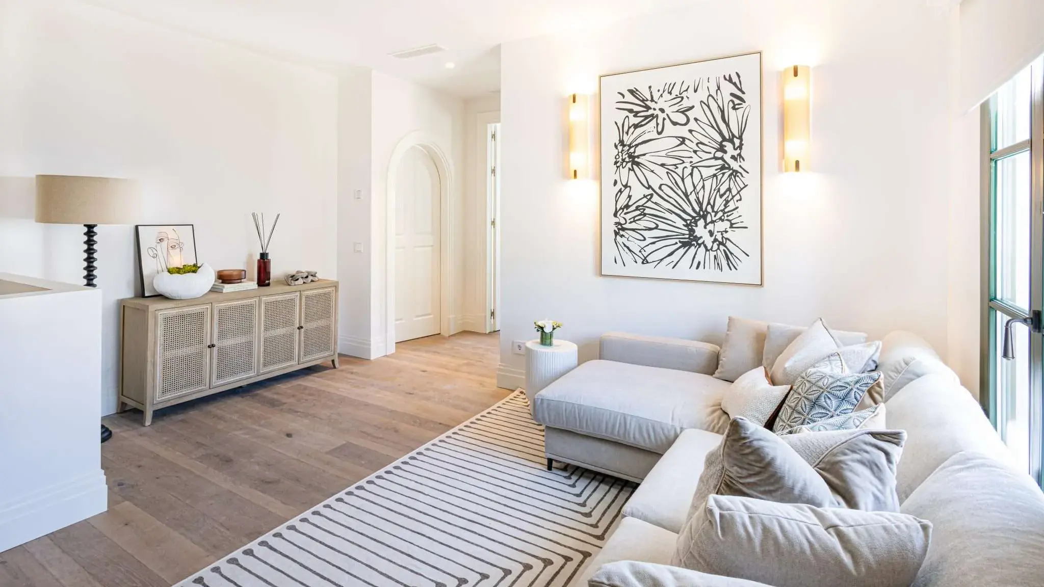 This space has a bit more of a playful feel to it, with the rattan sideboard complementing the raw oak flooring. The oversized floral artwork became the focal point to the room with cushions that match the floral design of the artwork.