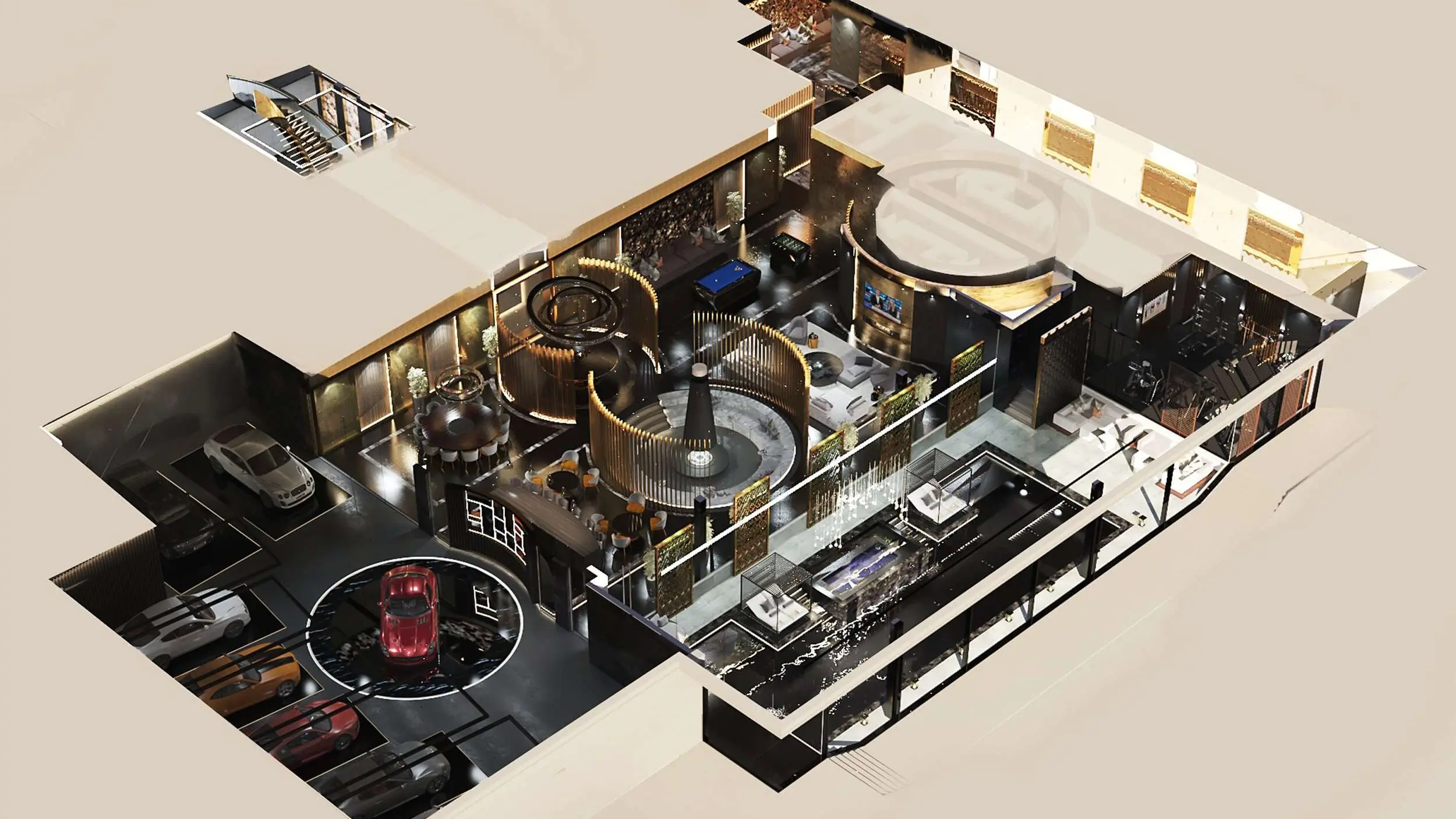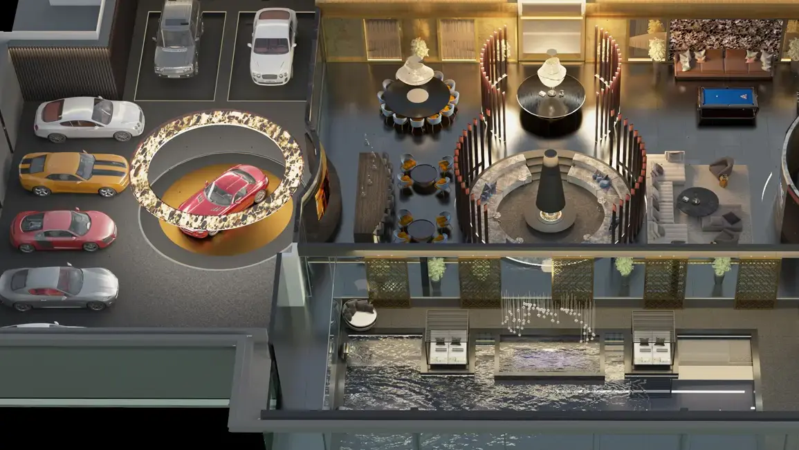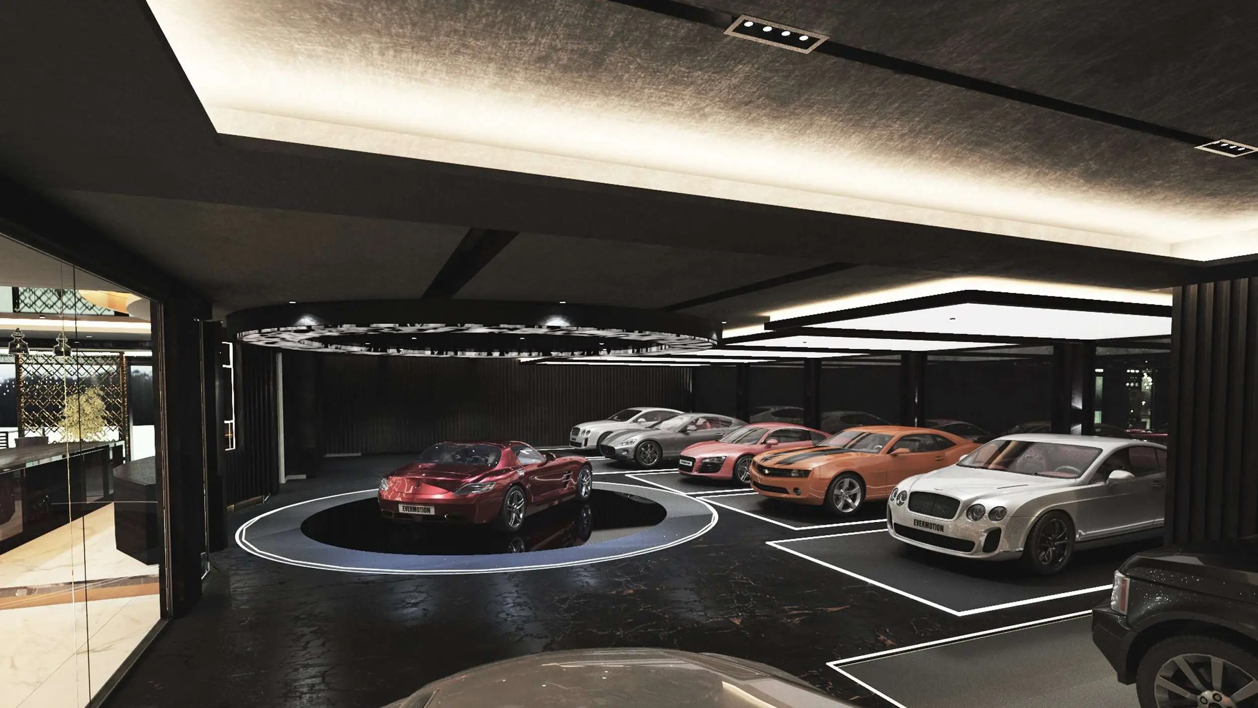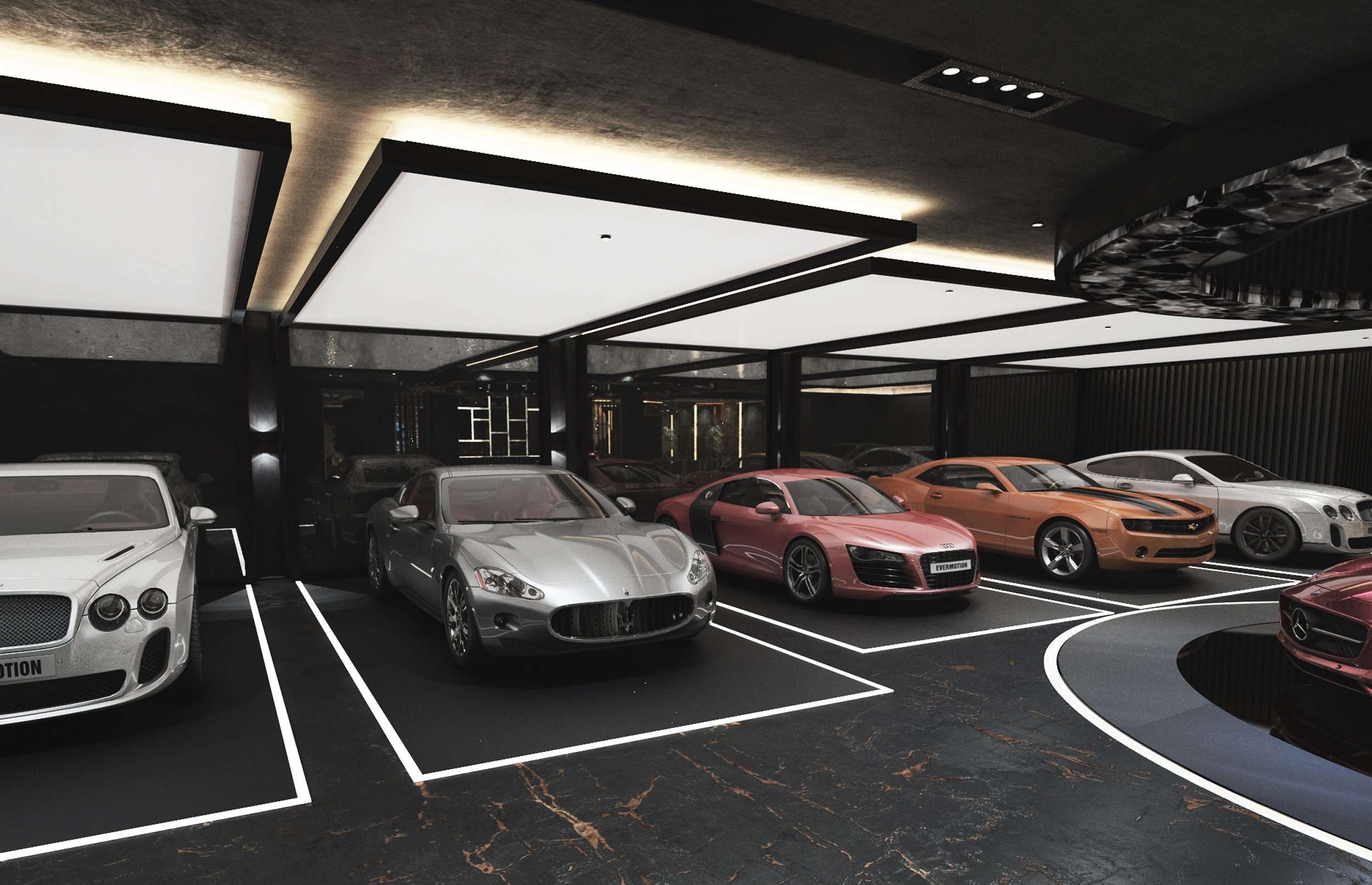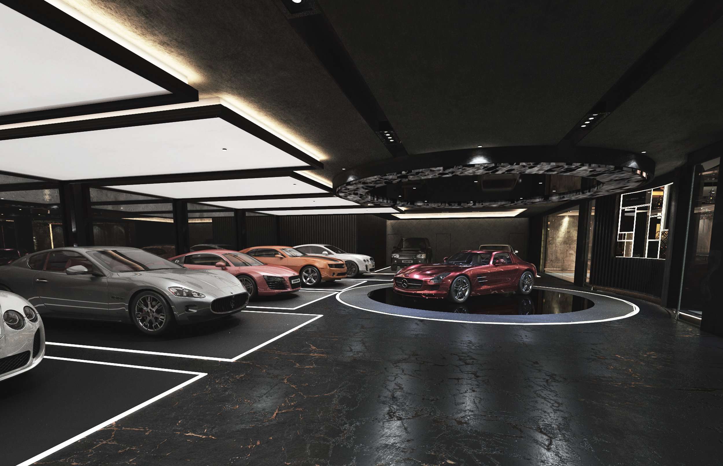 A sliding glass partition separates the main leisure area from the garage which offers space for the housing of several long-wheel base luxury cars. This is designed as a spectacular display space with the feel and specification often attributed to a luxury car showroom. A fully glazed wall from the entertainment area into the garage ensures a seamless flow between the two spaces, whilst the garage itself is designed to be vibrant and interactive.