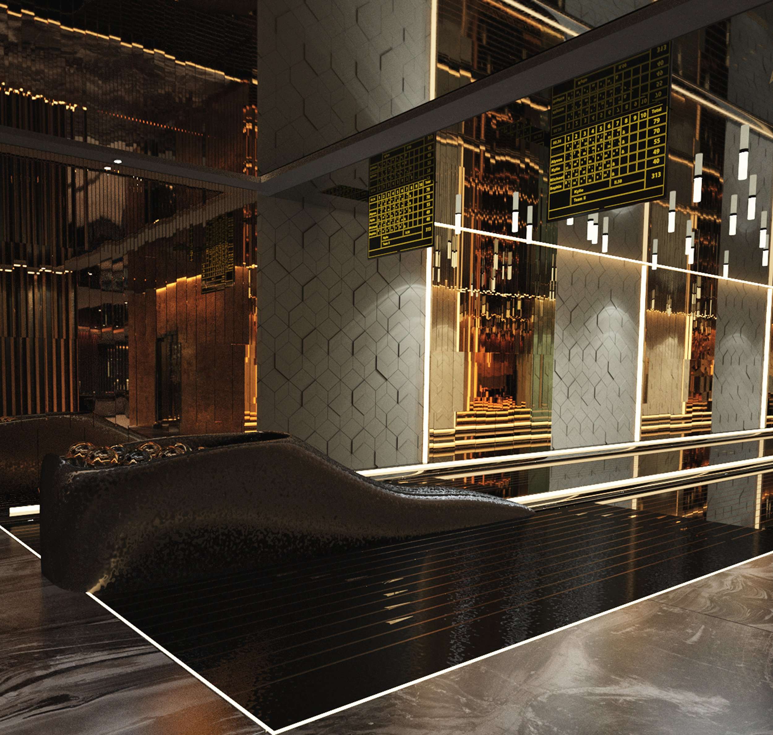 With geometric textured wall coverings, each step has perimeter illumination detailing which creates separate zonal sections, guiding the guest deeper into the subterranean experience with each step.
