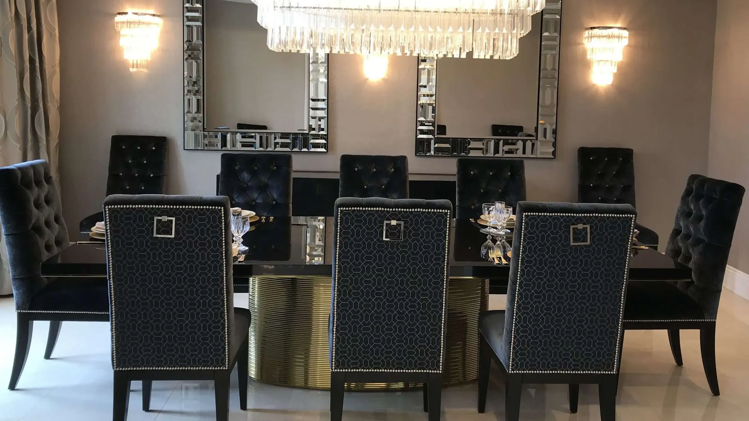 Bespoke finished dining chairs bring a bold identity to the dining room with it’s silk wallpaper and beautiful drapes, all finished and shipped by us in a seamless approach which is applied to all property installations abroad.